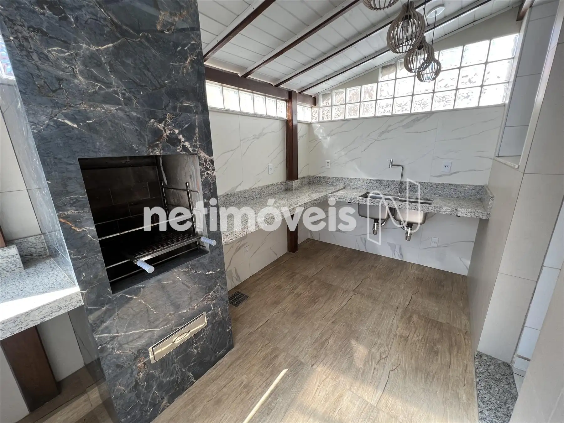 Área privativa externa com cozinha gourmet, piso em cerâmica, e churrasqueira.