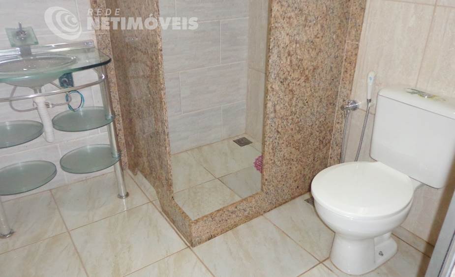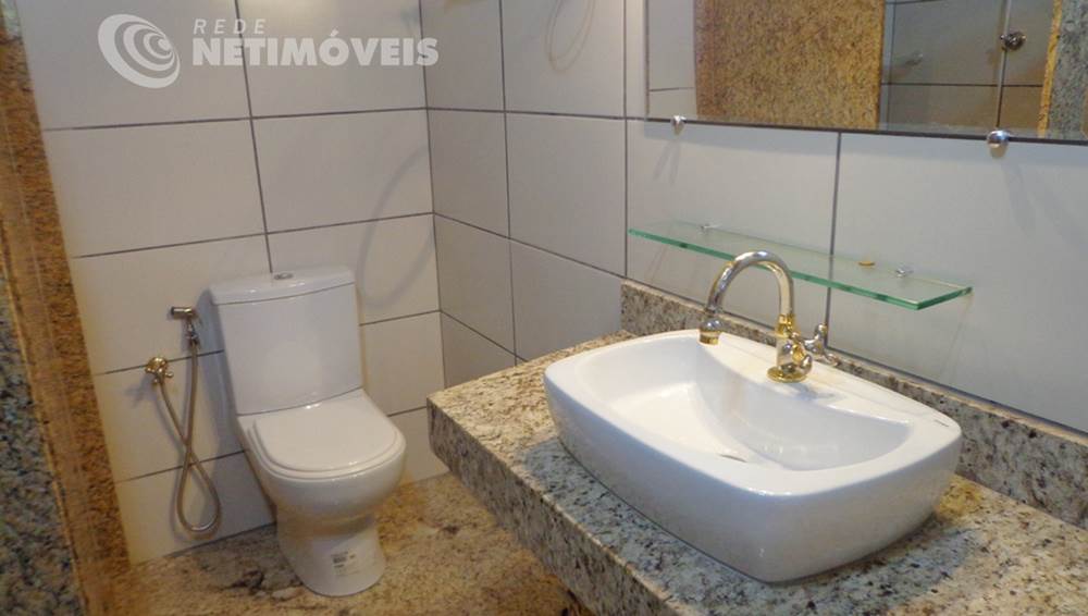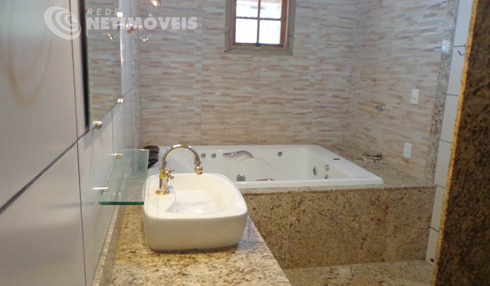 3 banhos, sendo sendo dois suítes e uma delas com banheira de hidromassagem, piso em porcelanato, bancada em granito, espelho e Box .
