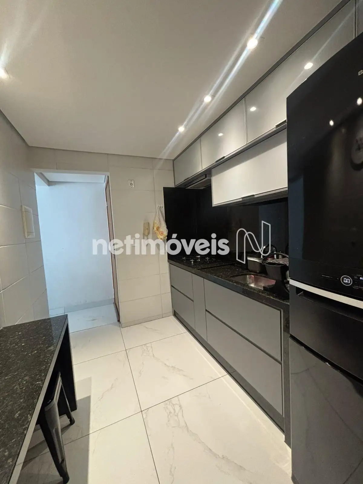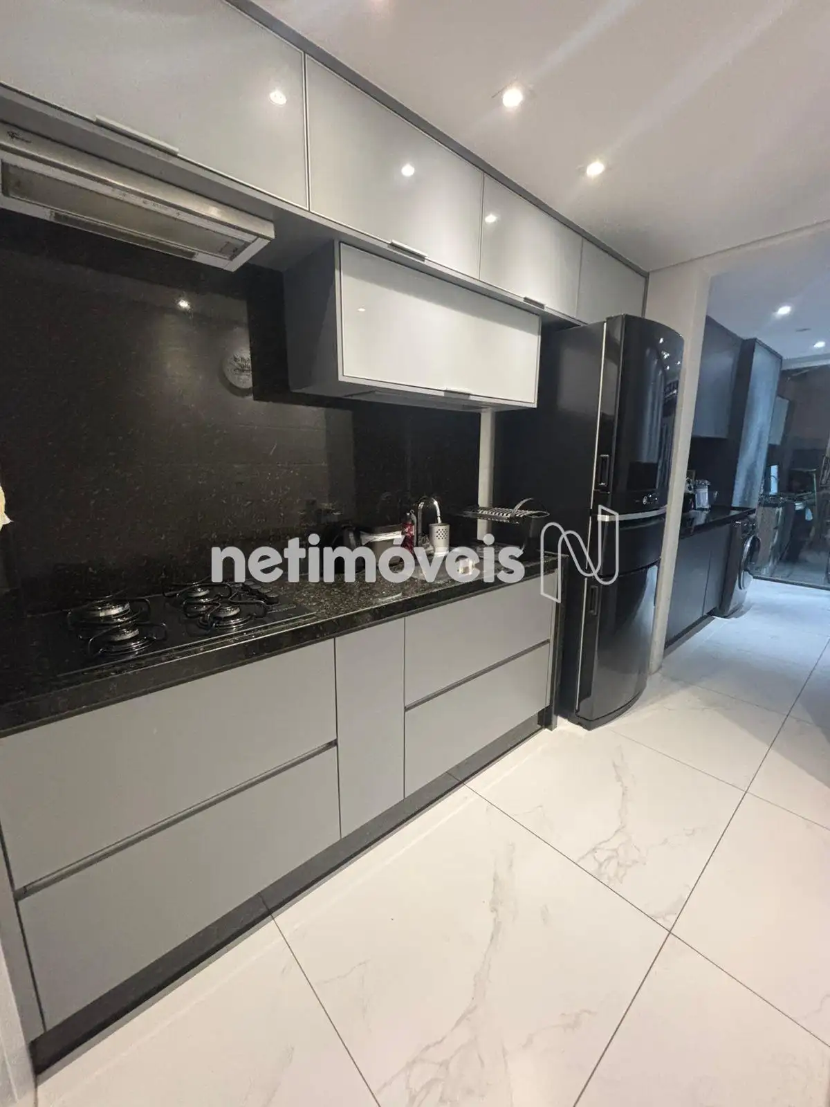Cozinha planejada, com muitos armários e bancadas em granito.
