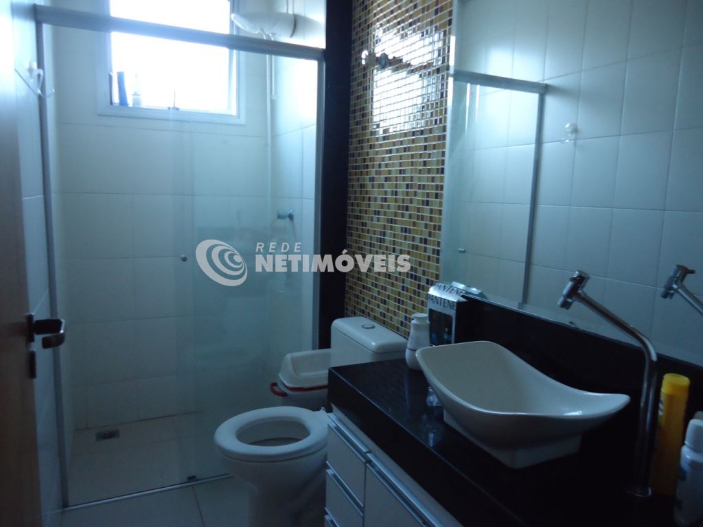 Banheiro social completo, com bancada em granito, armário, box em vidro temperado e acabamento em pastilhas.
