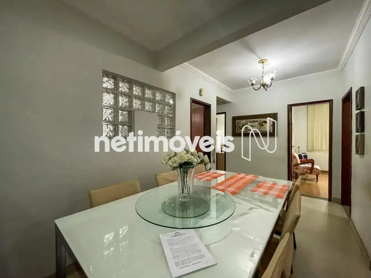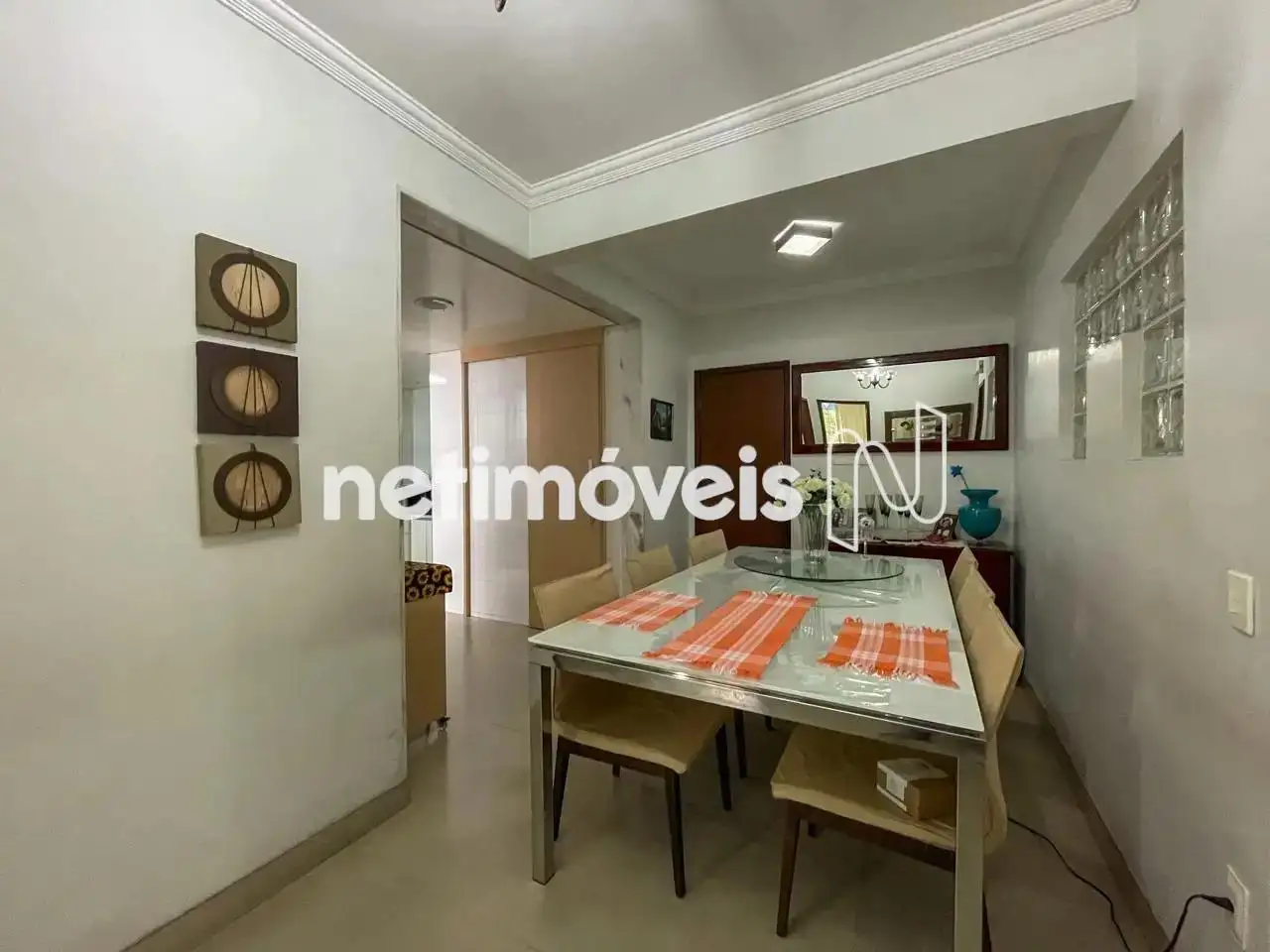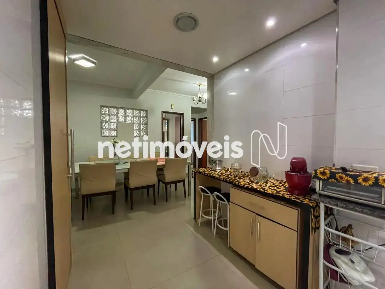 - 01 sala de jantar incorporada a cozinha, parede com tijolo em vidro, piso em porcelanato.