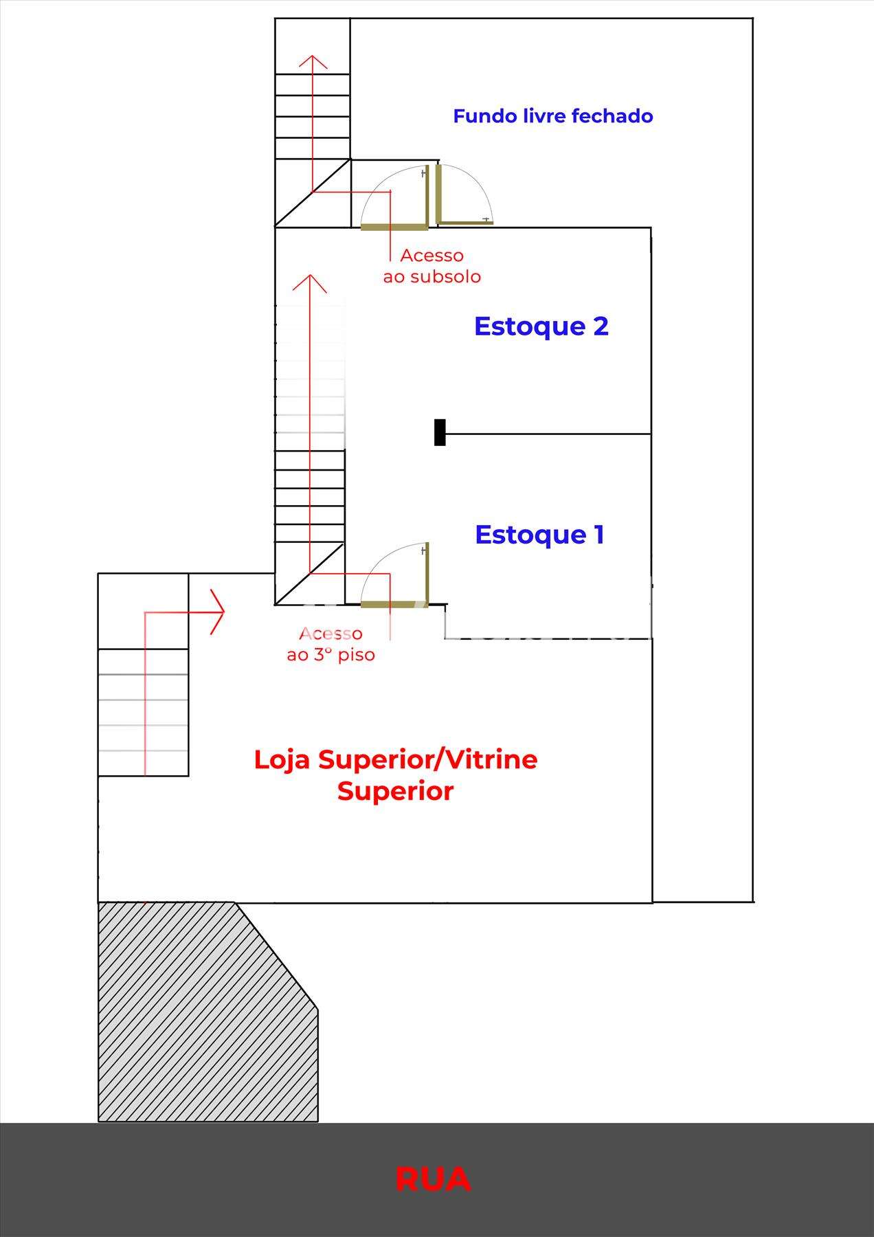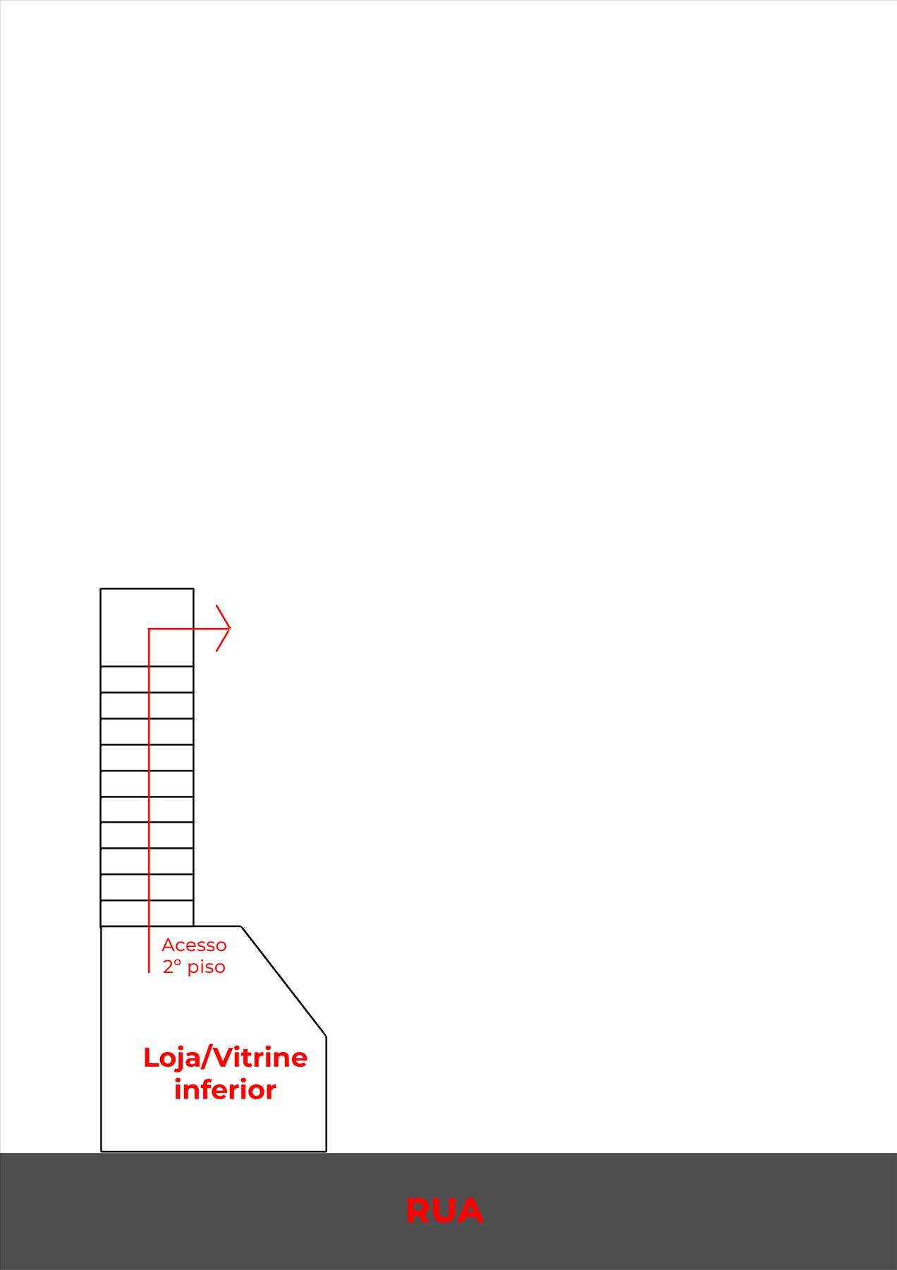 2º Piso: Salão principal PRIVATIVO que oferece ÓTIMA VITRINE DE RUA, com cerca de 115m², piso em porcelanato, paredes em acabamento de cimento queimado, provadores e salas auxiliares com estoque amplo. Fundos com espaço amplo de apoio ao salão principal, podendo ser utilizado de diversas formas.