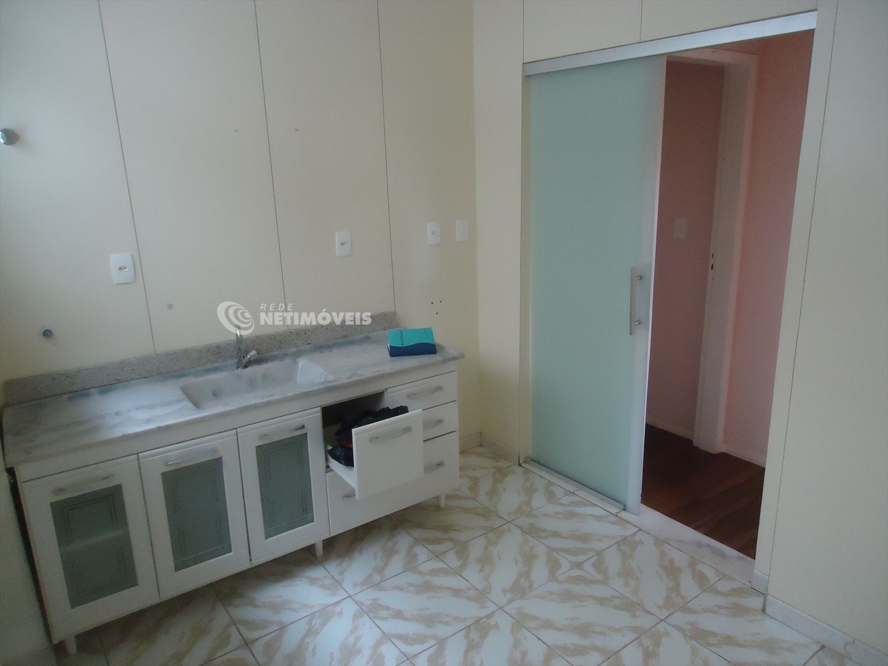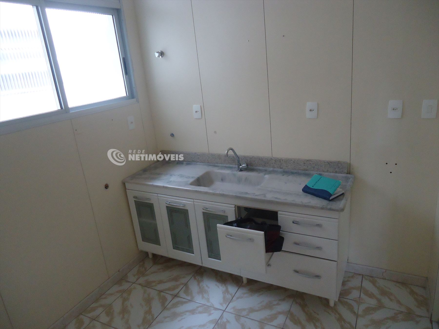 1 cozinha com armários bem divididos, bancada em mármore, piso com cerâmica.