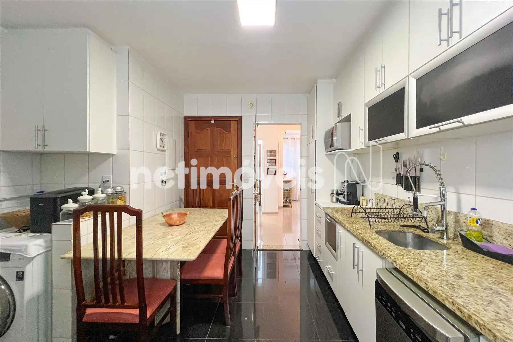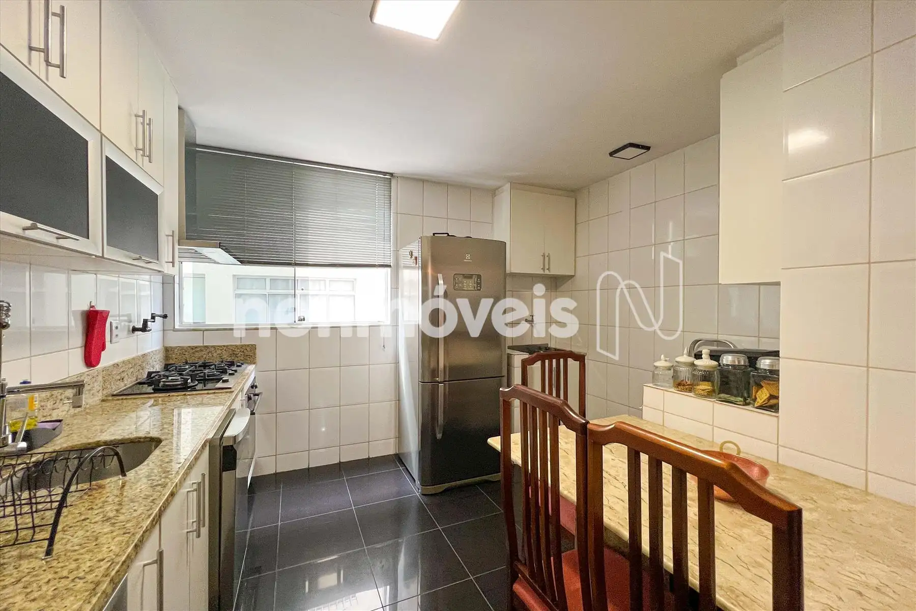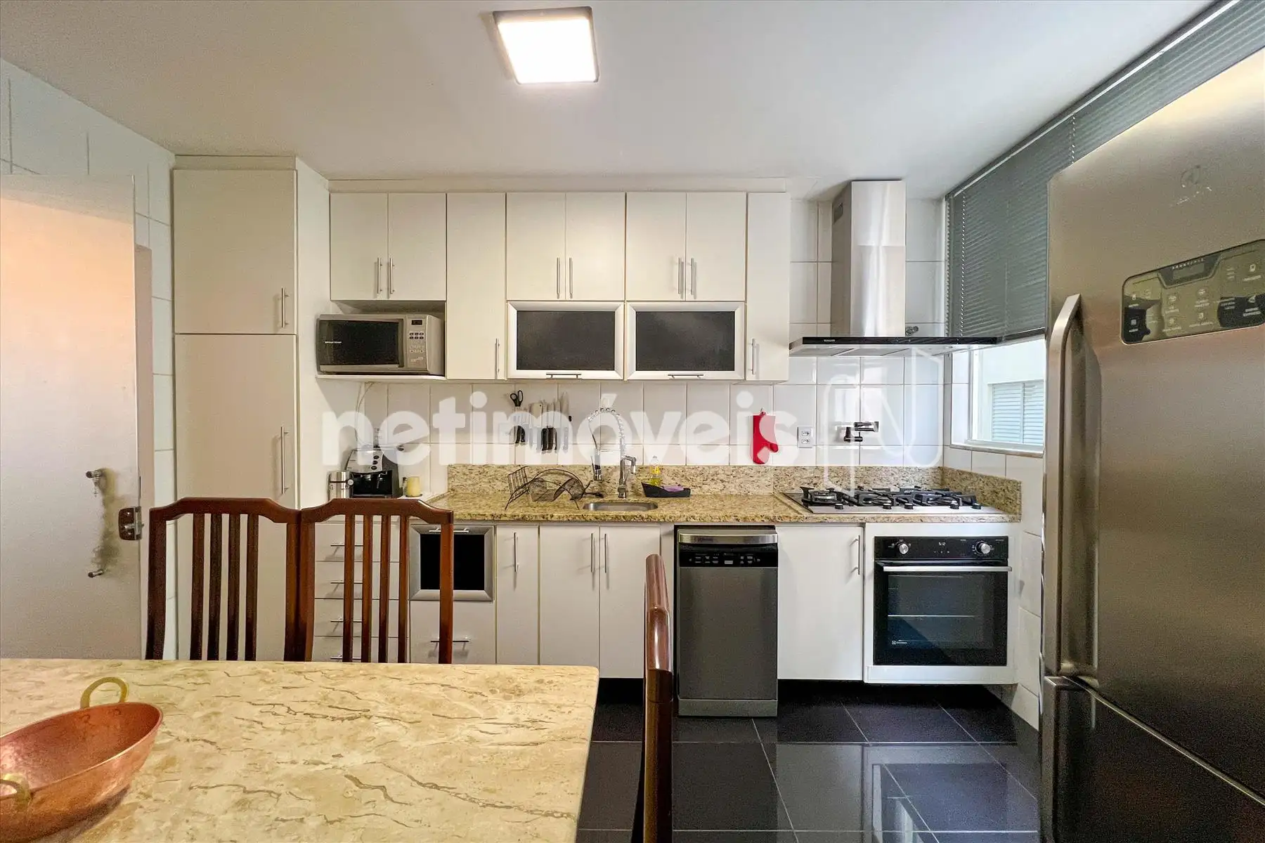Pisos em porcelanato e granito. Bancadas em granito.
