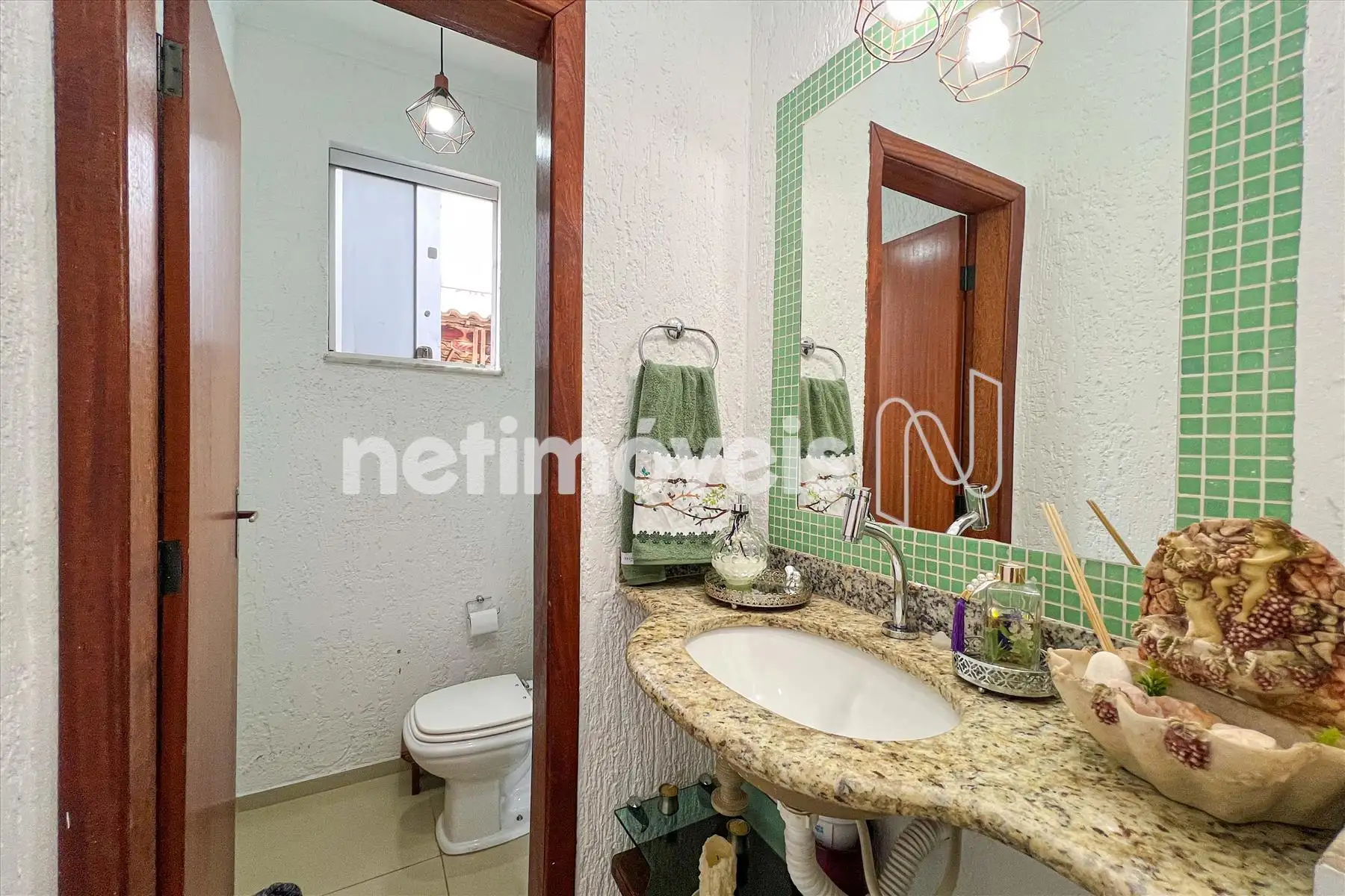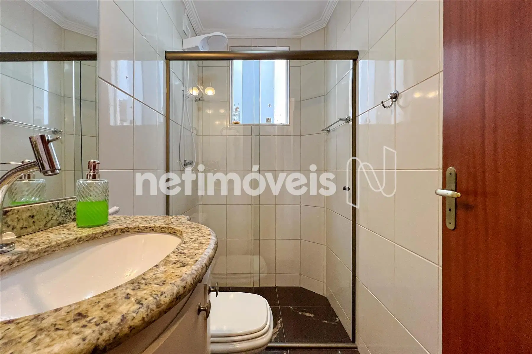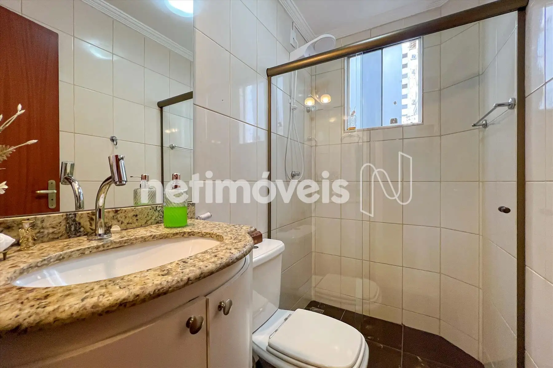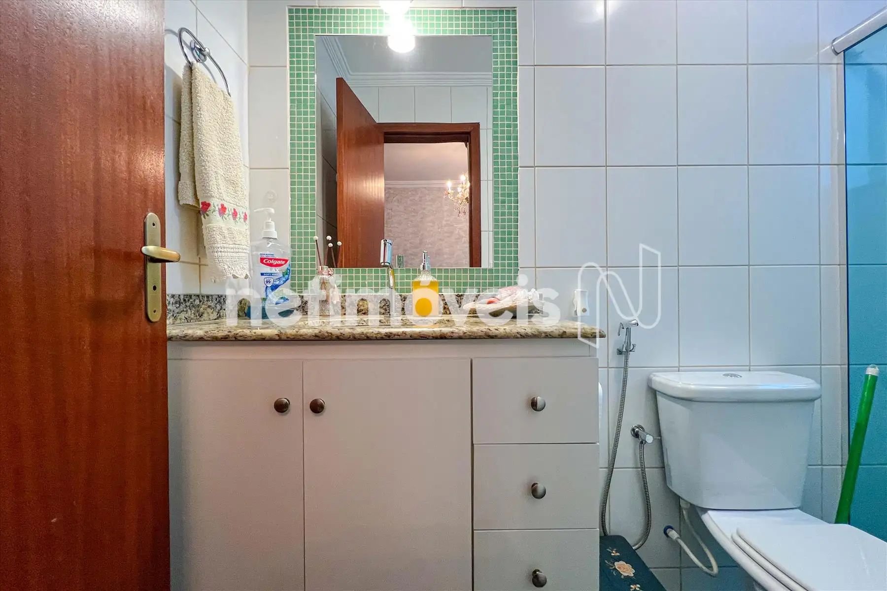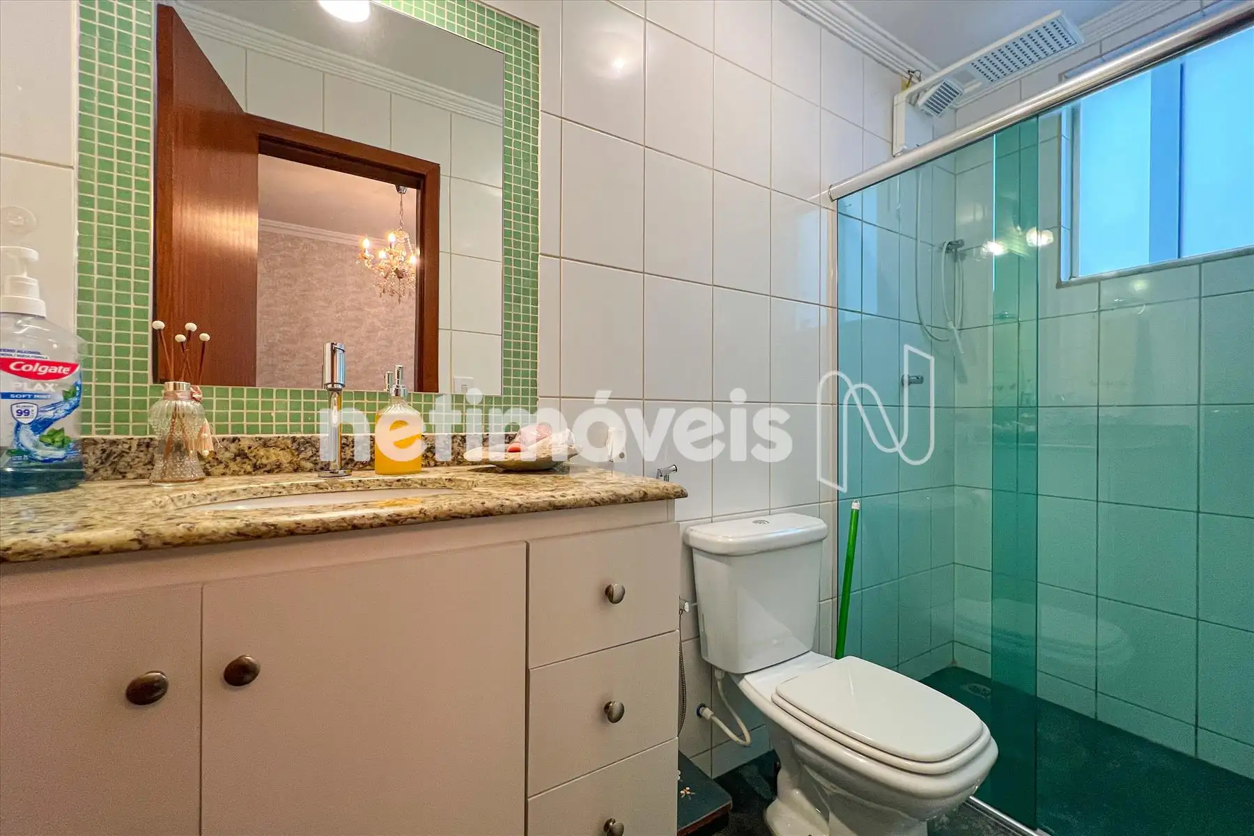 Banho social com armário e box em vidro temperado.