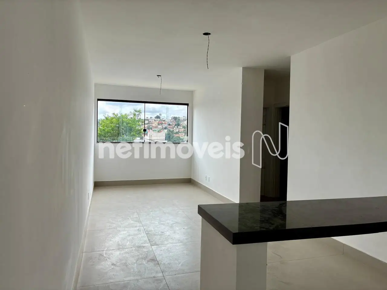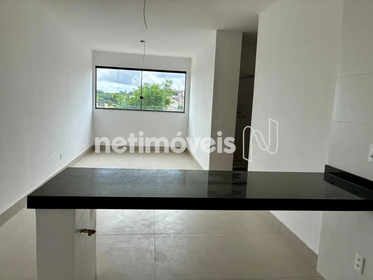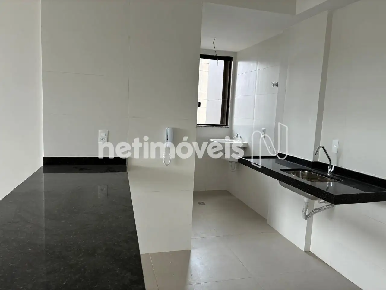 Cozinha integrada com sala e área de serviço, piso em porcelanato, bancadas e passa-prato em granito.
