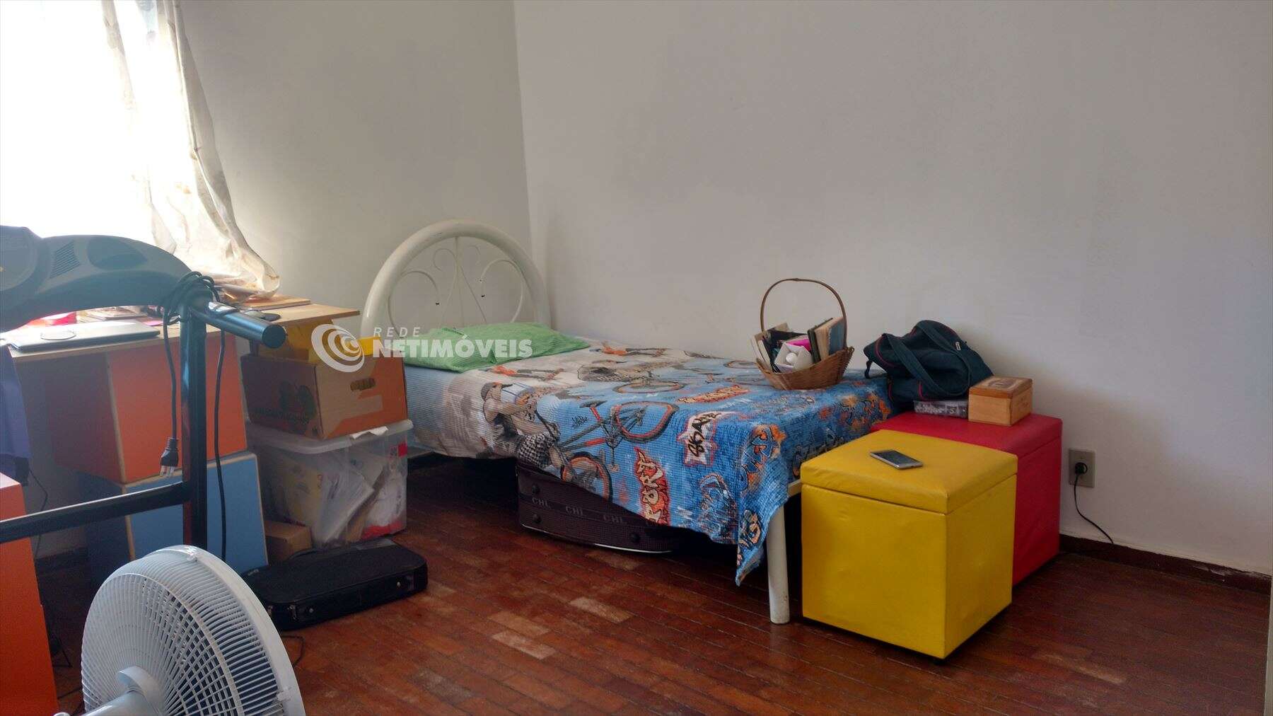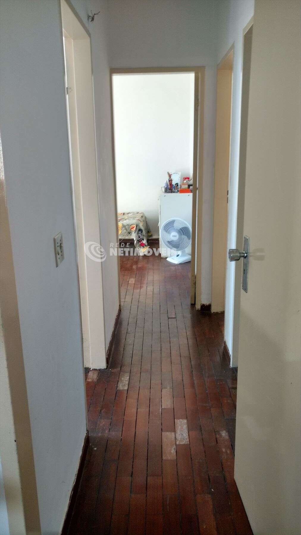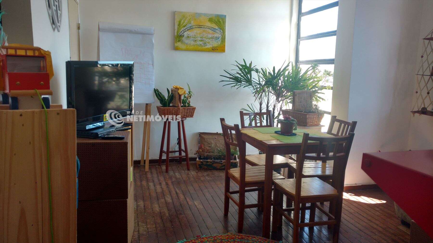- Sala ampla e iluminada, com piso em taco de madeira.