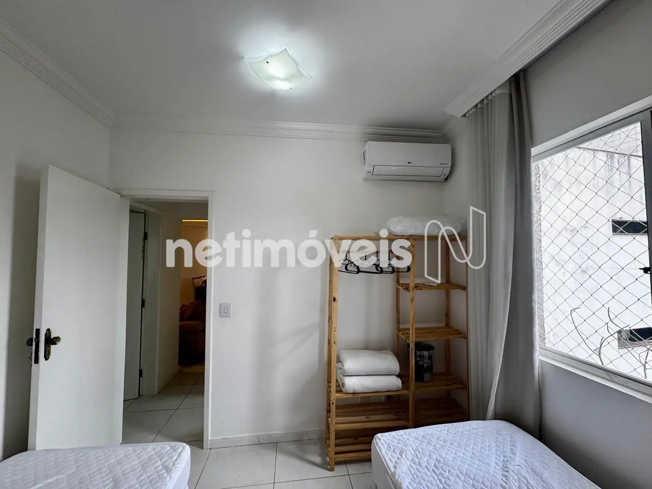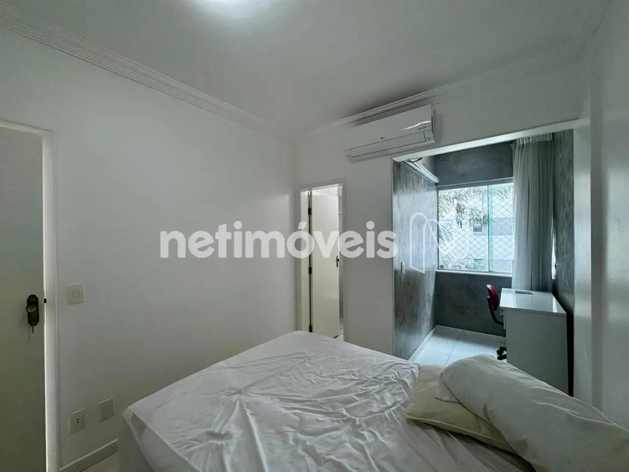 - 2 quartos, sendo suíte com armários e varanda. Cômodos com ar condicionado. Piso: Porcelanato.