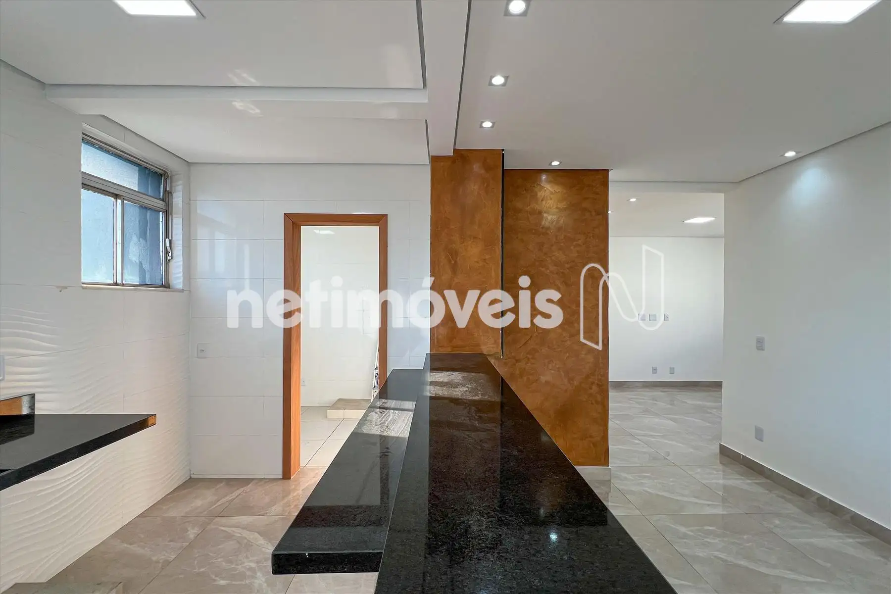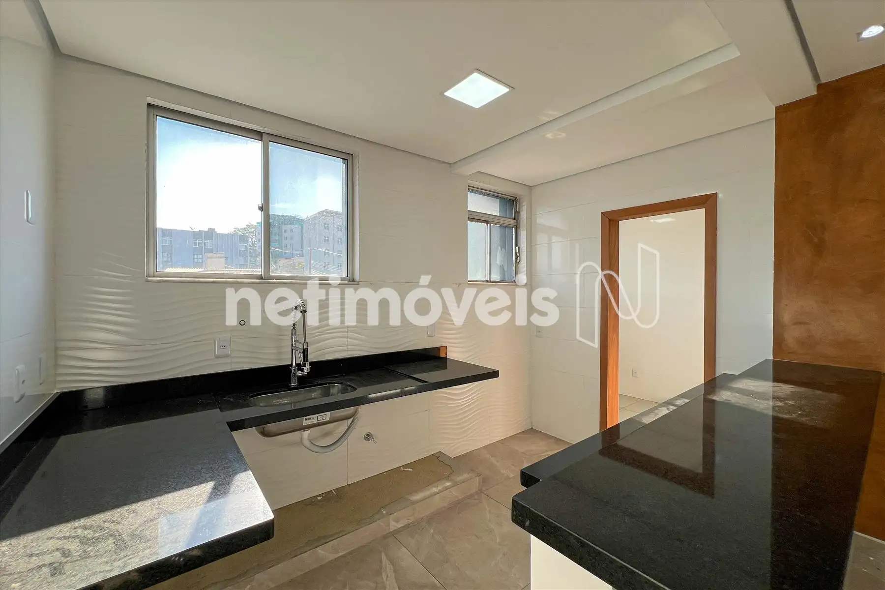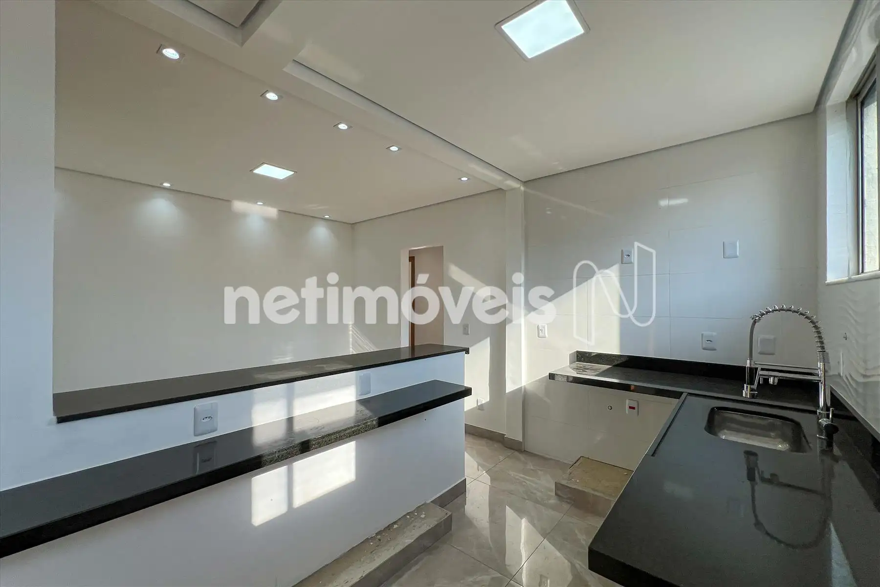 Cozinha, piso porcelanato e bancada em granito.