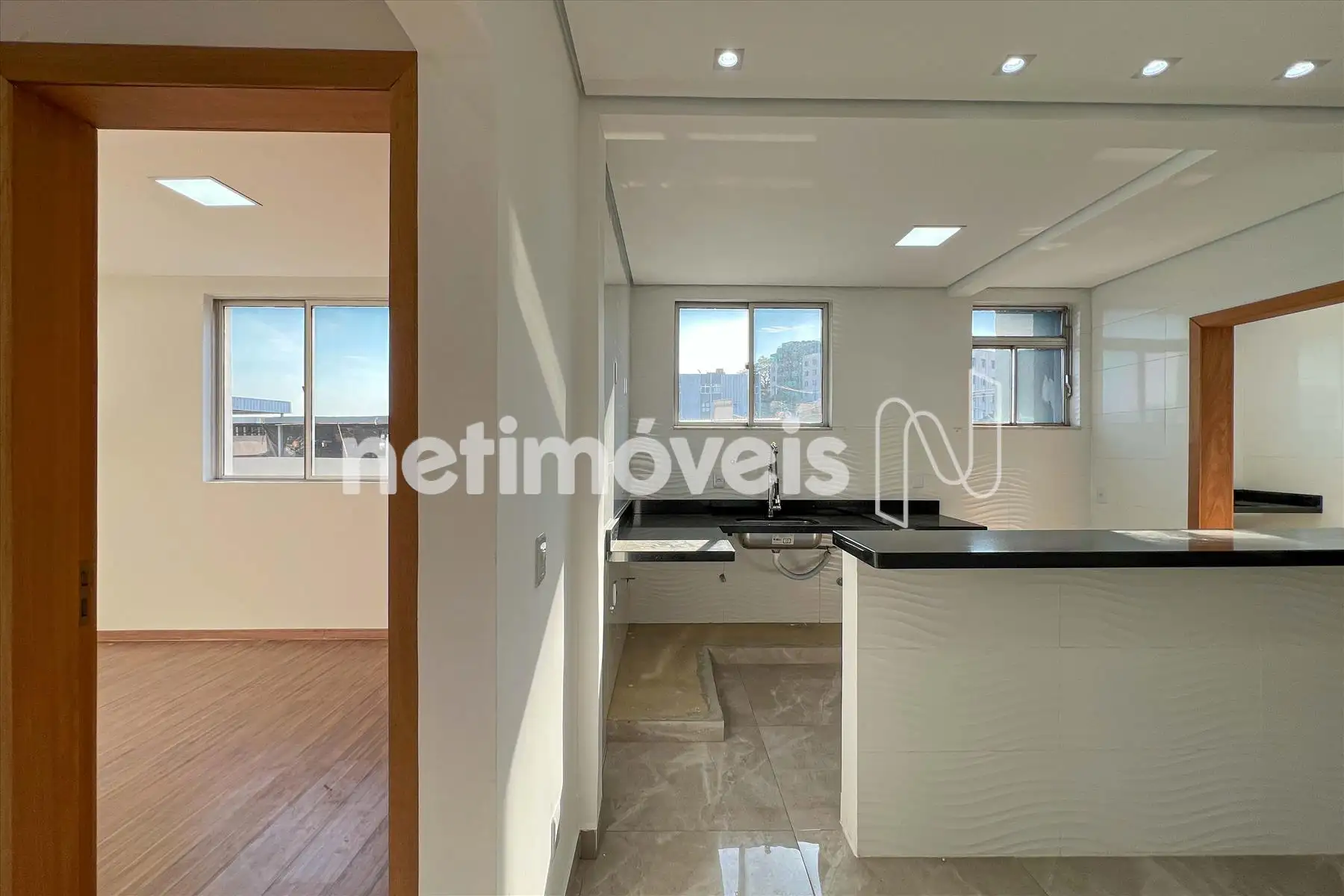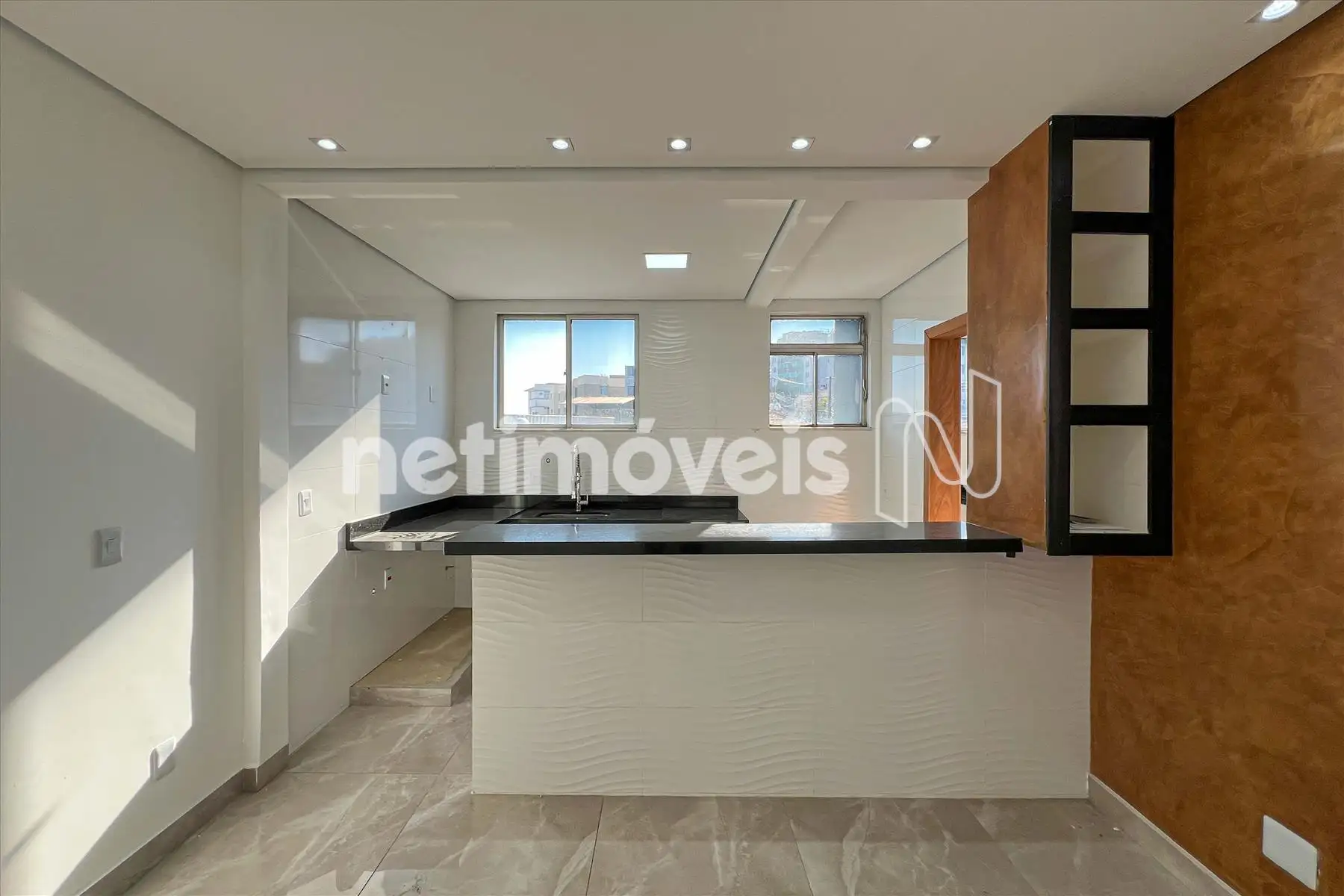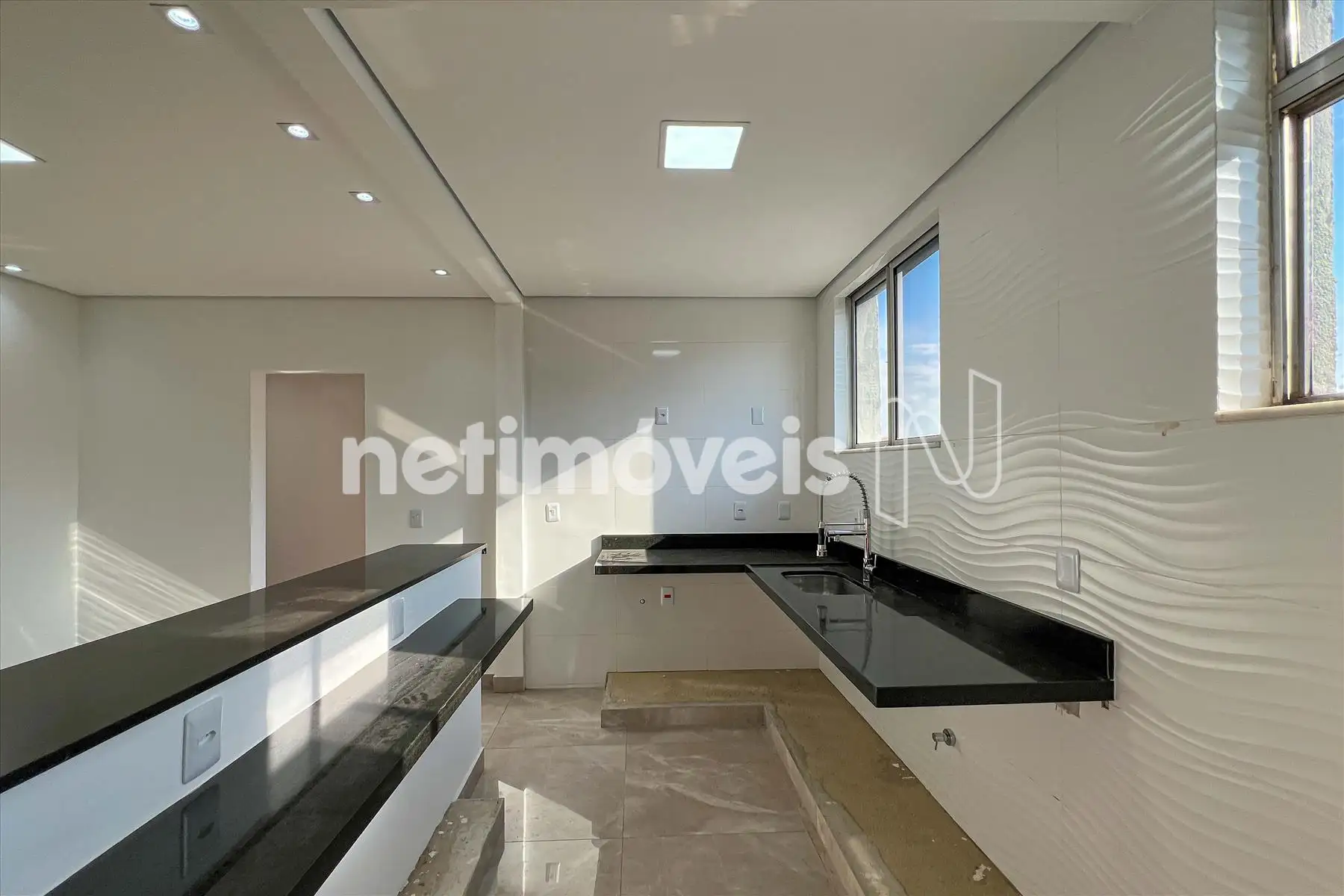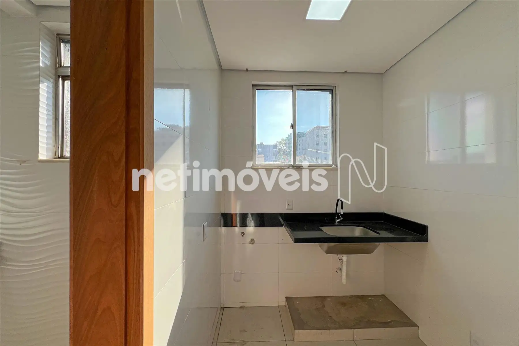 Cozinha, piso porcelanato e bancada em granito.
