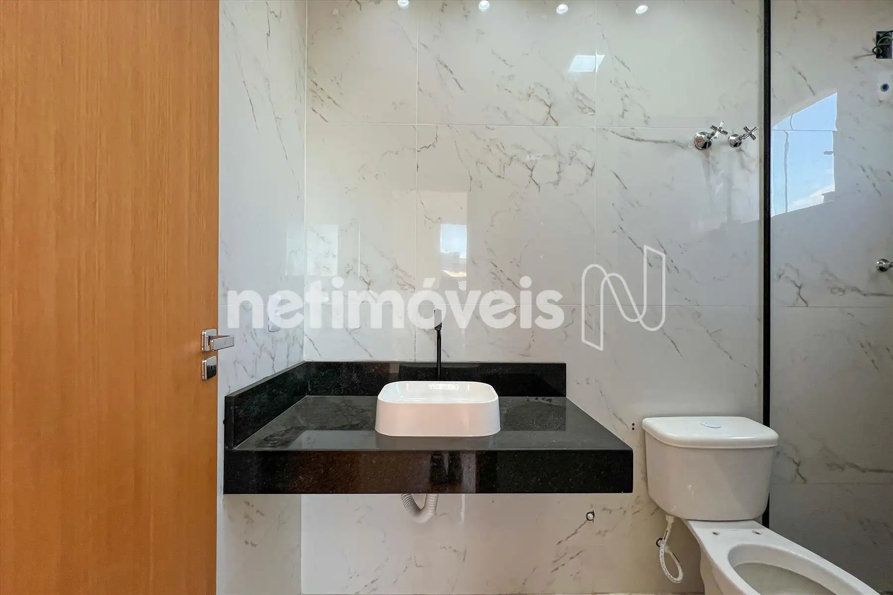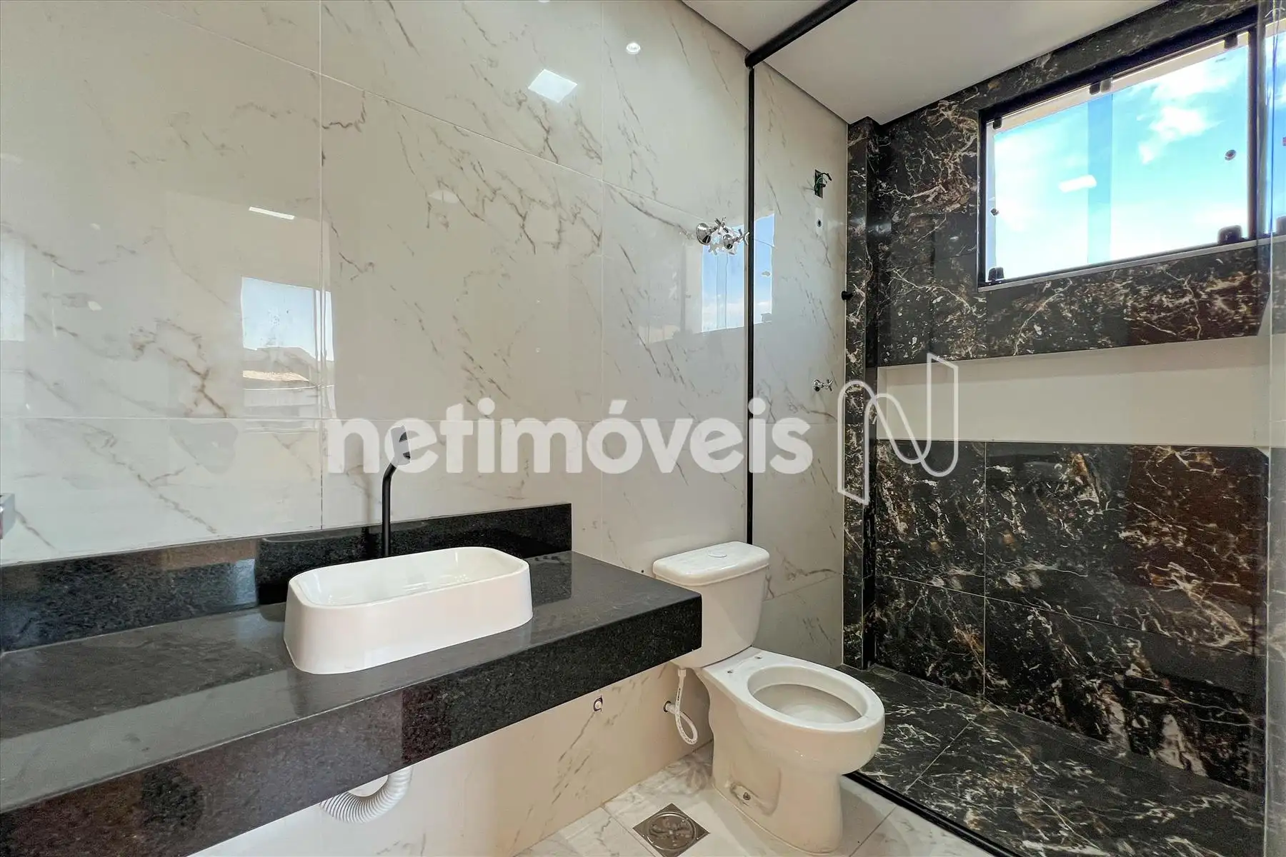 Banhos social e suíte, piso porcelanato e bancada em granito.