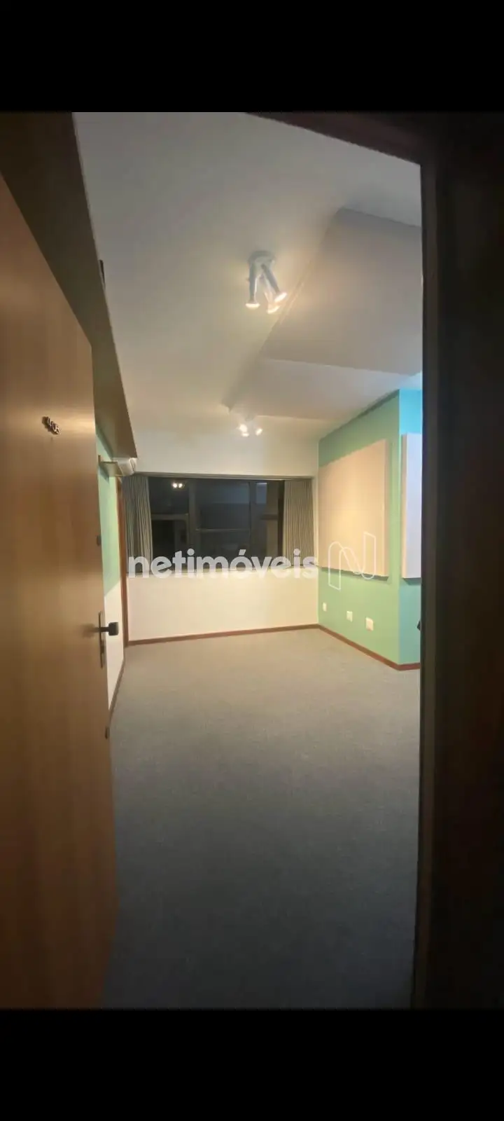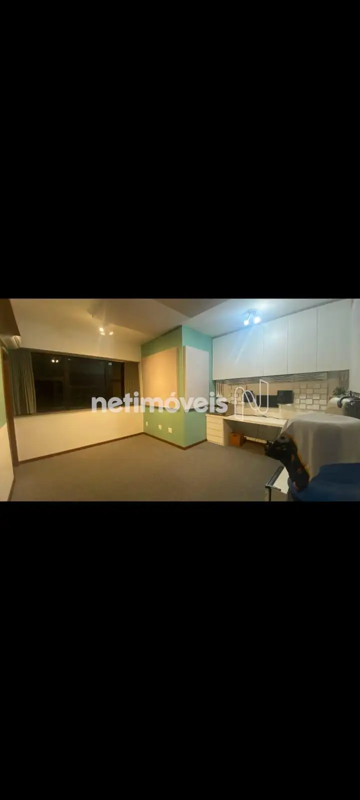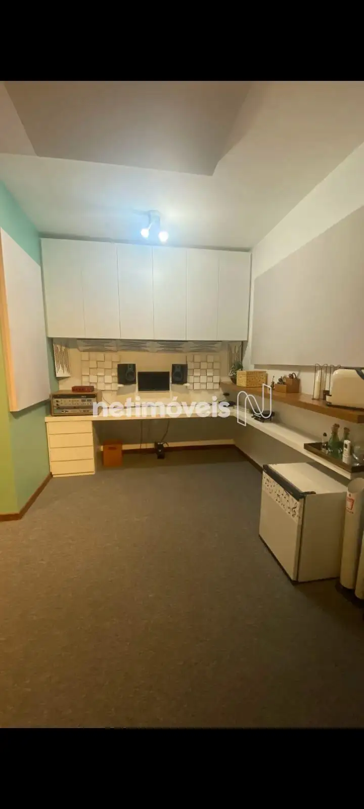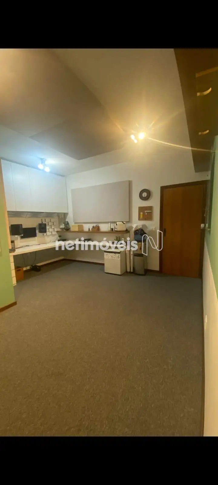 Excelente sala com aproximadamente 25m², piso em carpete cortinas sob medida, porta acústica para isolamento de som, janelas amplas, luminárias, ar condicionado, armários planejados, mesa e prateleiras, banheiro com piso em cerâmica, bancadas em granito, dois elevadores e portaria 24h.