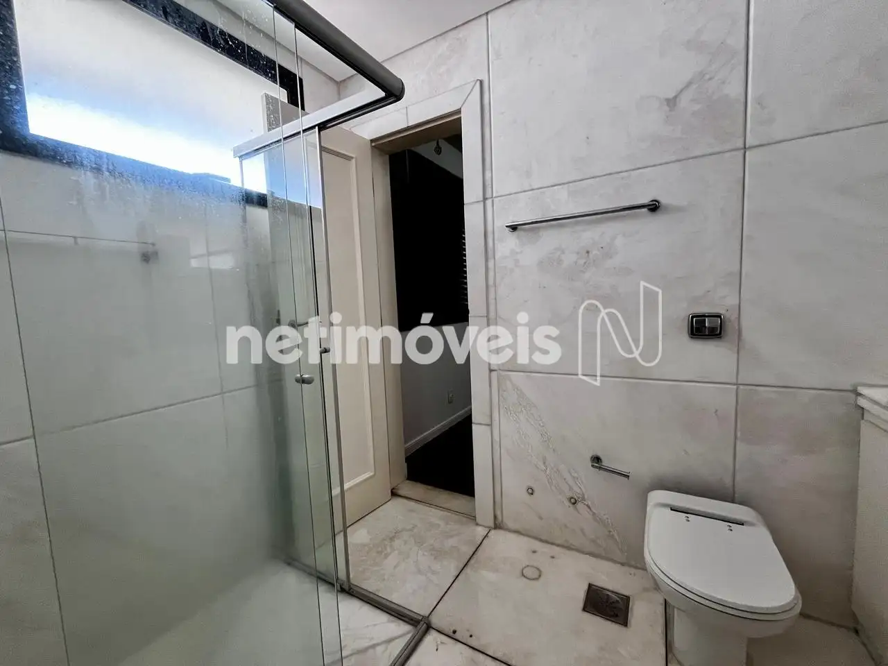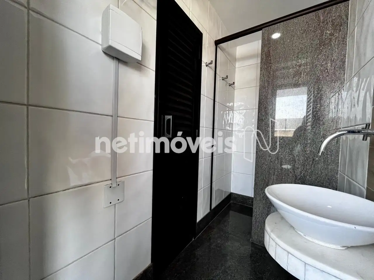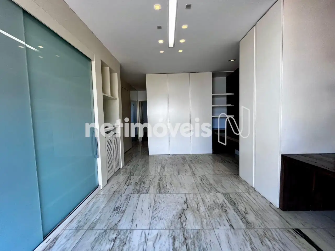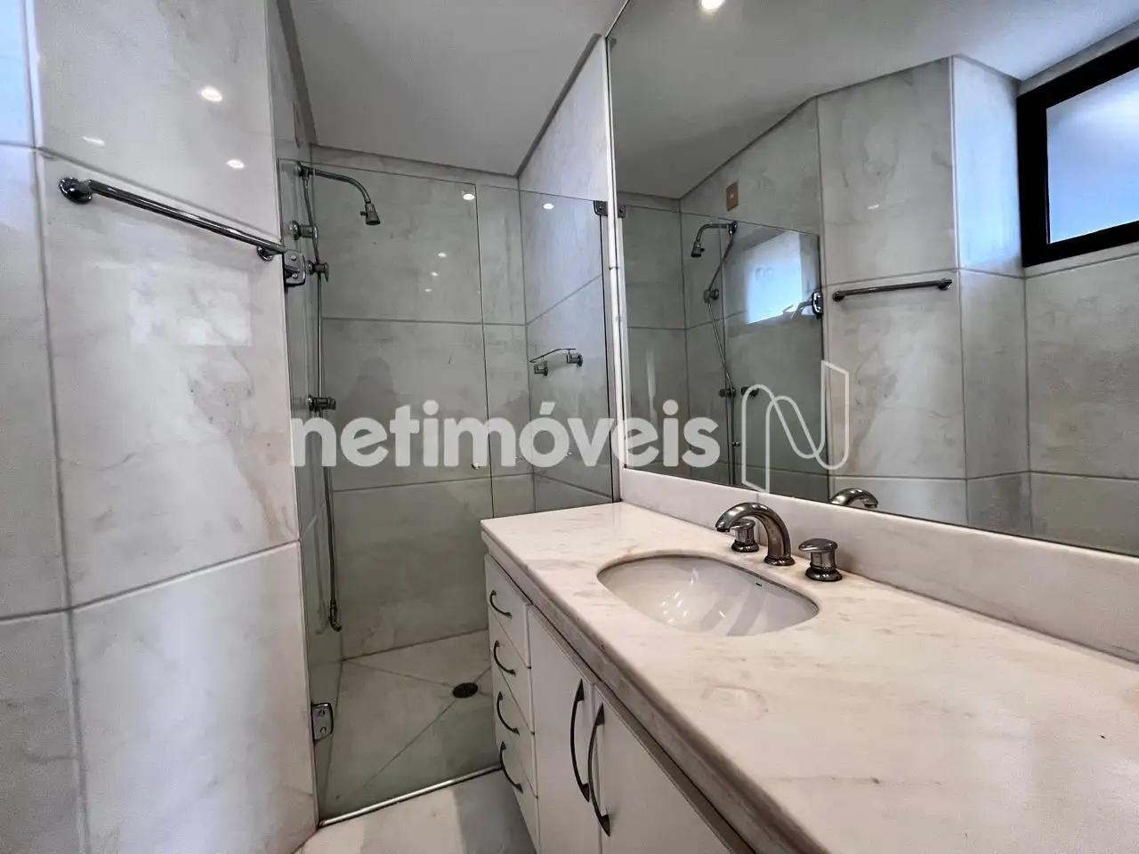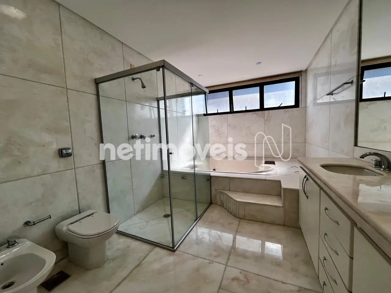 03 banheiros grandes com armários sob bancada em mármore, box blindex