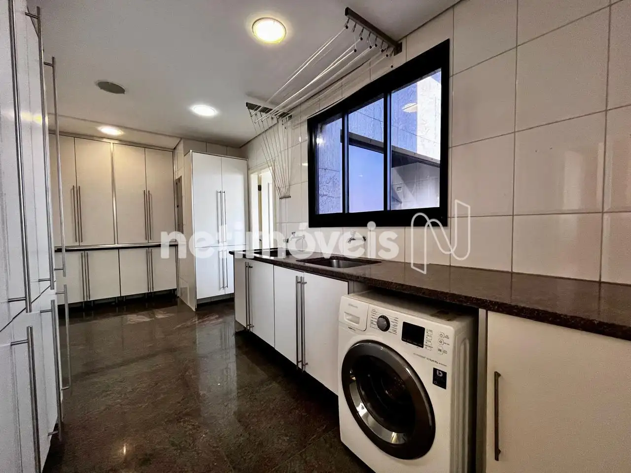Área de serviço ampla com bancada, tanque e armários e DCE;