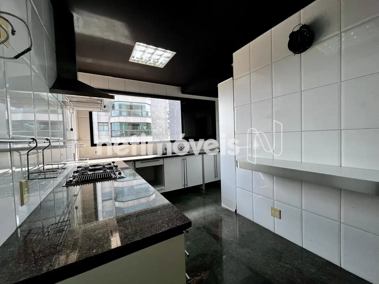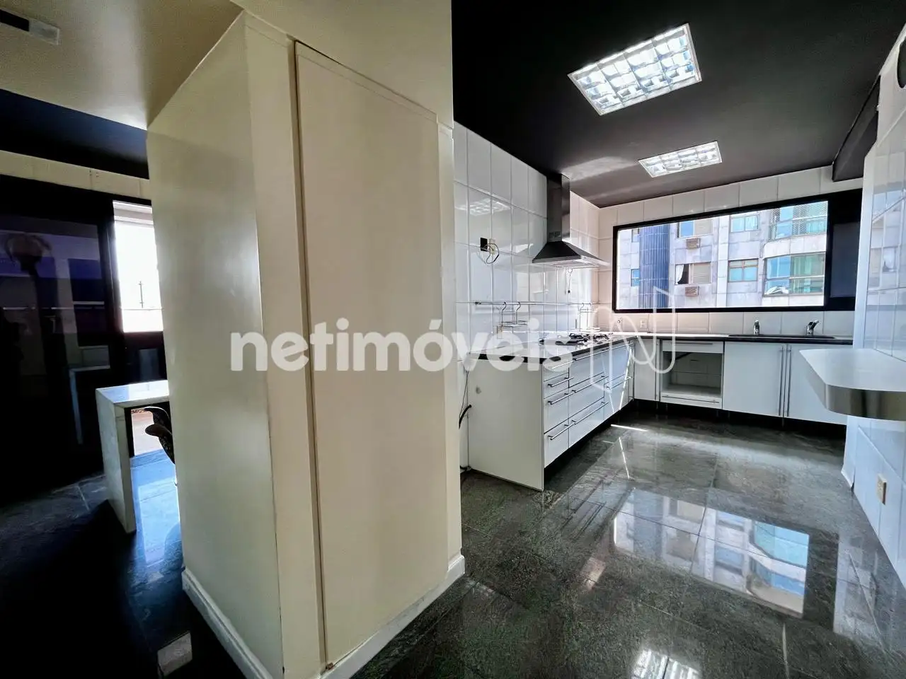Cozinha ampla com armários planejados, com bancada e piso em granito.