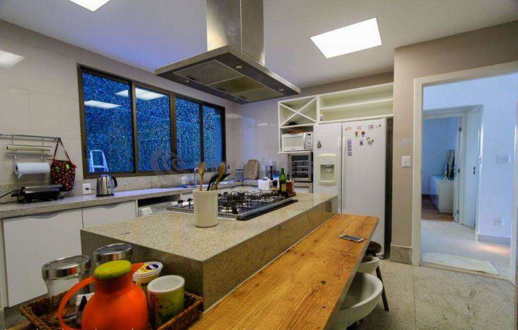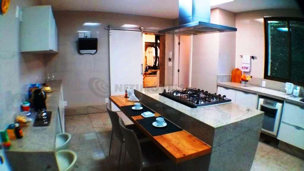 Cozinha decorada com armários, fogão de ilha com exaustor e despensa, área de serviço com dependência completa de empregada.