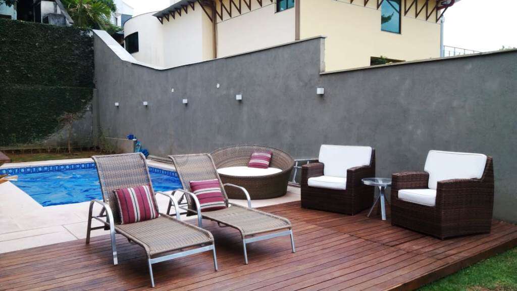 Piscina aquecida ao lado da área gourmet em deck e jardim, com vista voltada para frente da residência.