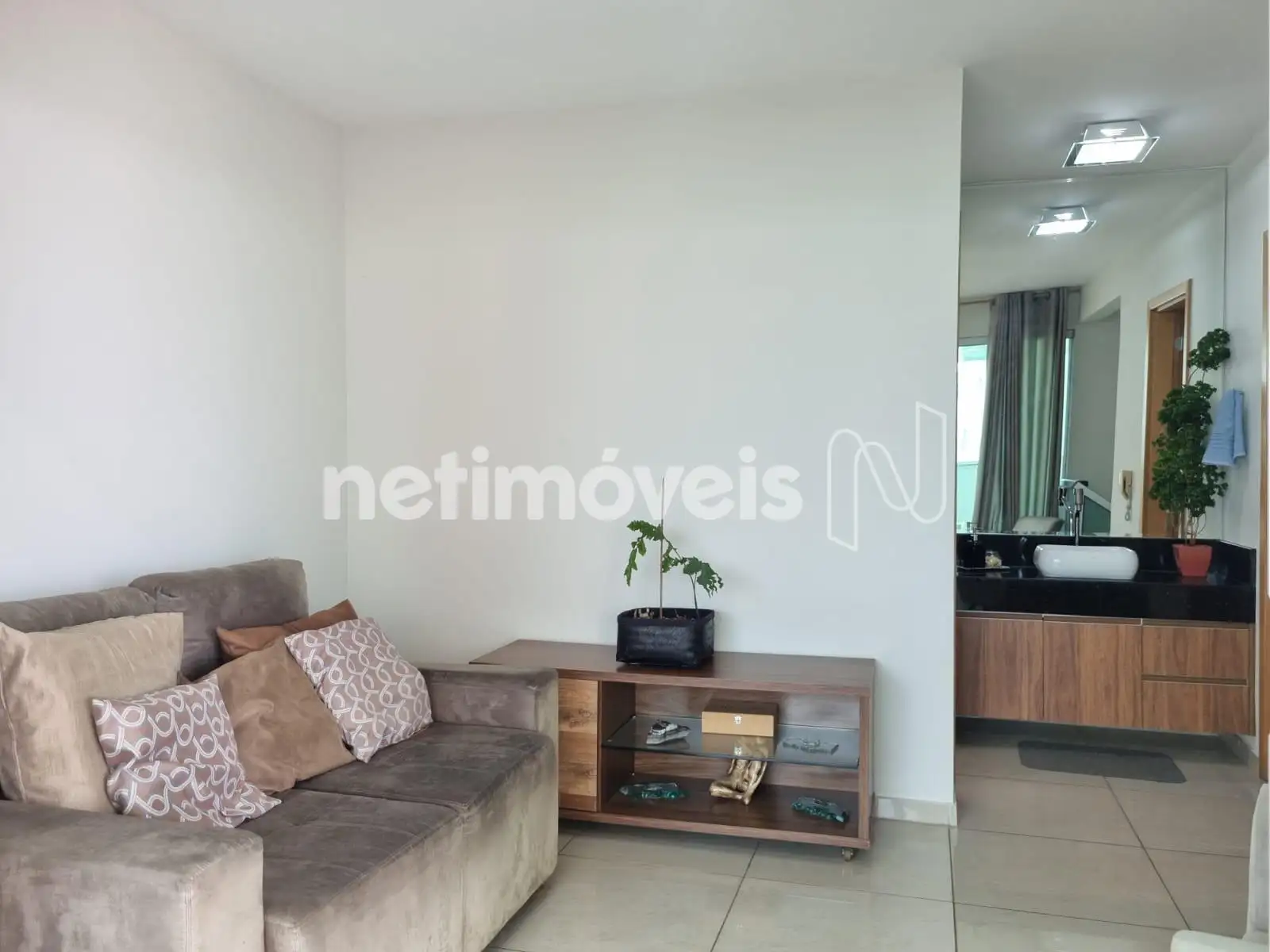 Ampla sala em L para dois ambientes com piso em porcelanato polido 80x80;