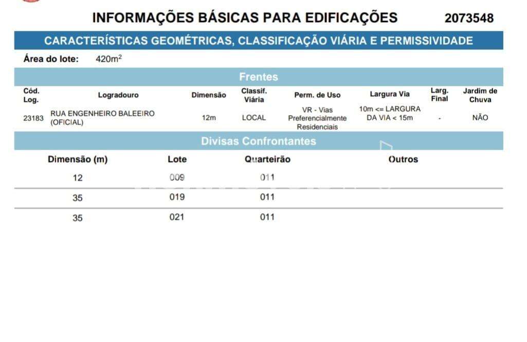Lote: 420 M², sendo 12 metros de frente, sendo 12x35 , com pequeno declive para os fundos.