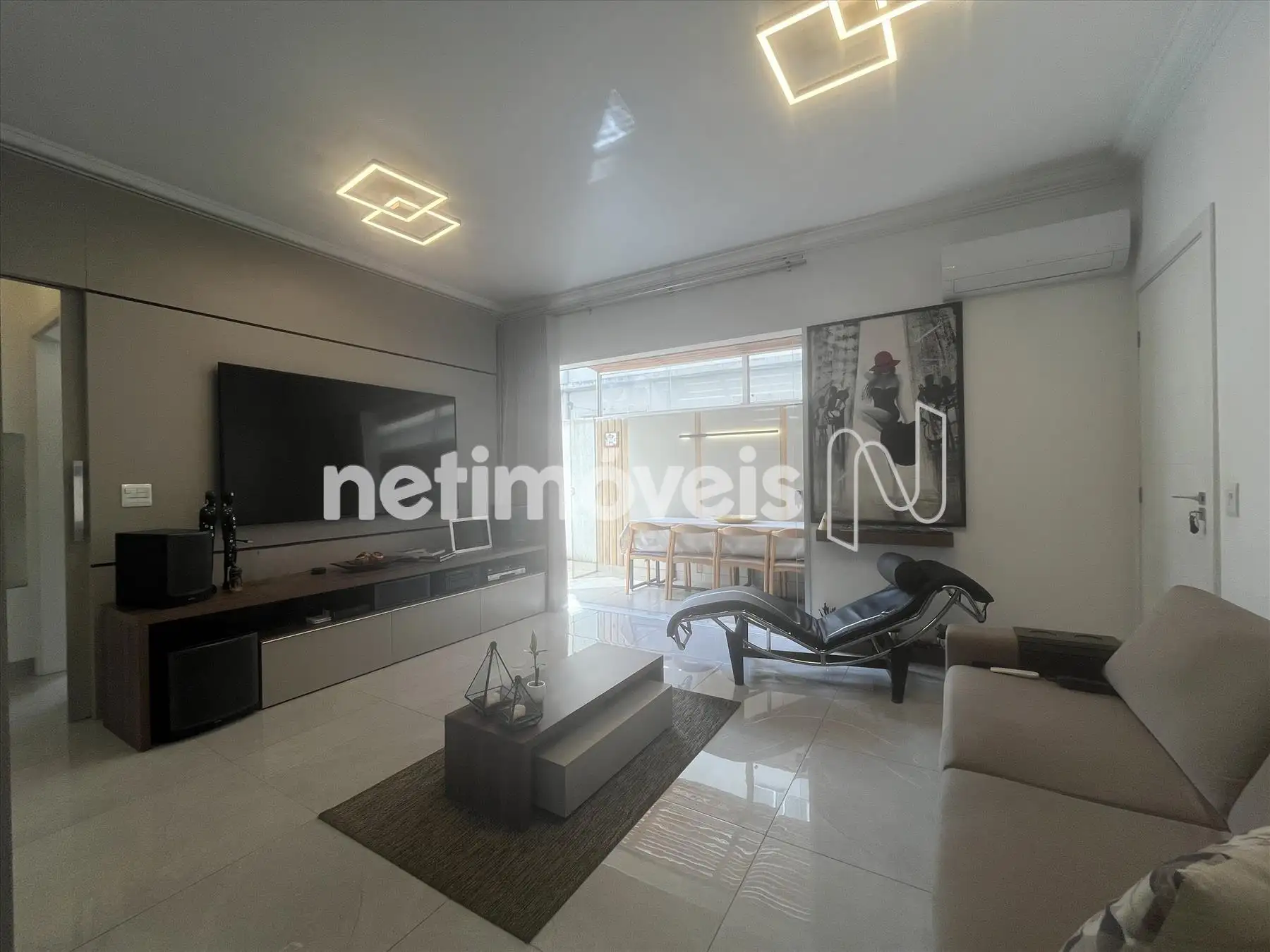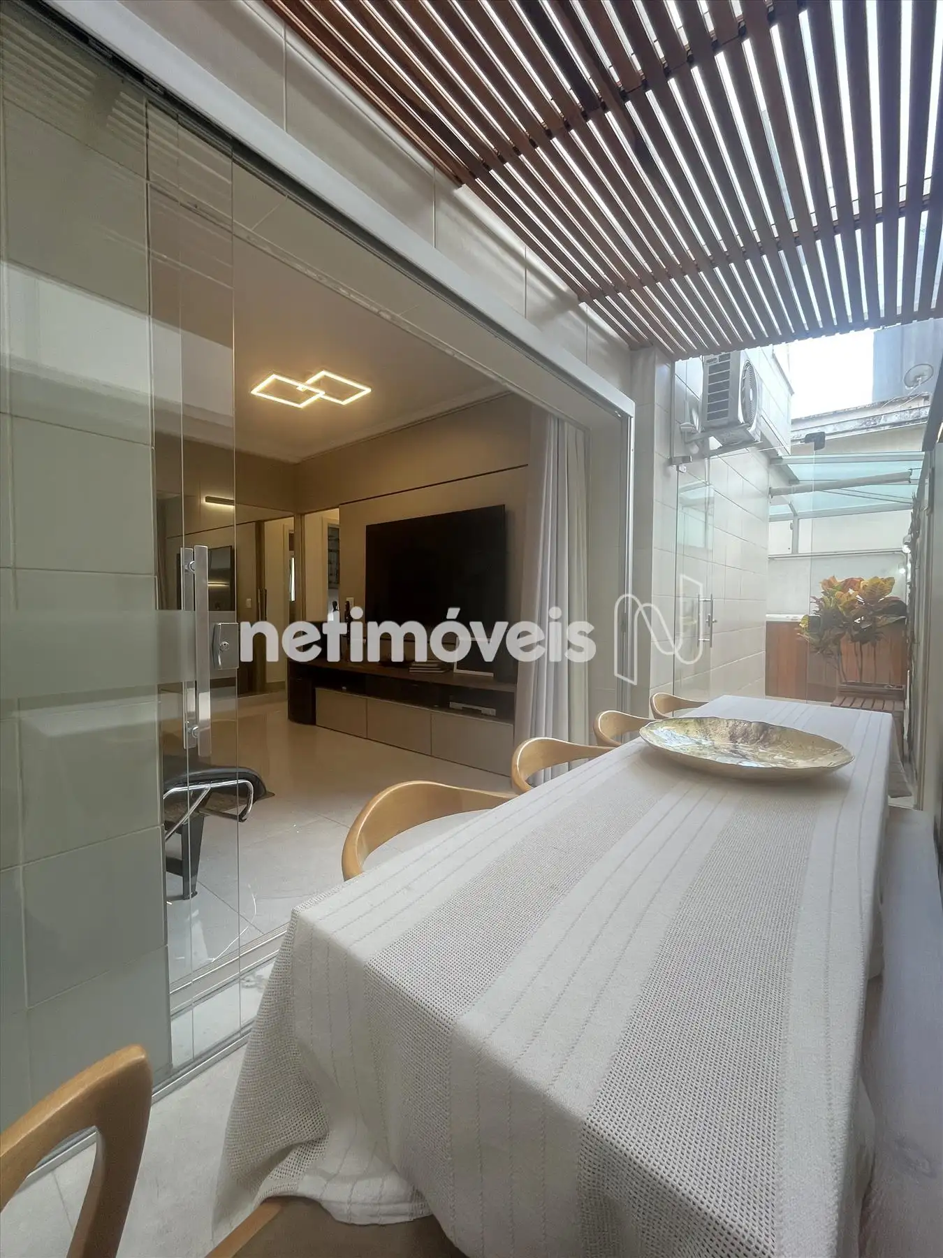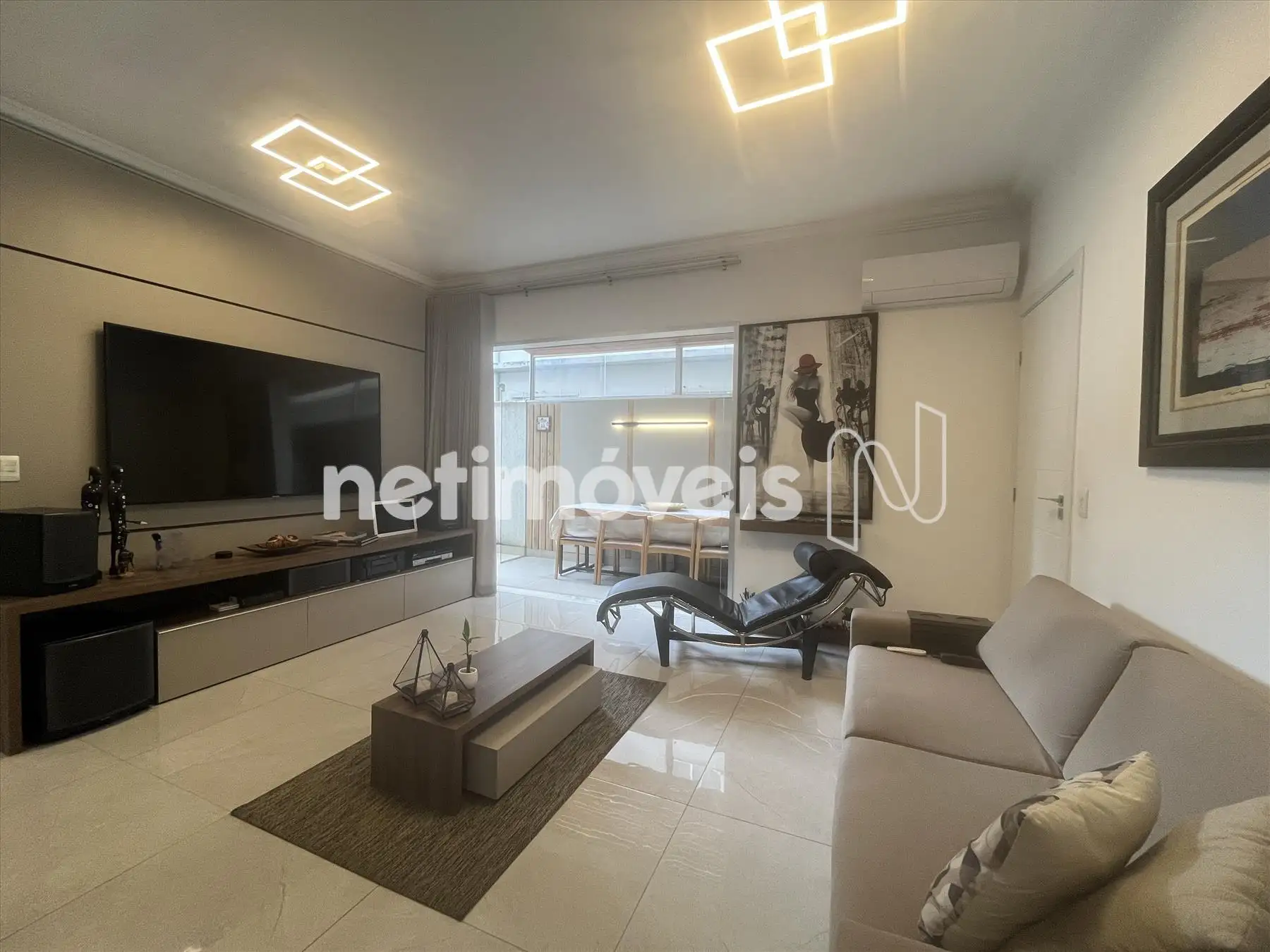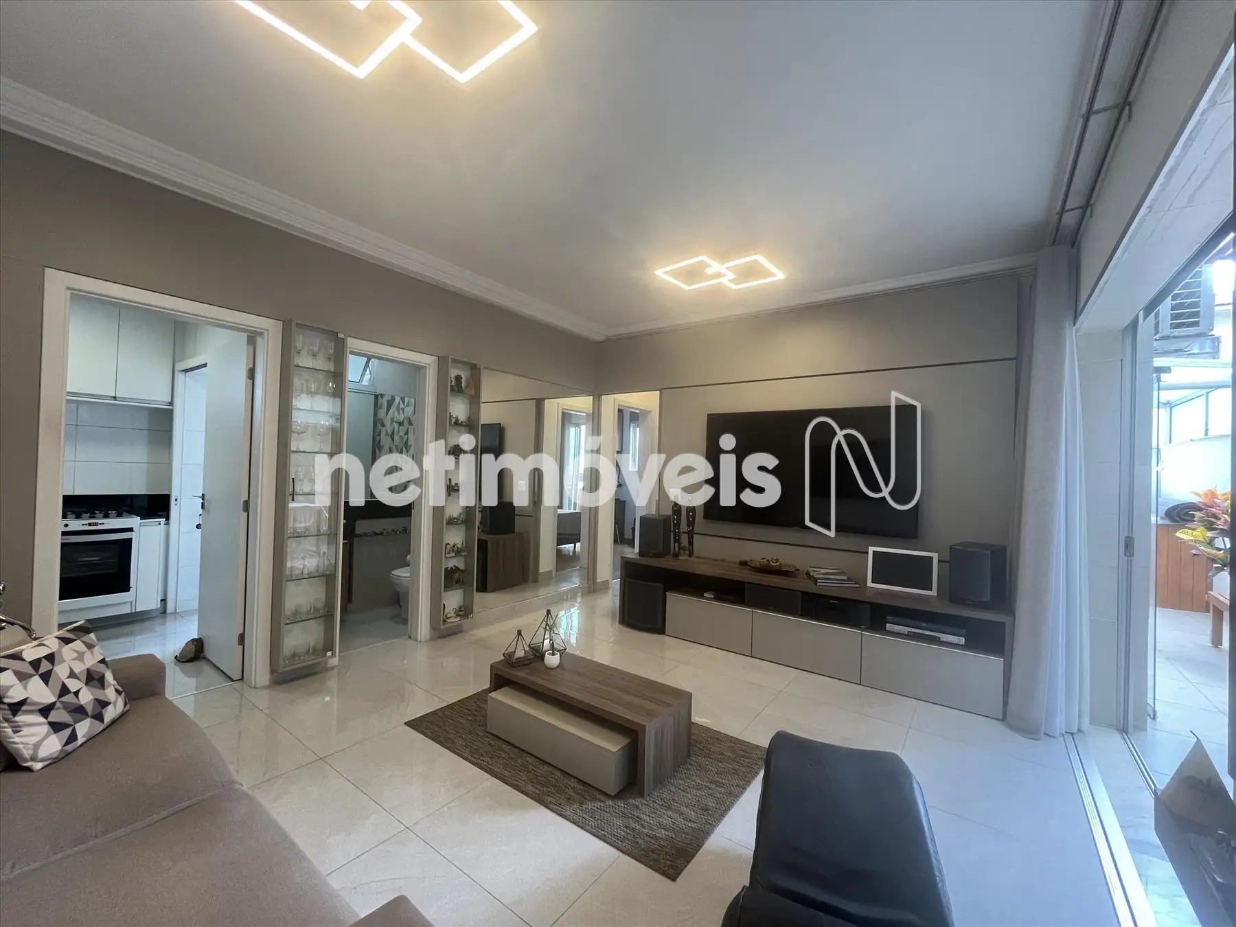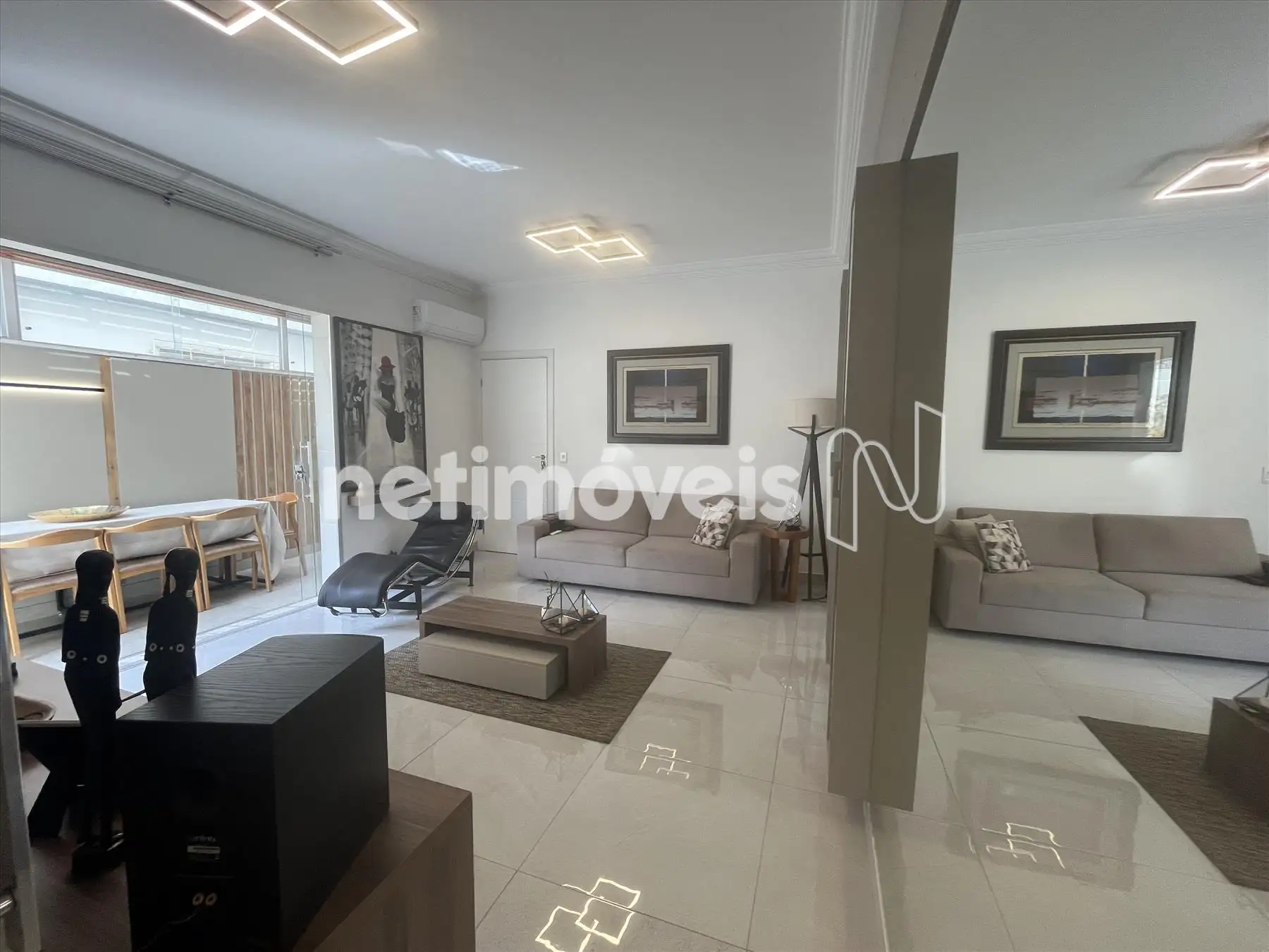 - Sala com piso em porcelanato integrada a varanda, lavabo com bancada em granito, projeto luminotécnico; ar condicionado, porta de correr fechando o hall da parte intima;