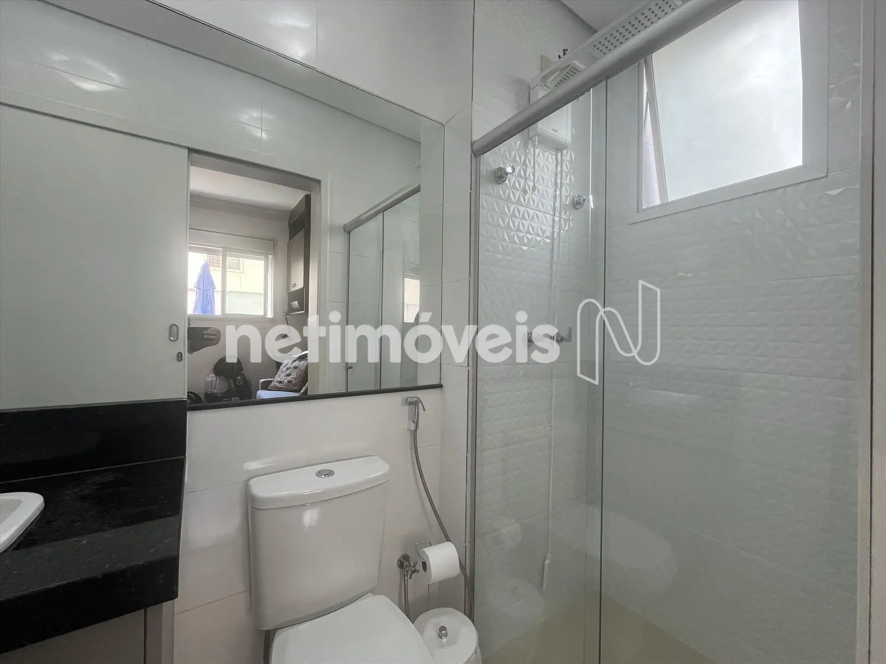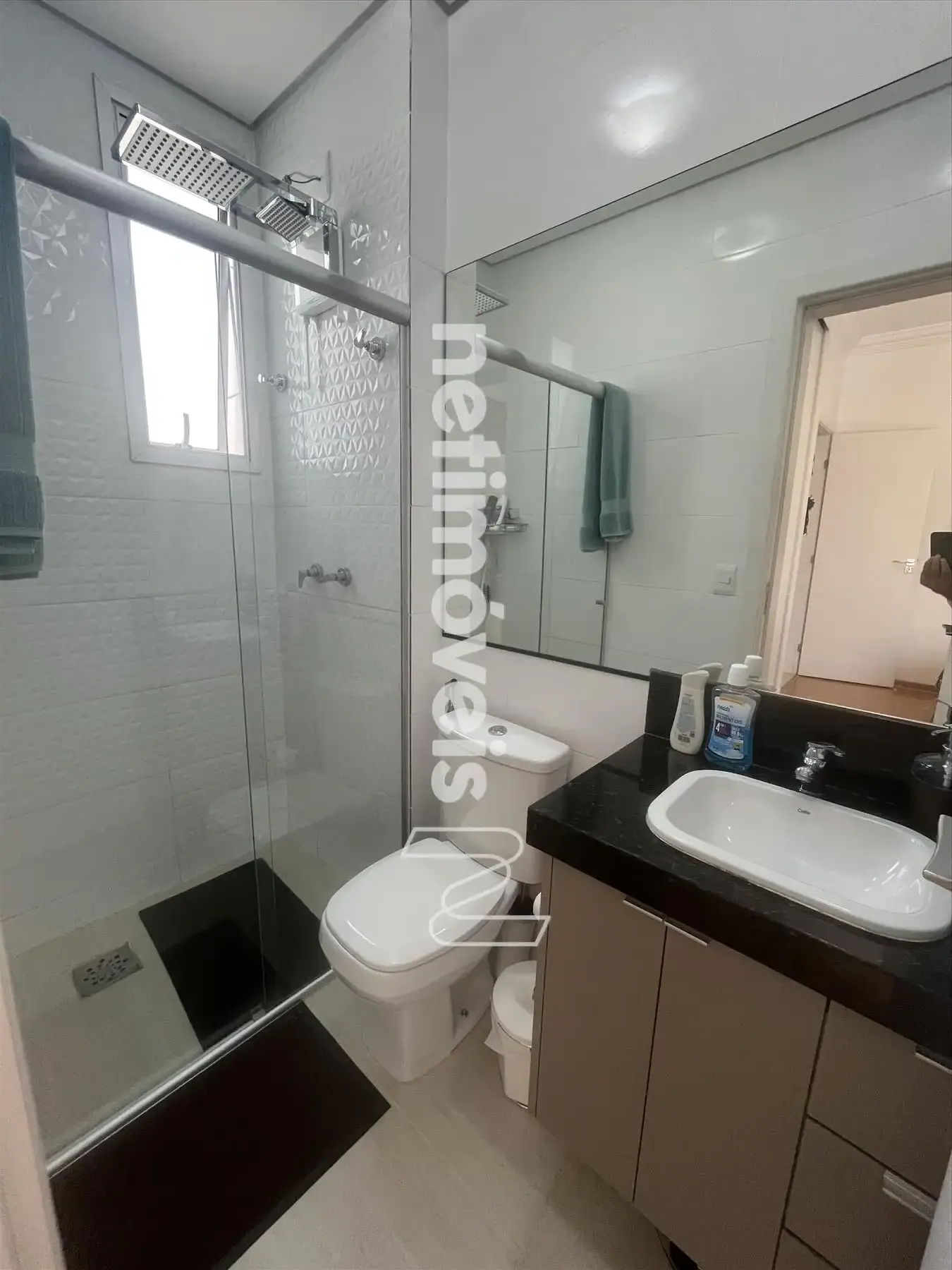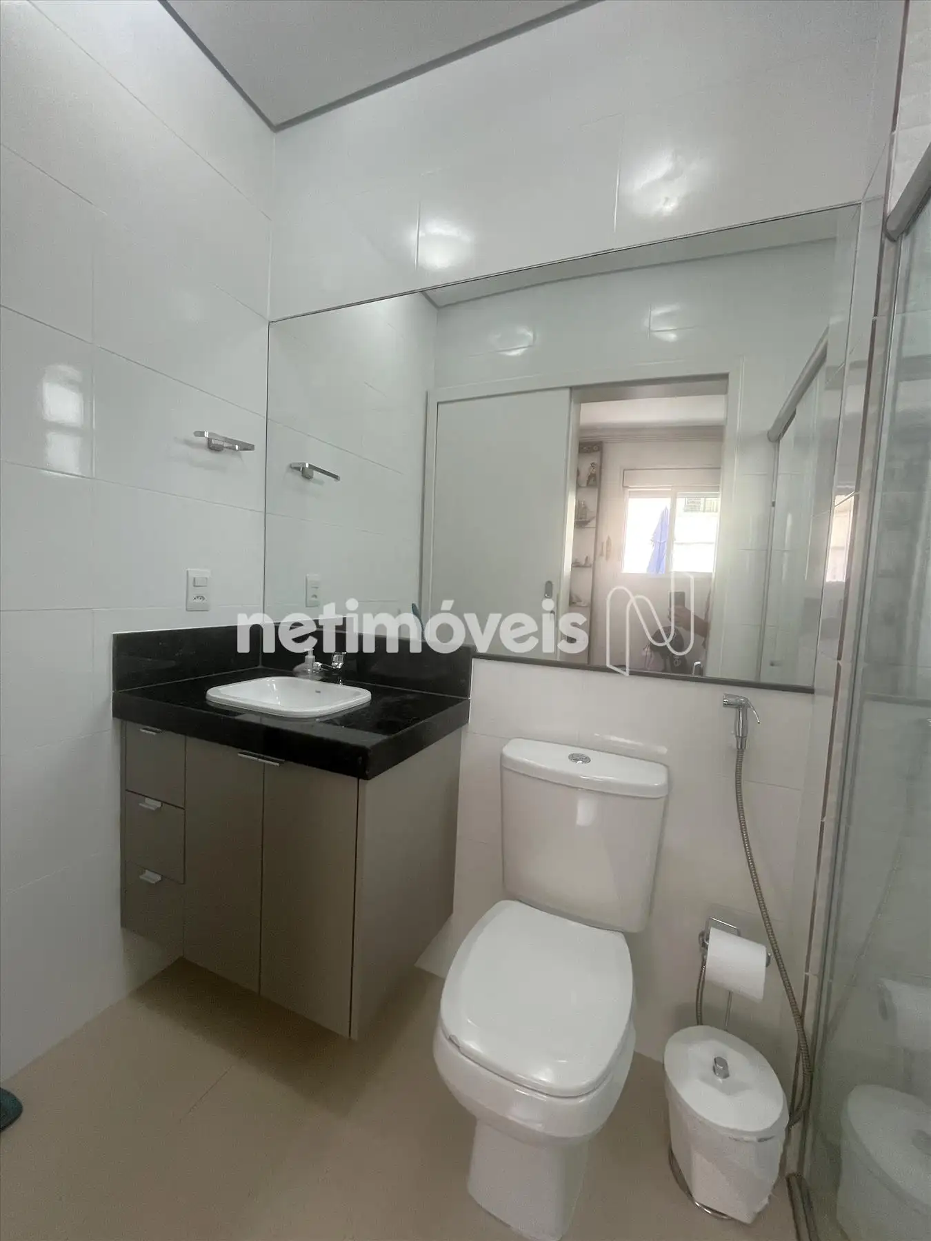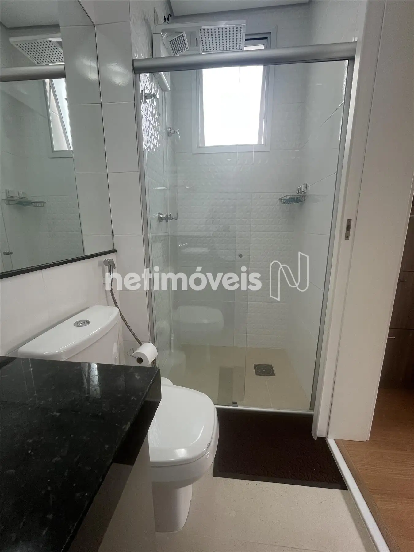 - Banhos das suítes com piso em cerâmica e box em vidro temperado e armários sob as bancadas de granito;