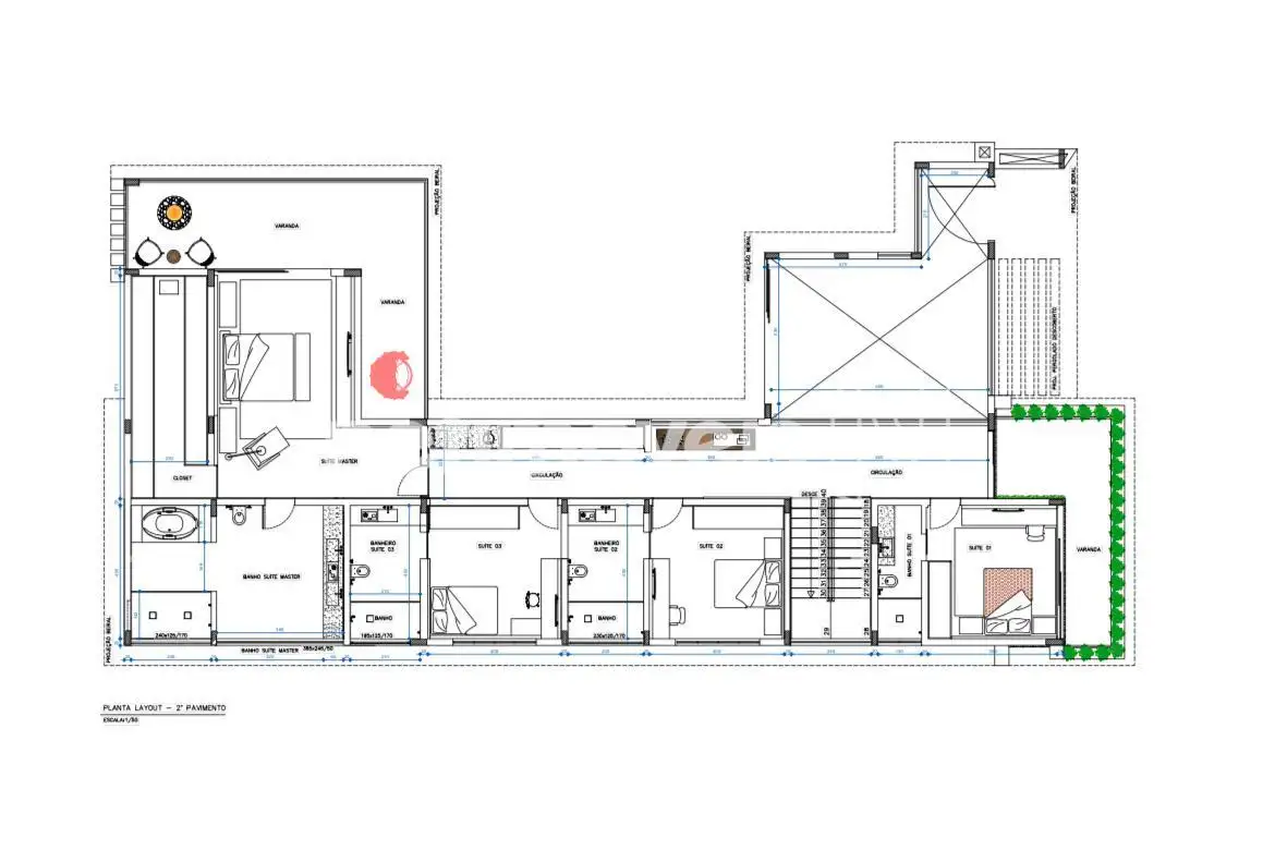 4 Suítes sendo a máster com ótimo closet, e amplo banheiro com banheira de imersão, além de rouparia e varandão em “L” privativo.