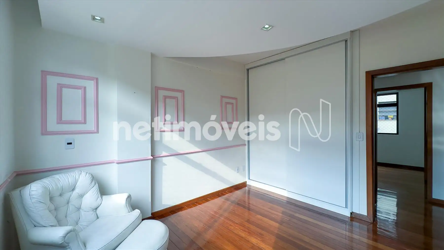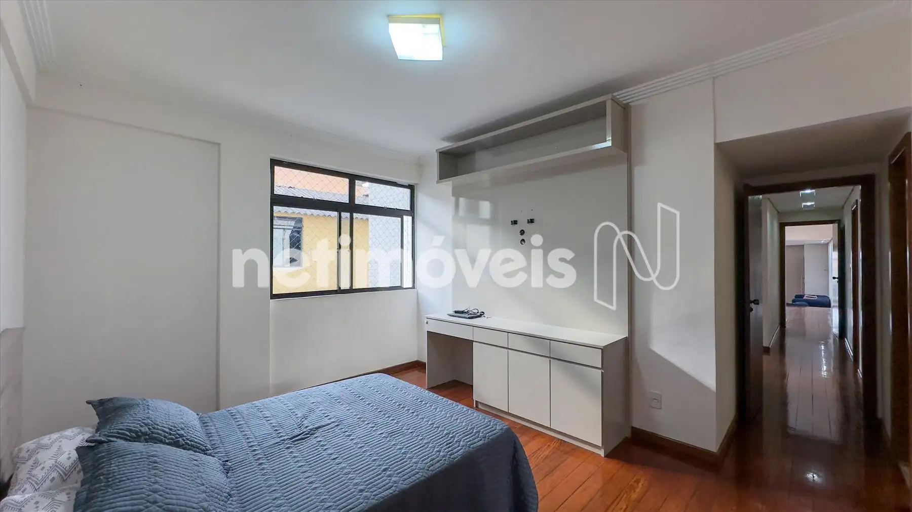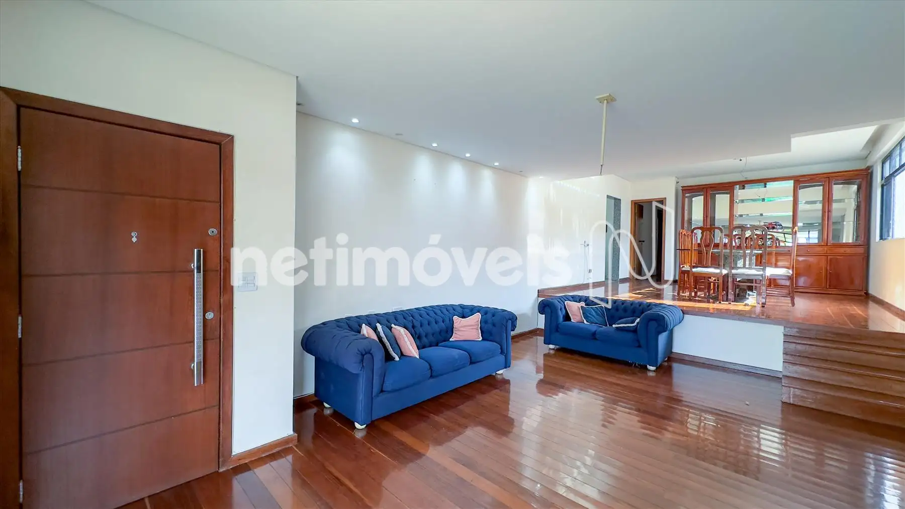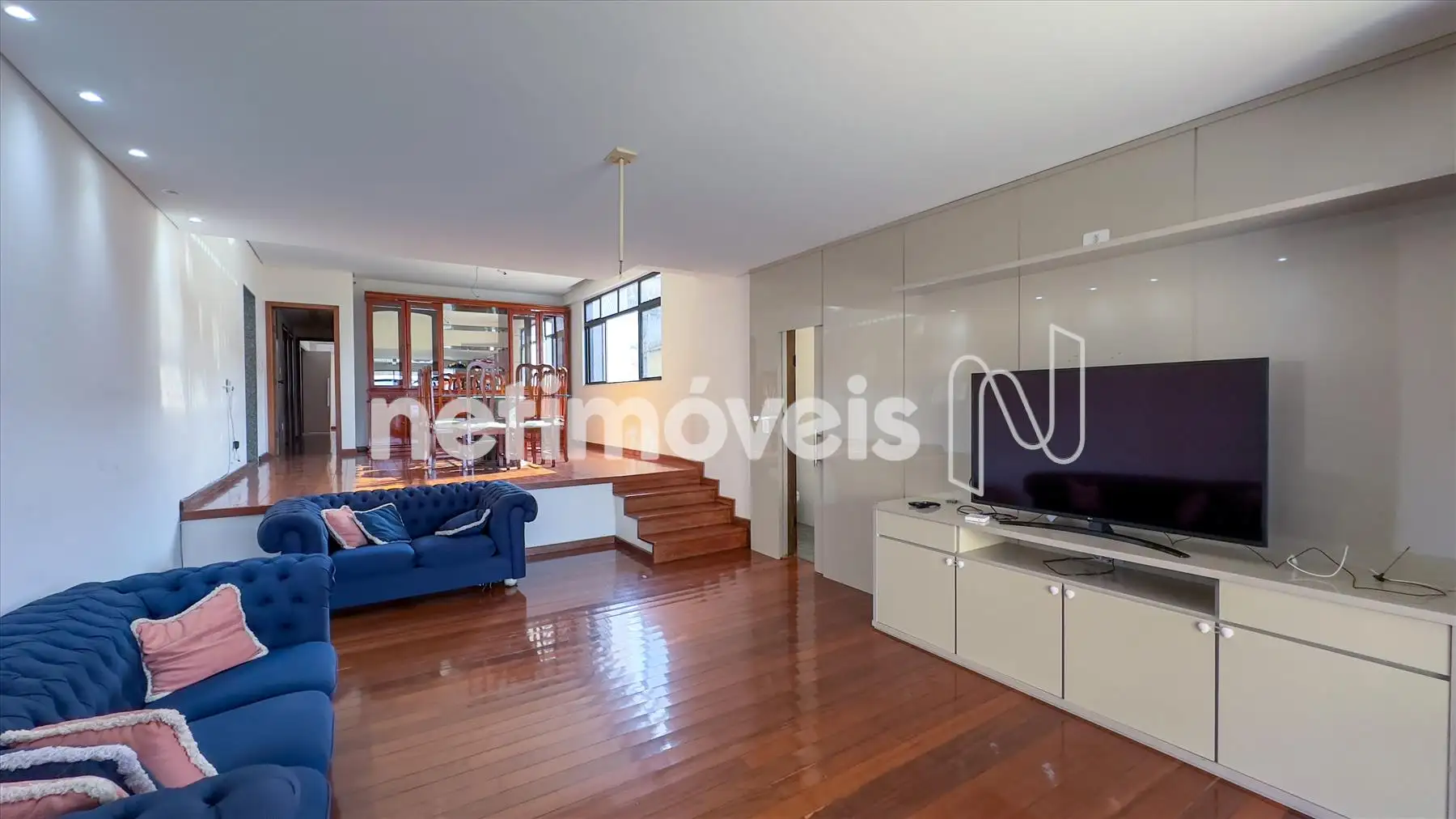 O apartamento possui ampla sala iluminada, com teto rebaixado em gesso, lavabo, banheiro social, cozinha integrada à copa, área de serviço e dependência completa de empregada. Os armários embutidos estão presentes em 4 quartos, 1 closet, na cozinha planejada e na área de serviço. O piso é de madeira corrida nas áreas sociais e íntimas e granito nos banheiros e na cozinha.