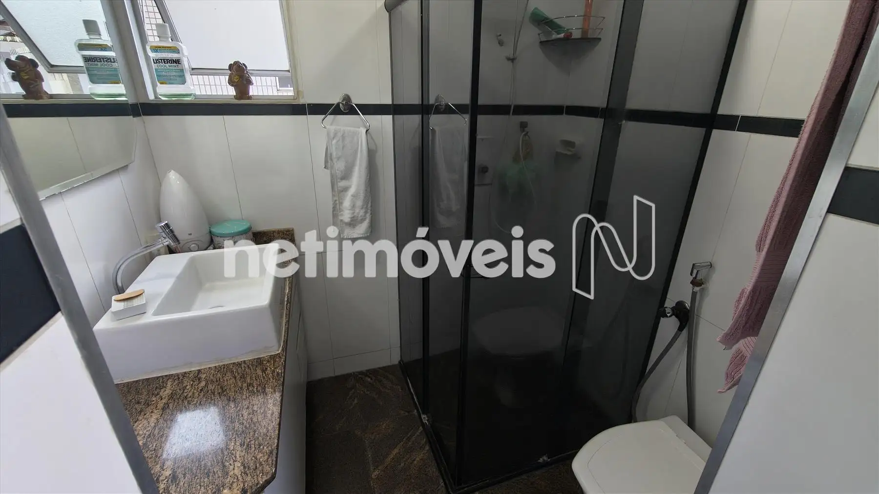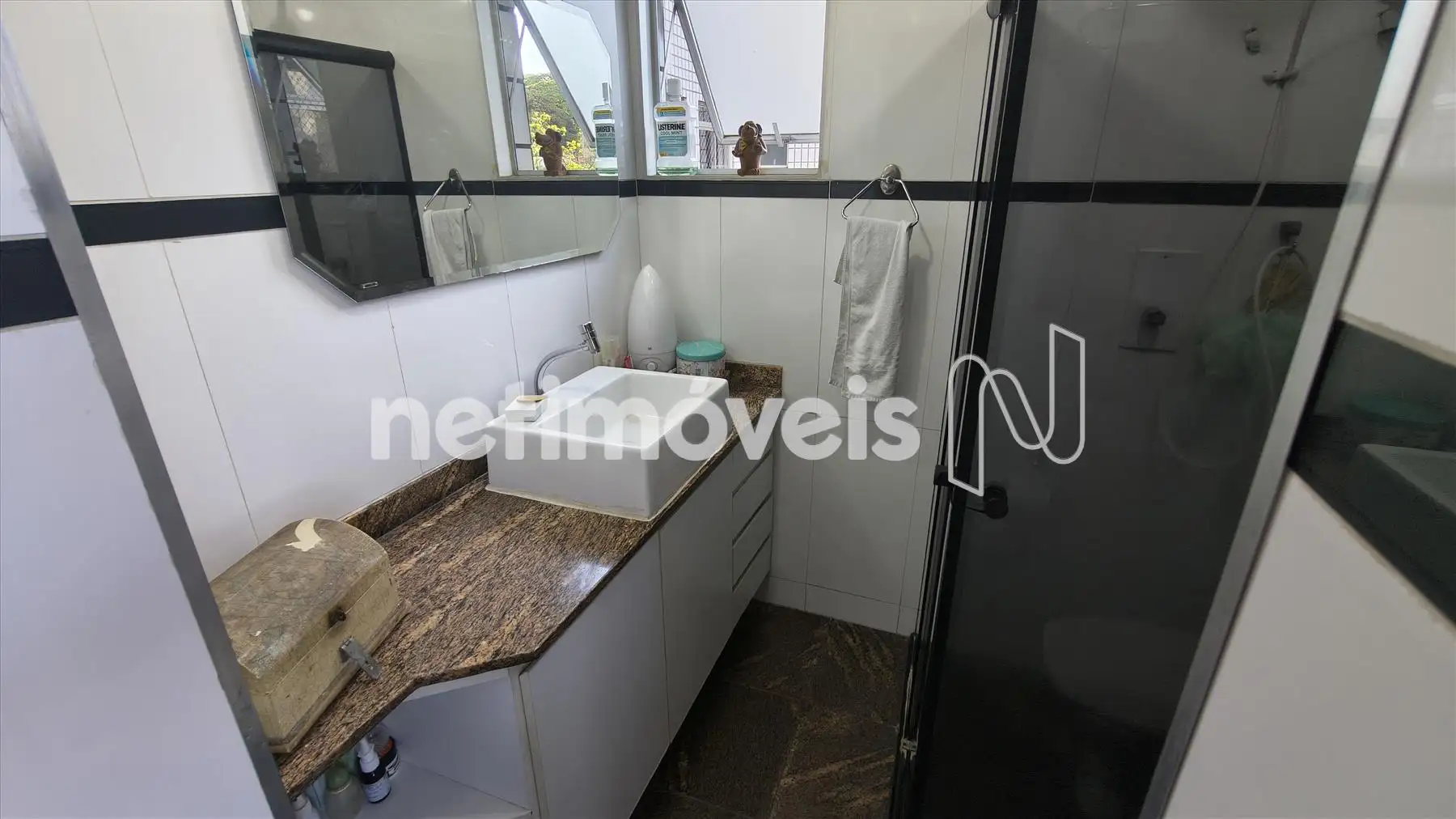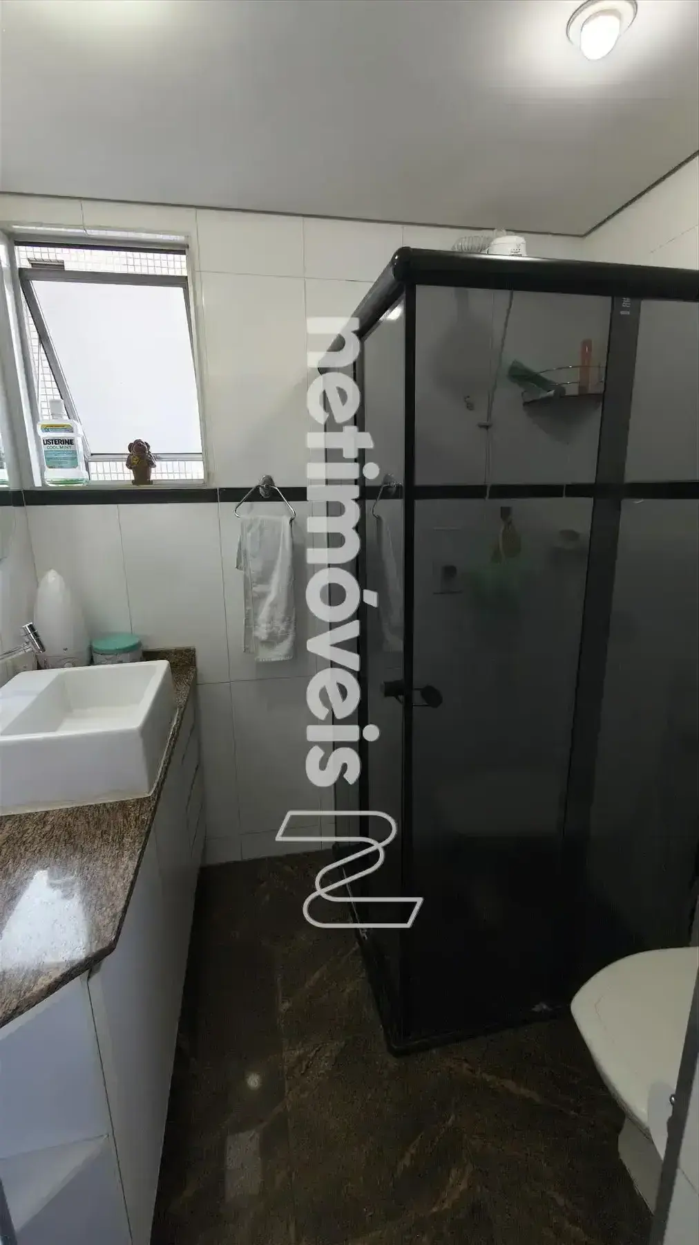 Banheiros social e suíte com piso e bancadas em granito, armários e box.