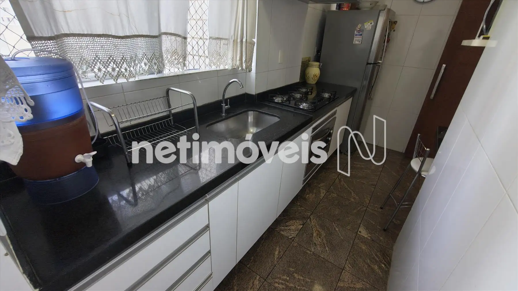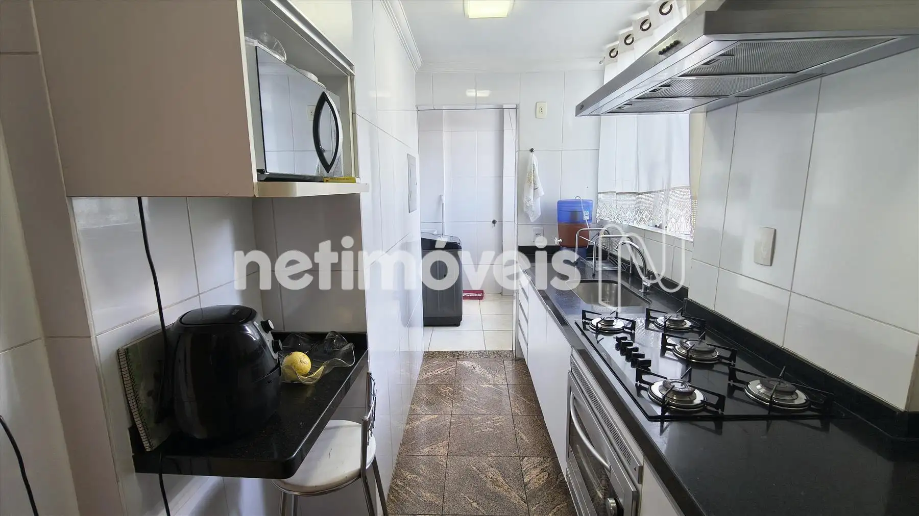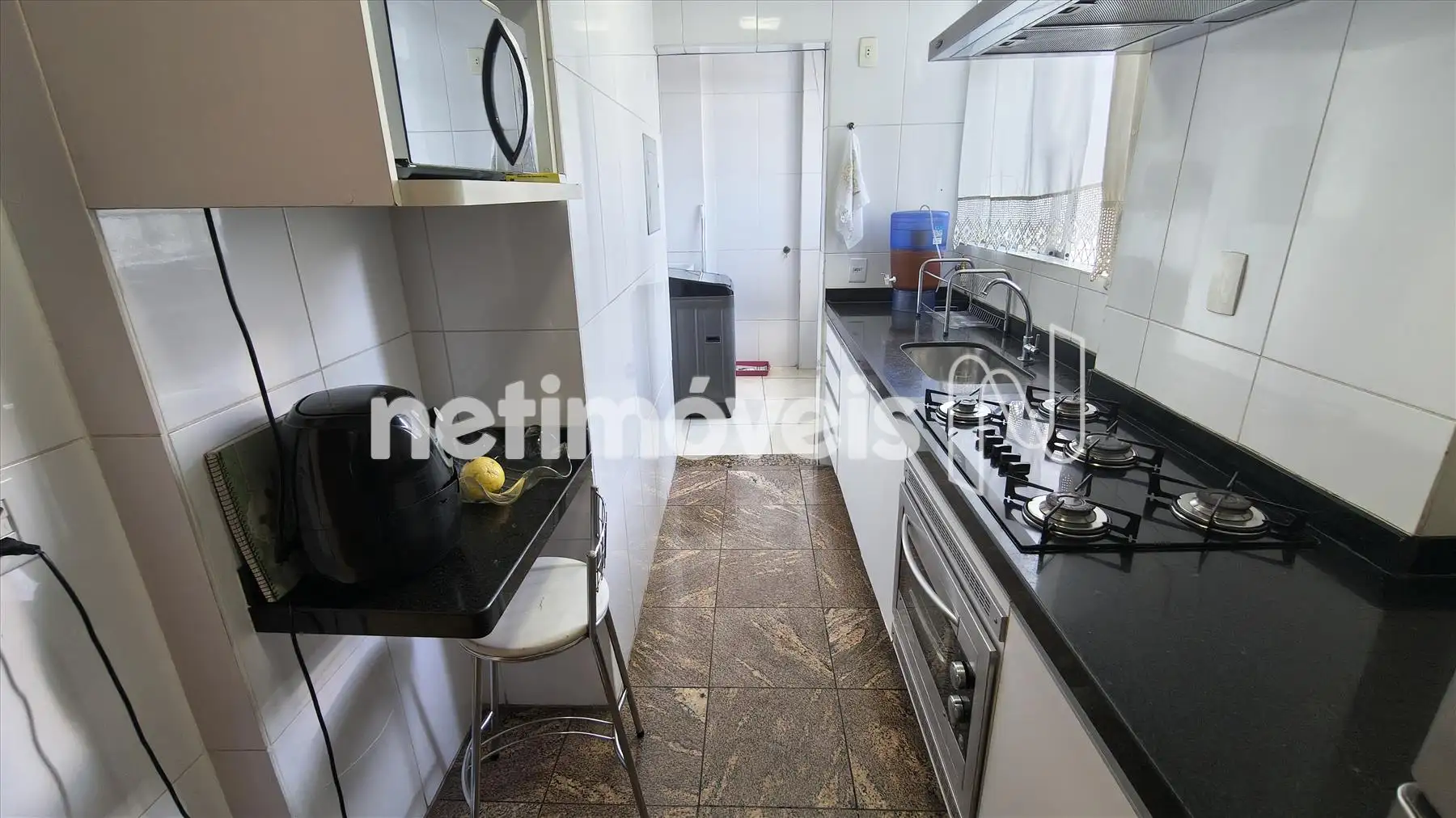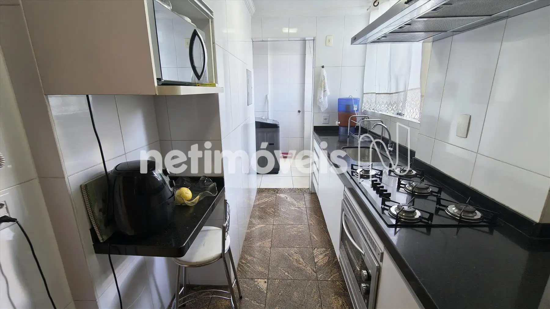 Cozinha clara e arejada com piso e bancadas em granito além de muitos armários.
