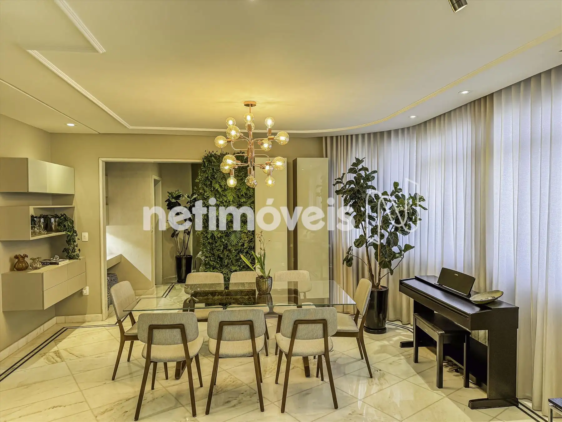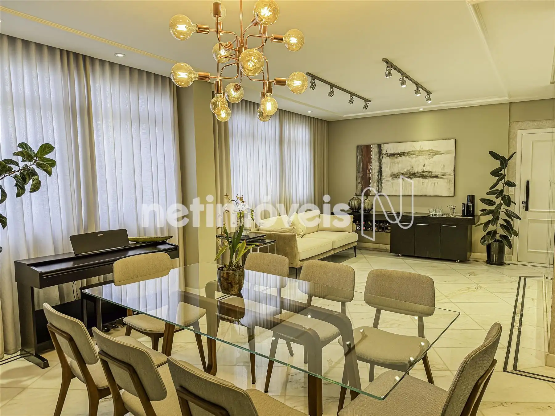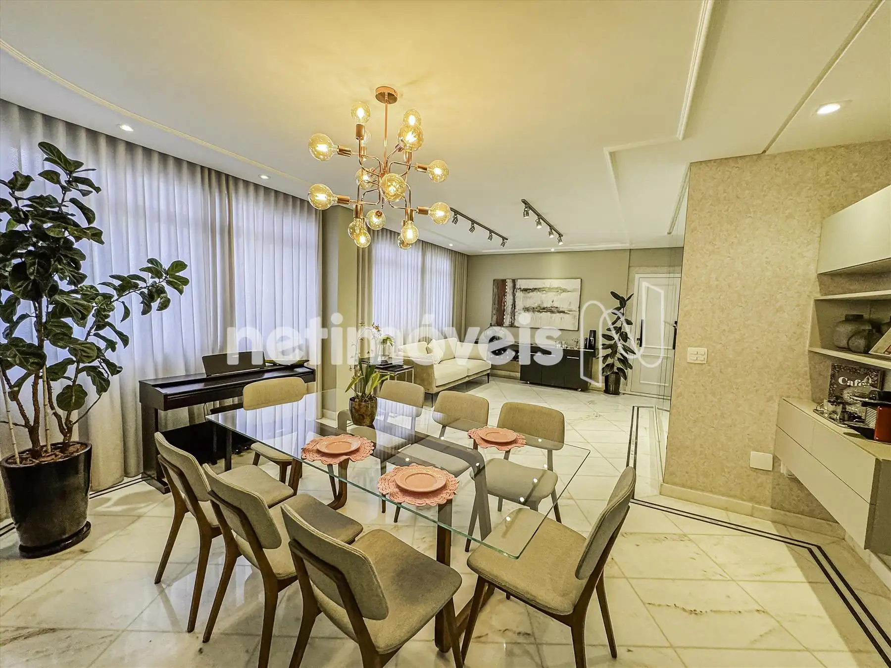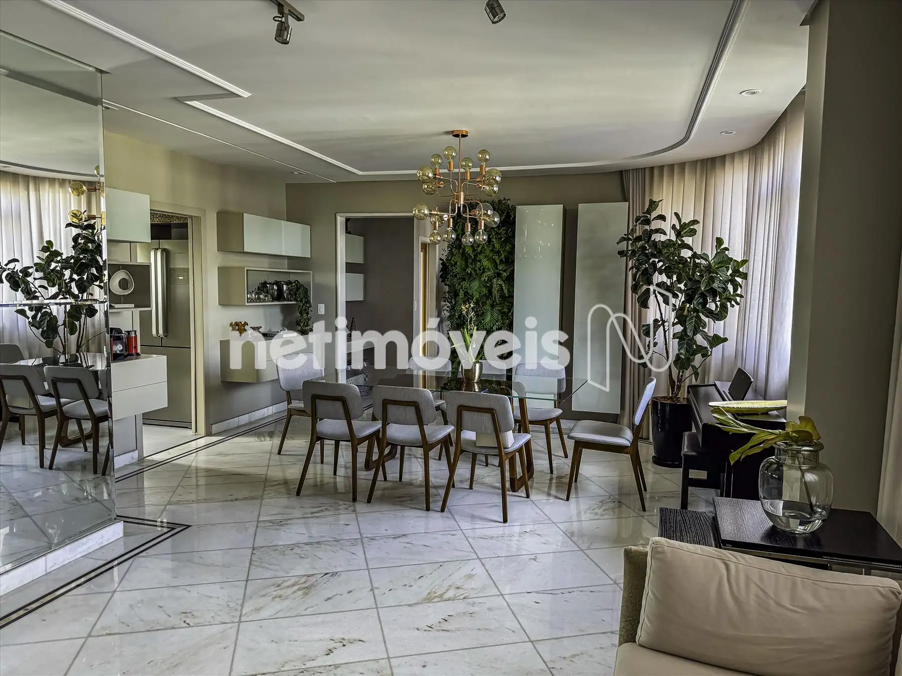 2 salas amplas, claras e arejadas, com parede de espelho, estante com adega e projeto luminotécnico em gesso;