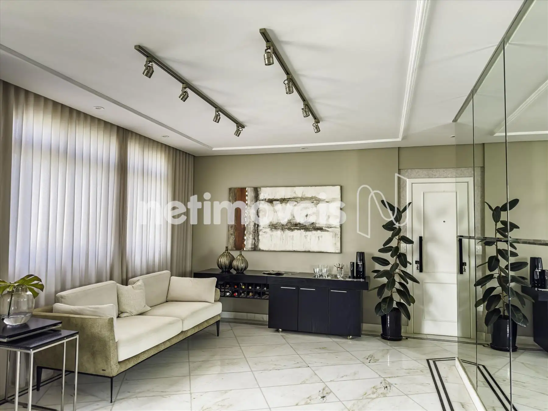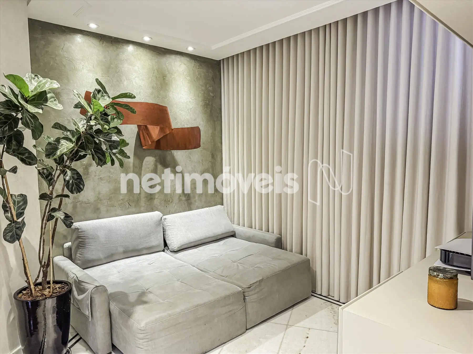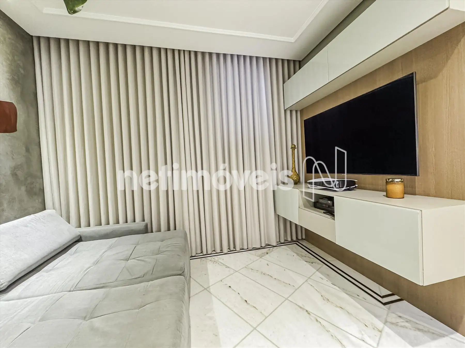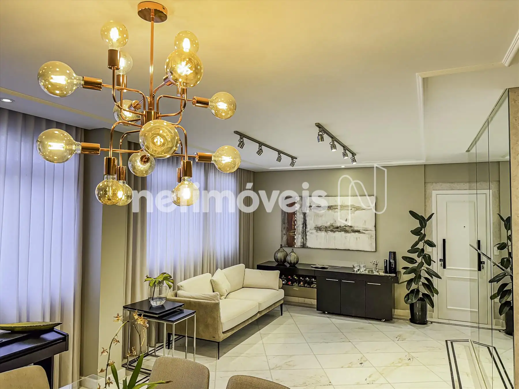 2 salas amplas, claras e arejadas, com parede de espelho, estante com adega e projeto luminotécnico em gesso;