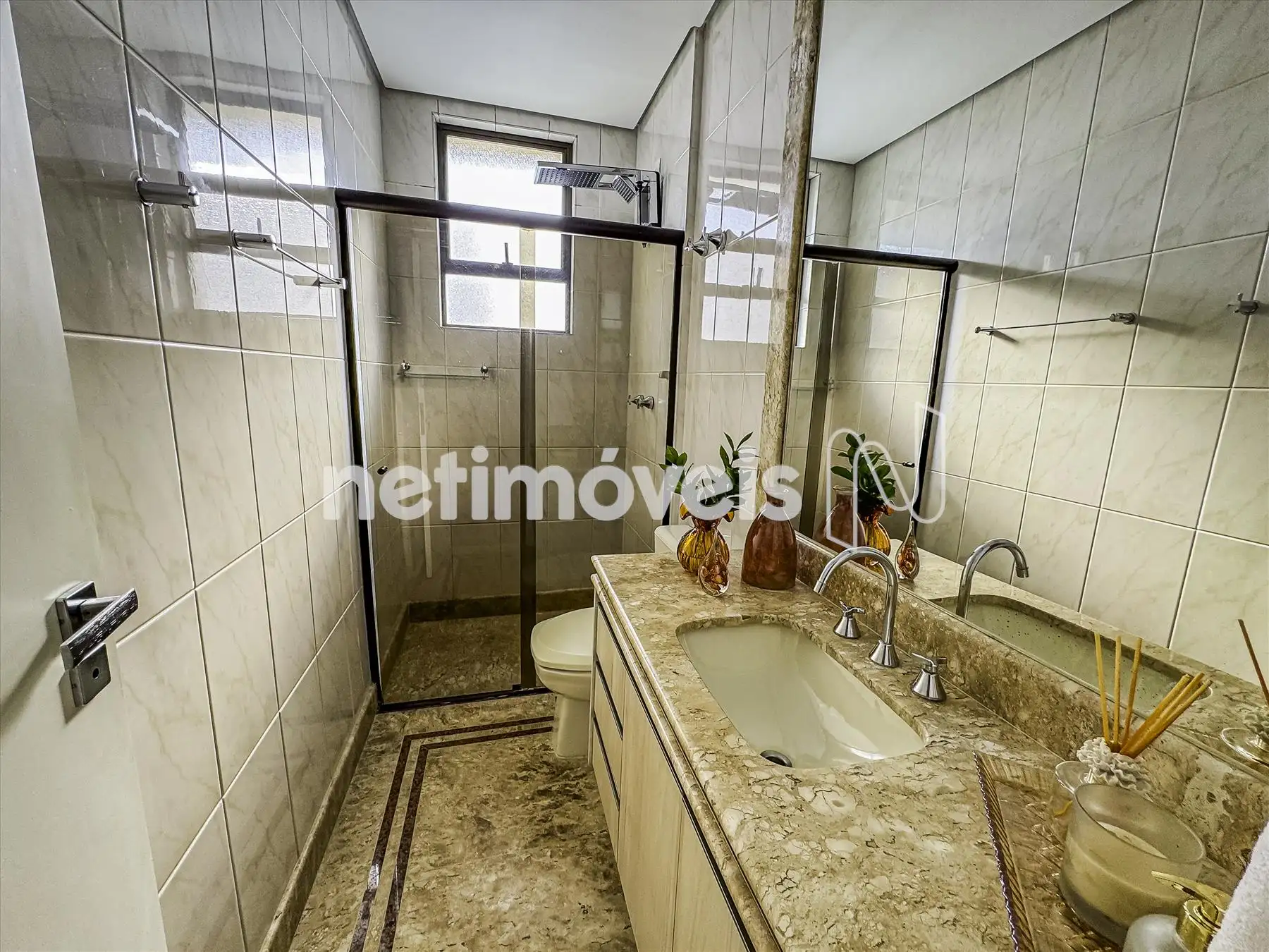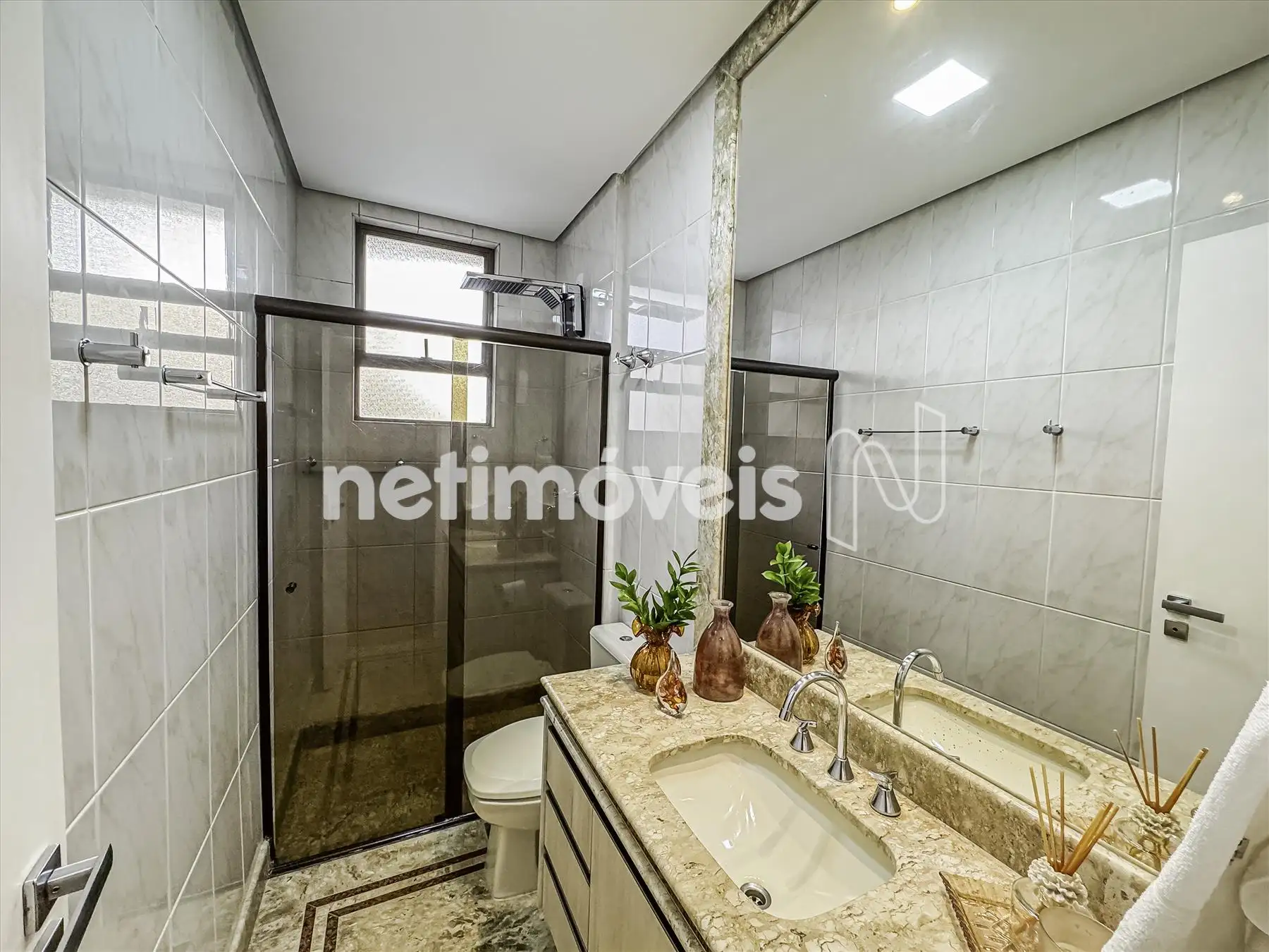 Banho social com bancada em mármore carrara, armários e box;