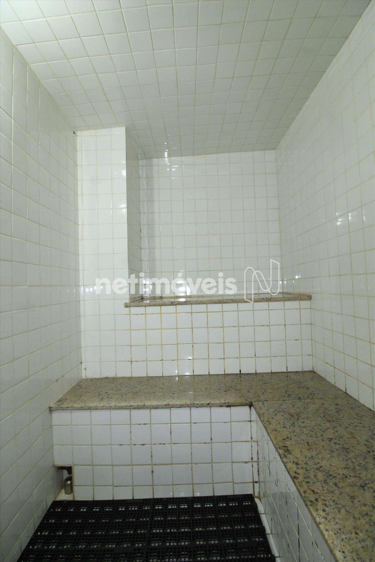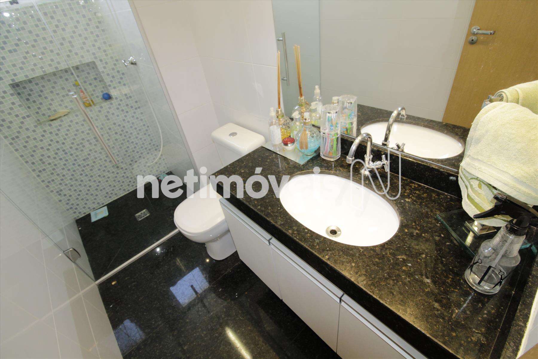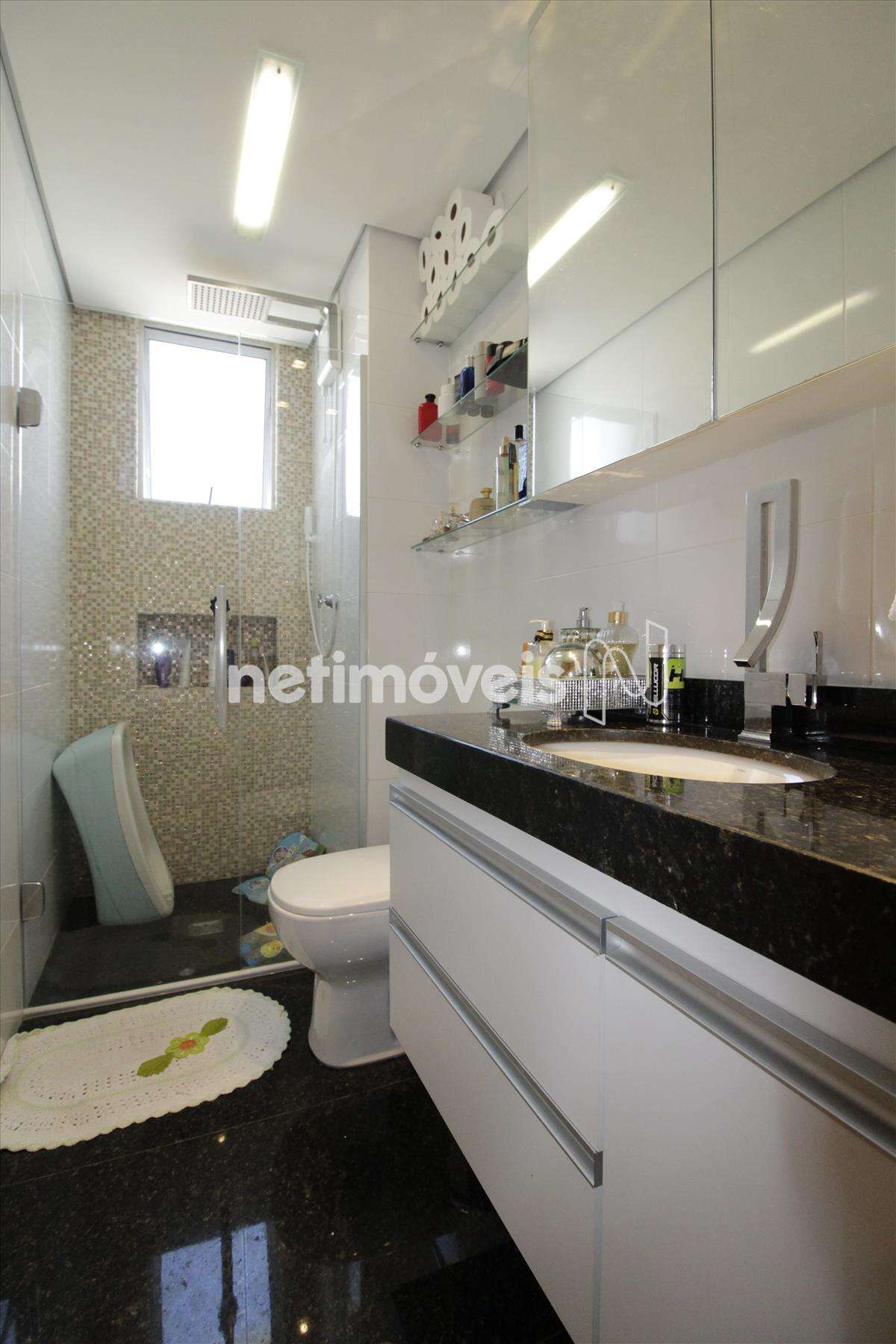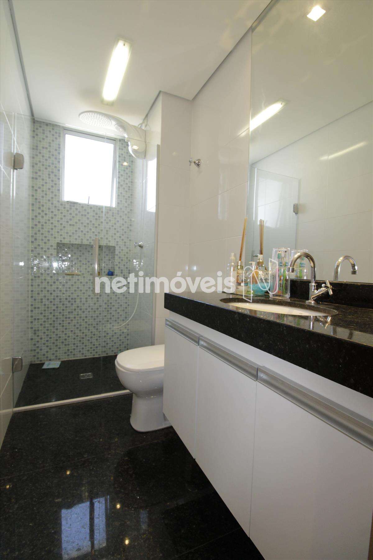 Banho socila e suíte com armários, piso e bancada em granito, box e espelho.