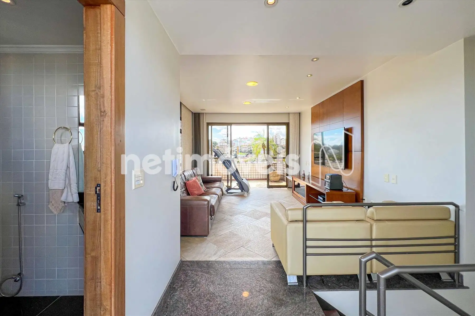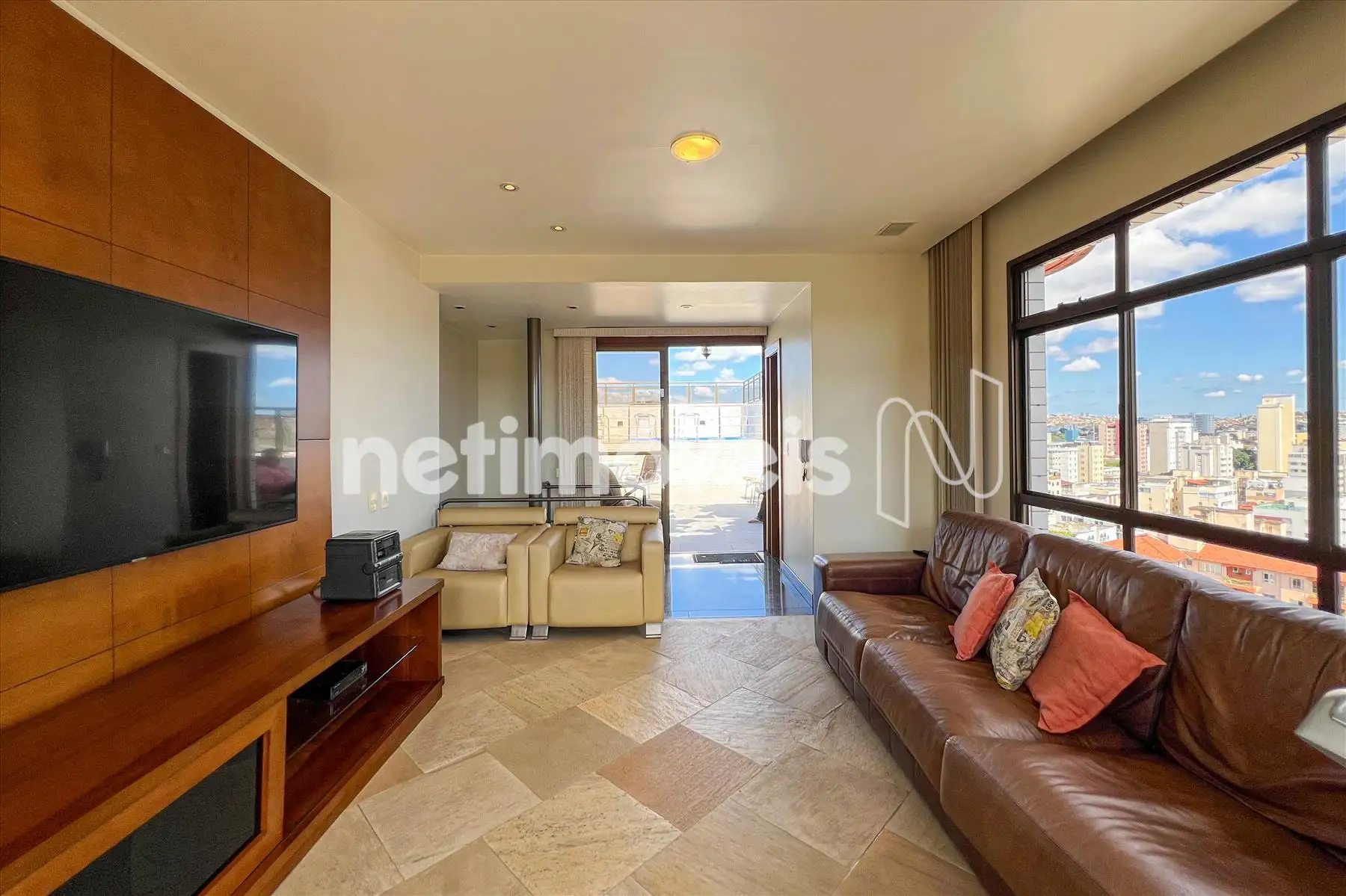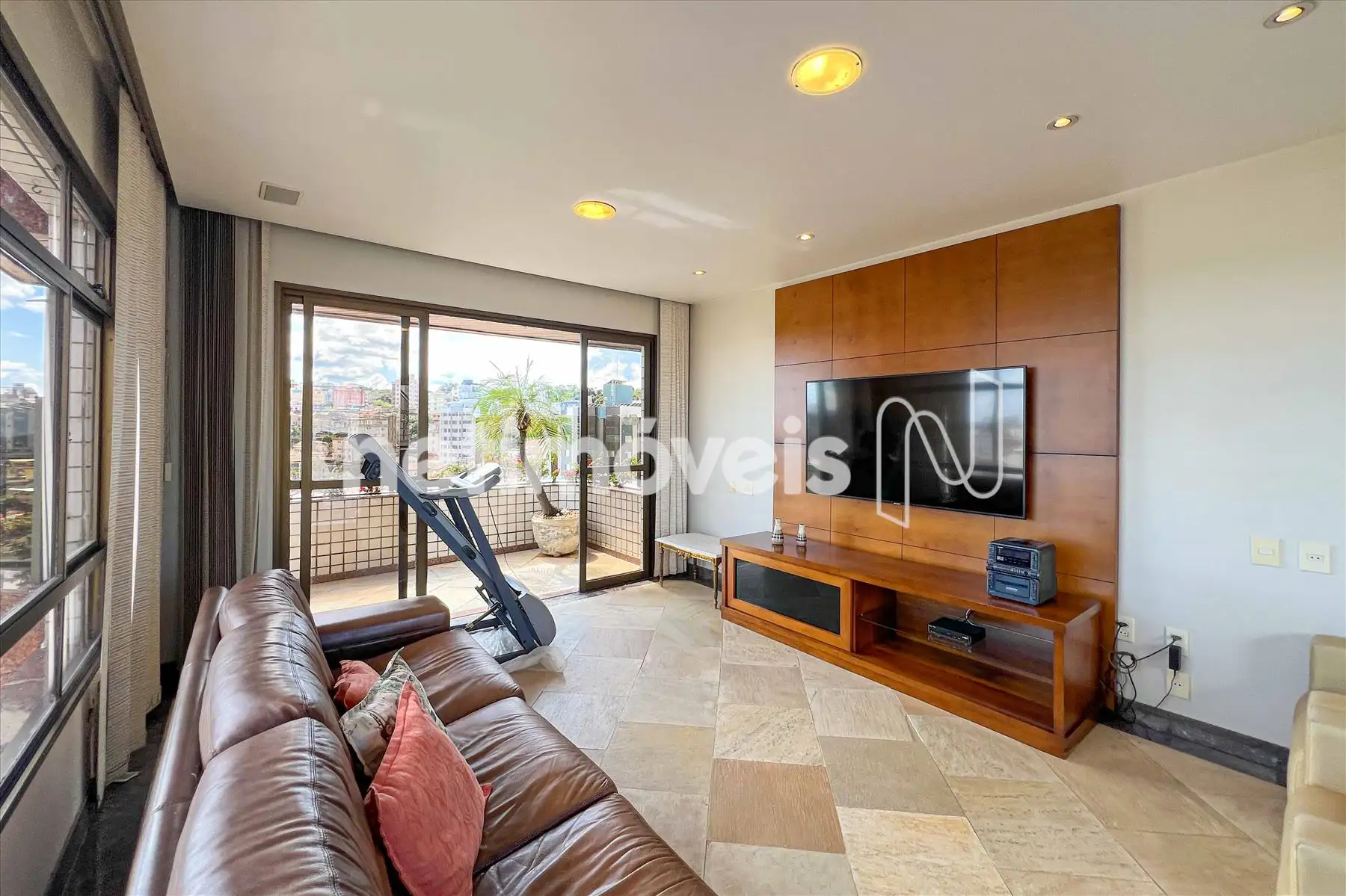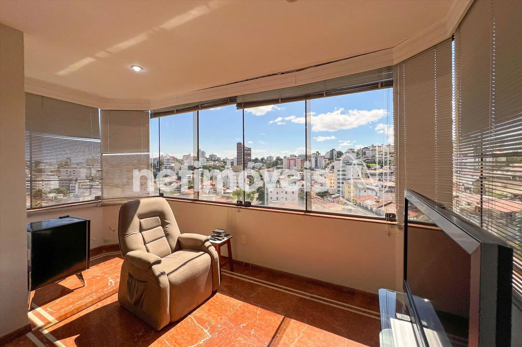 Sala de Estar: Sala de TV com piso em granito integrada a uma varanda charmosa com vista panorâmica da cidade.