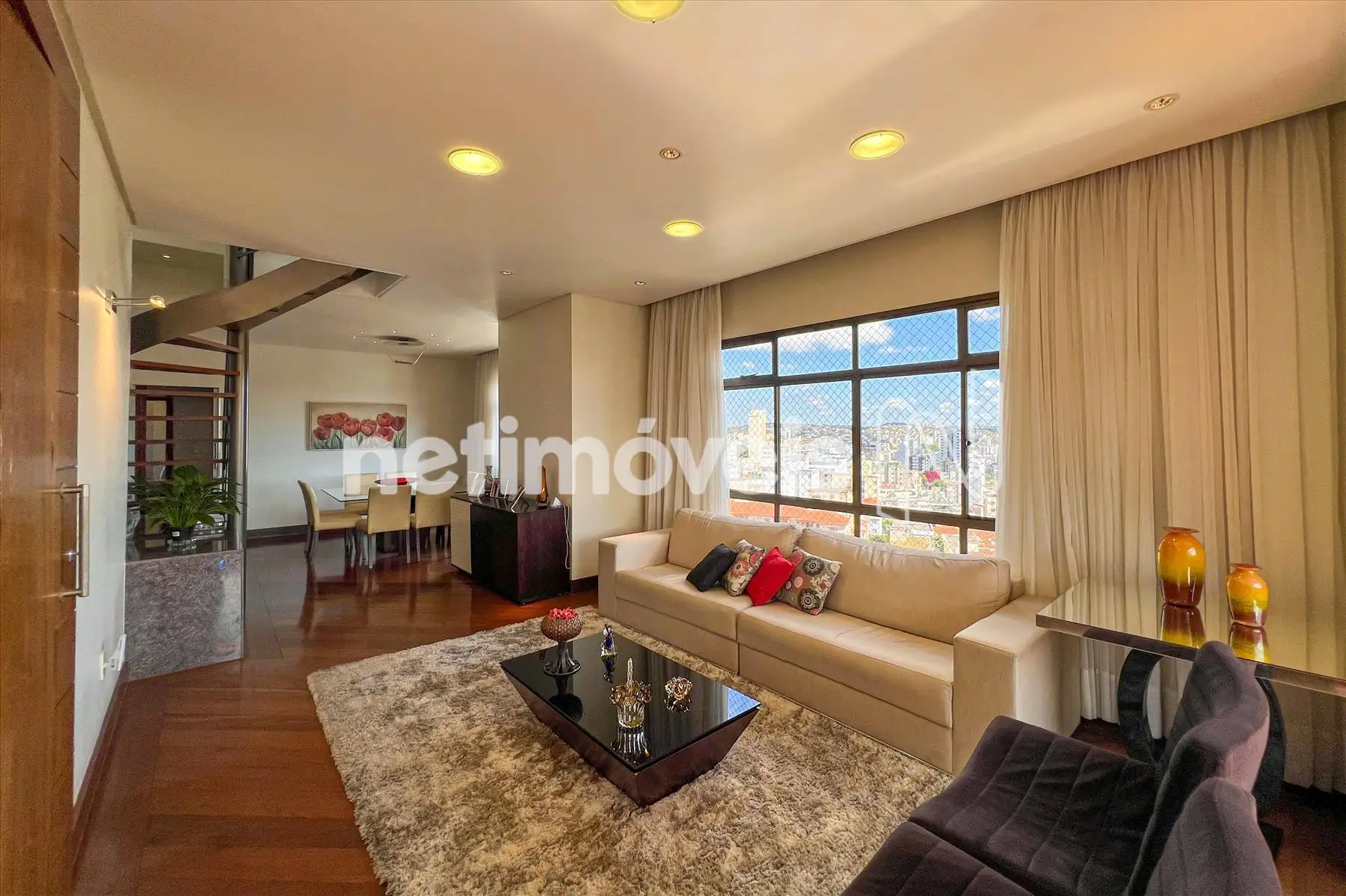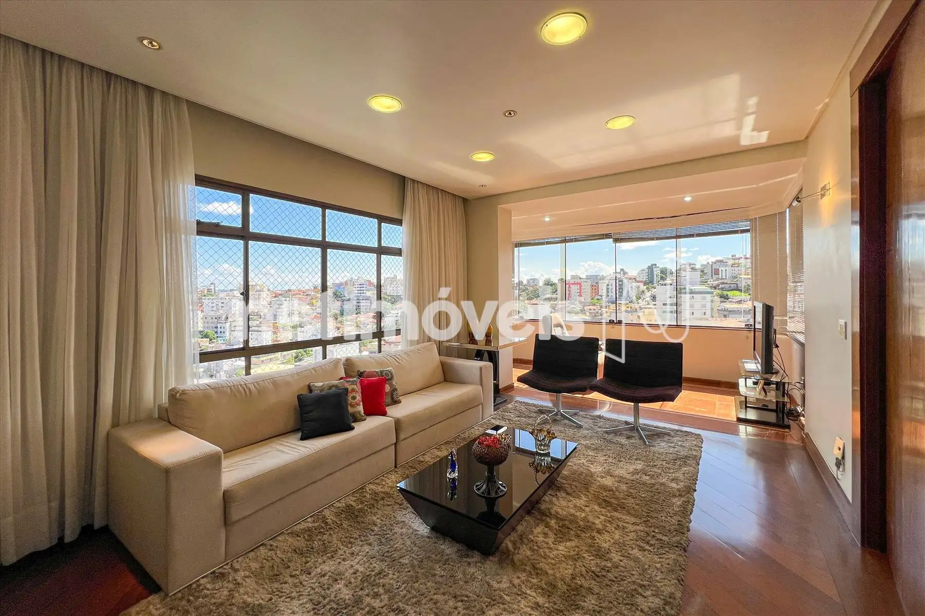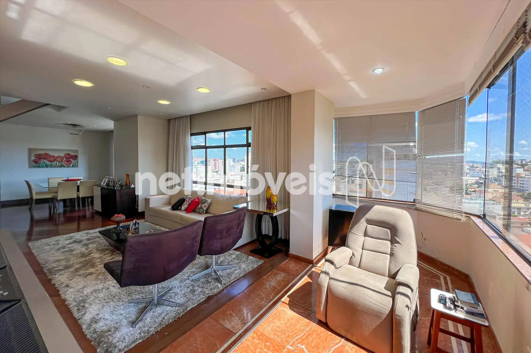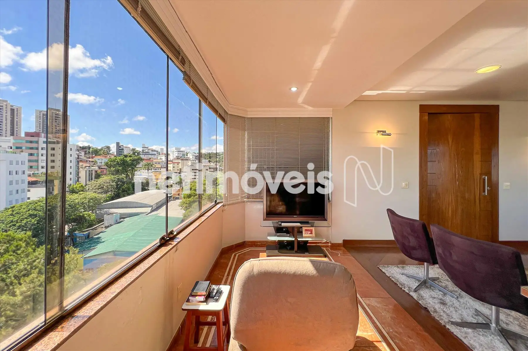 Área Social: Sala ampla com varanda incorporada e fechamento em blindex, garantindo luz natural e sofisticação.