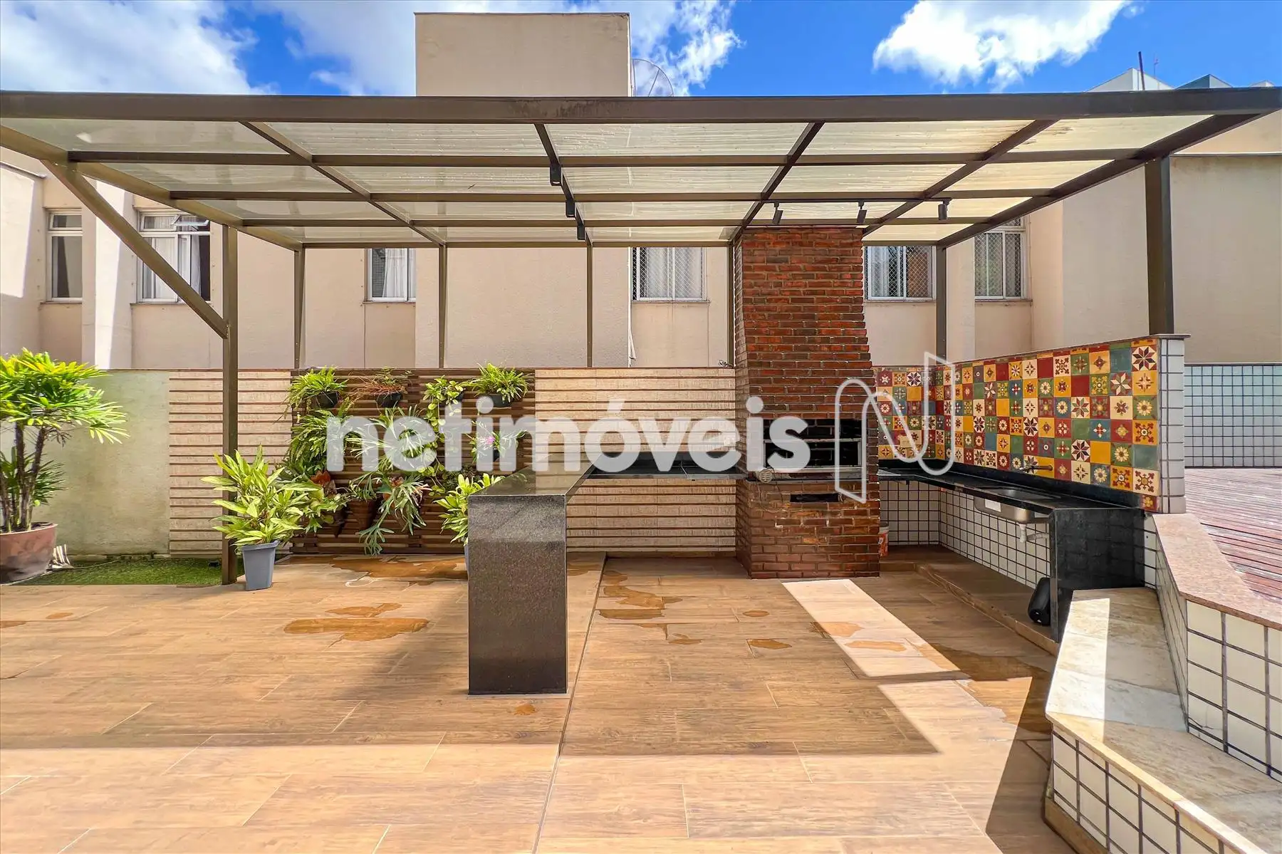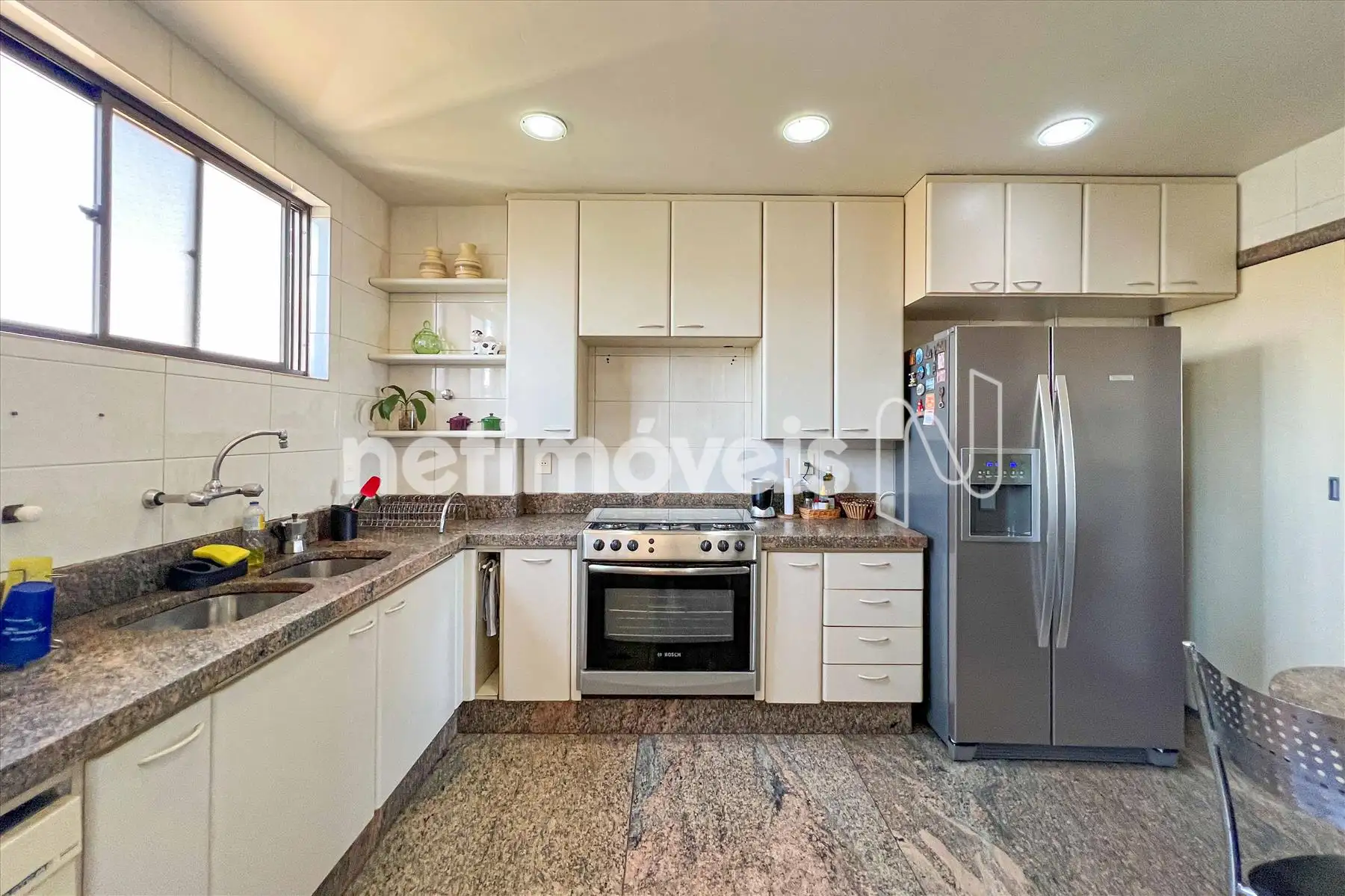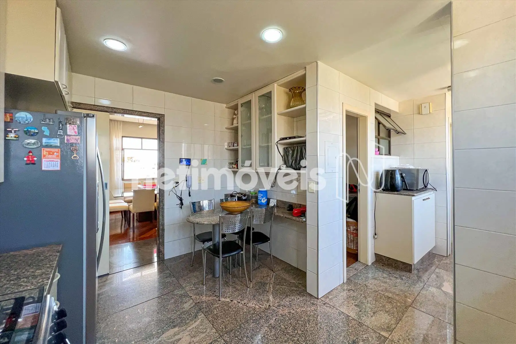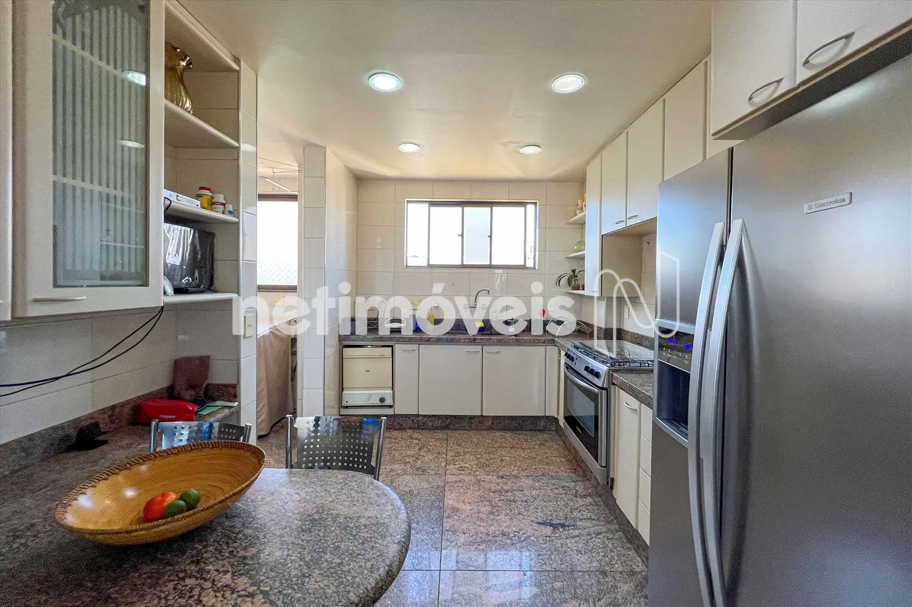 Acabamento: Banheiros e cozinha com pisos e bancadas em granito; área de serviço independente.