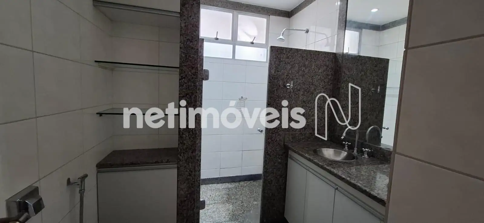 Banho social : armários planejados, bancada em granito, fechamento do box em granito e porta em blindex.