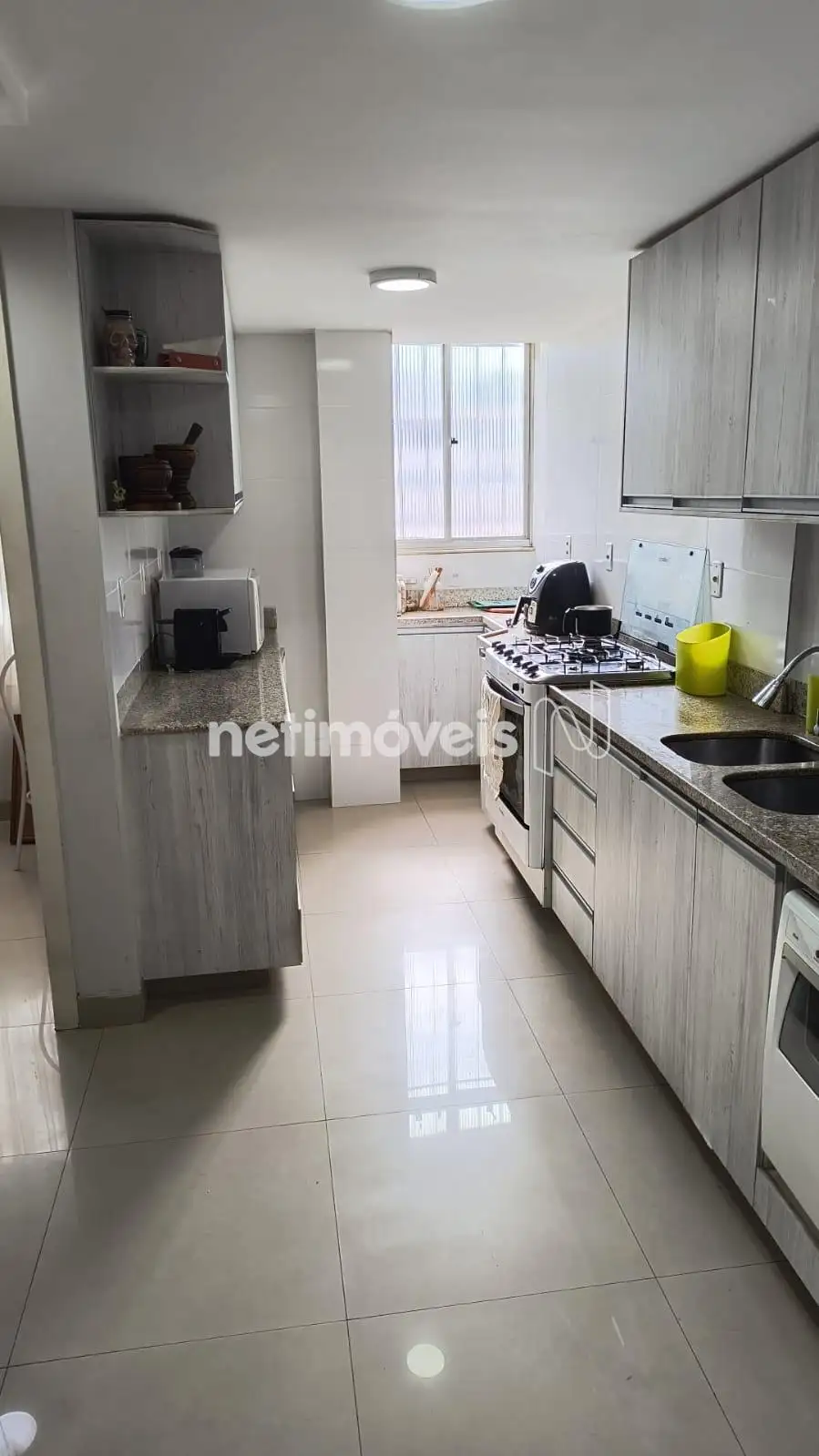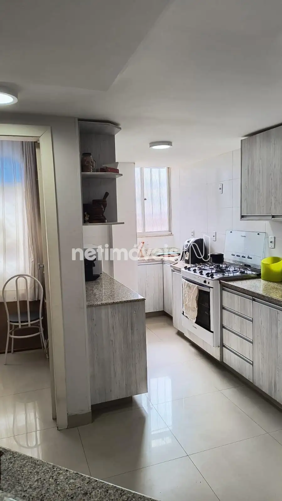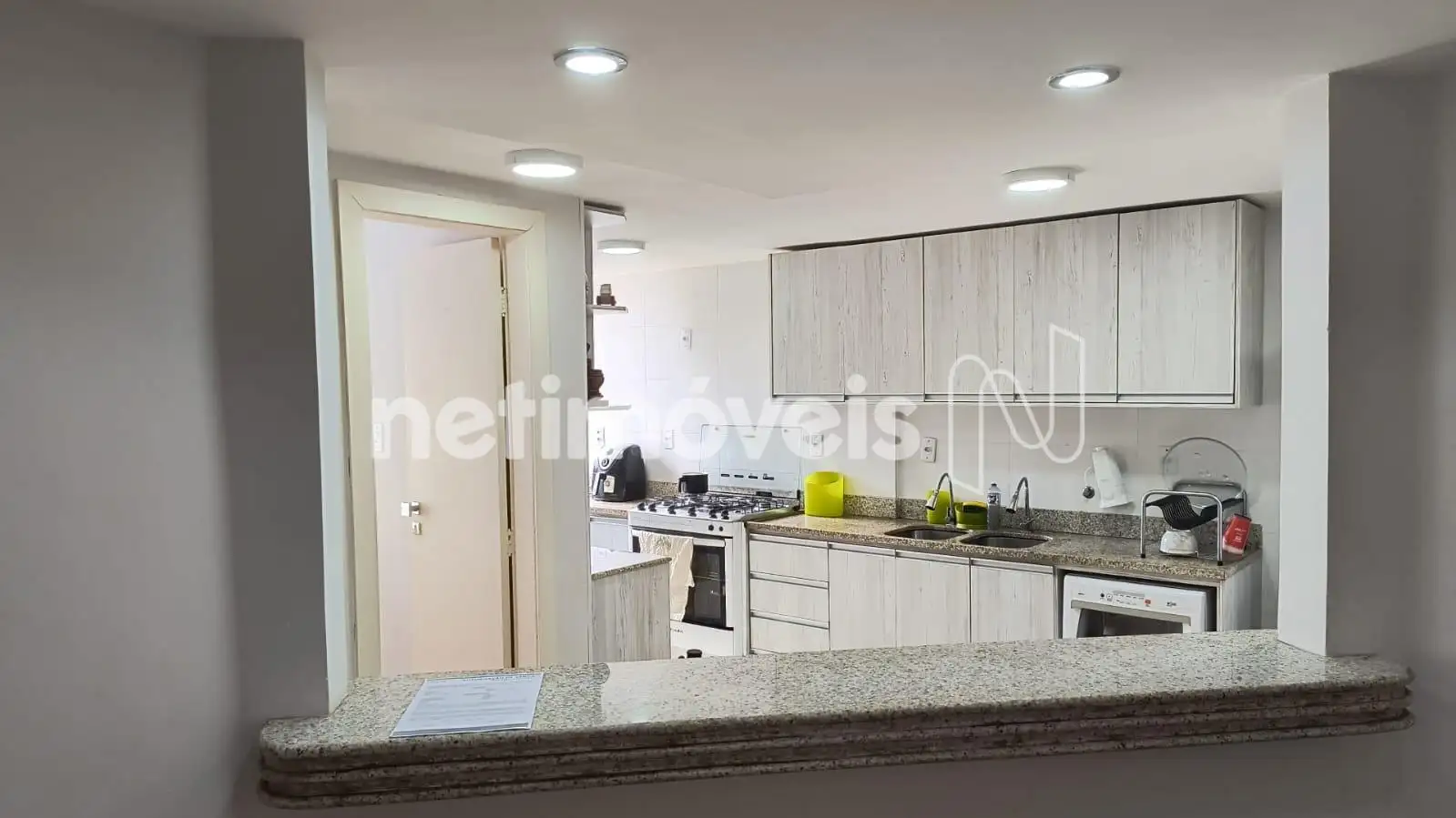 Cozinha americana com armários, piso e bancada em granito;