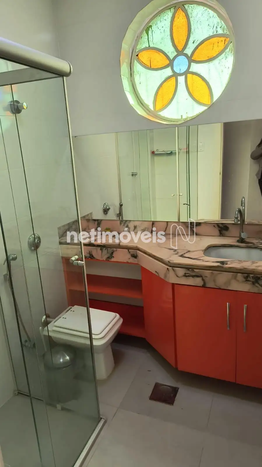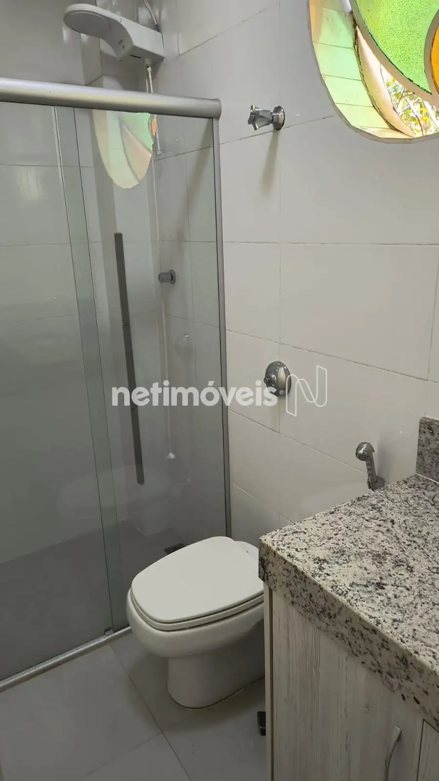 Banheiro social com armários e box em blindex;