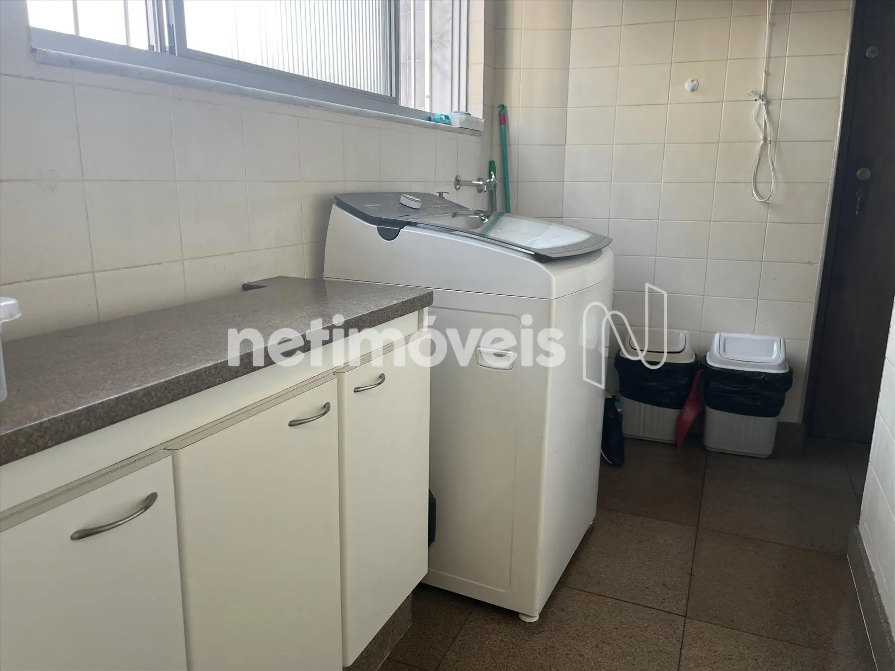 * Área de serviços com armário e bancada em granito para passar roupa.