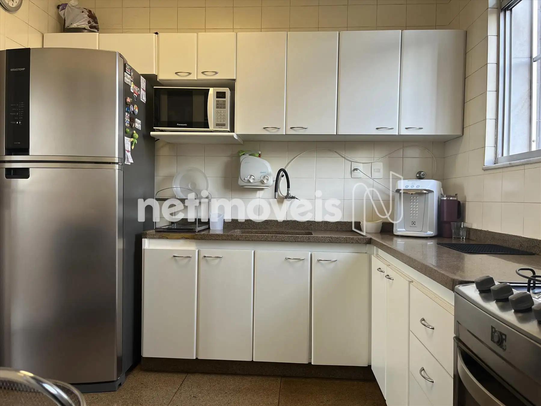 * Cozinha com piso e bancada de granito sob e sobre as bancadas, há espaço com mesa para lanches.