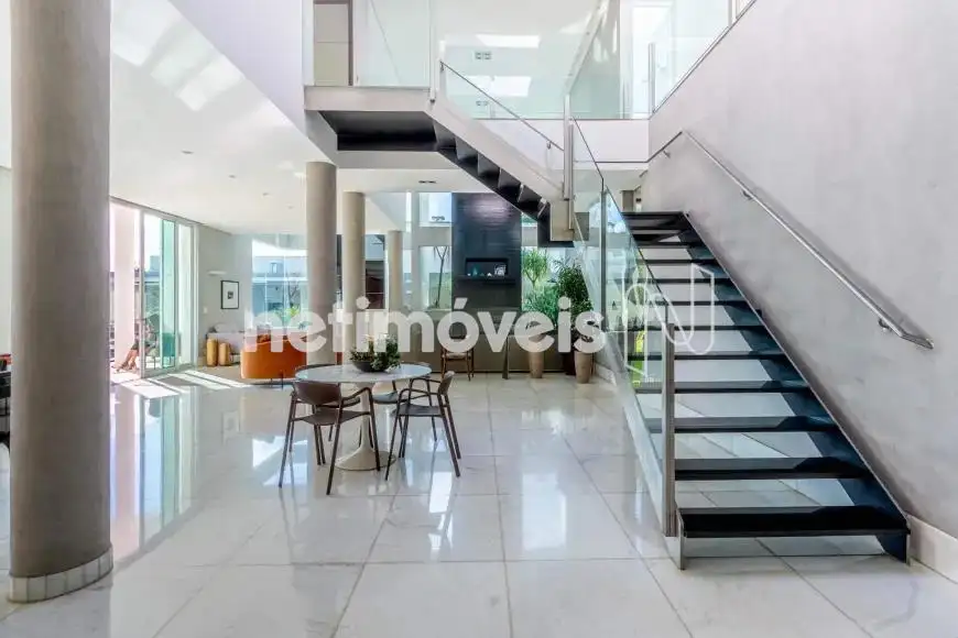 - Salas de estar e jantar elegantes e integradas com pé-direito duplo, piso em mármore, lareira e grandes aberturas para entrada de luz natural