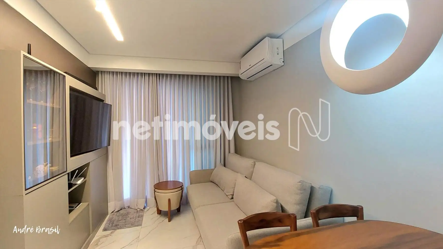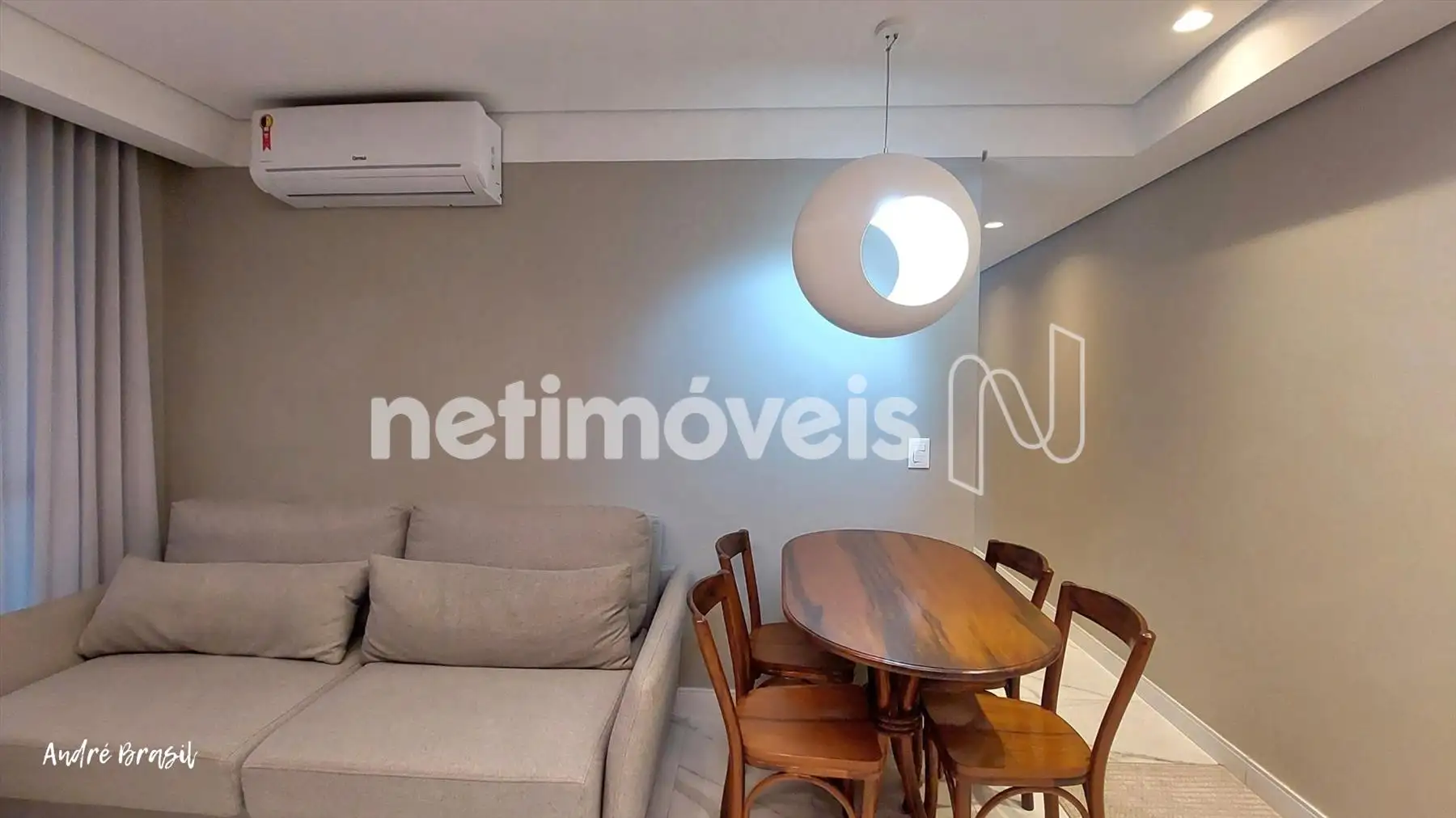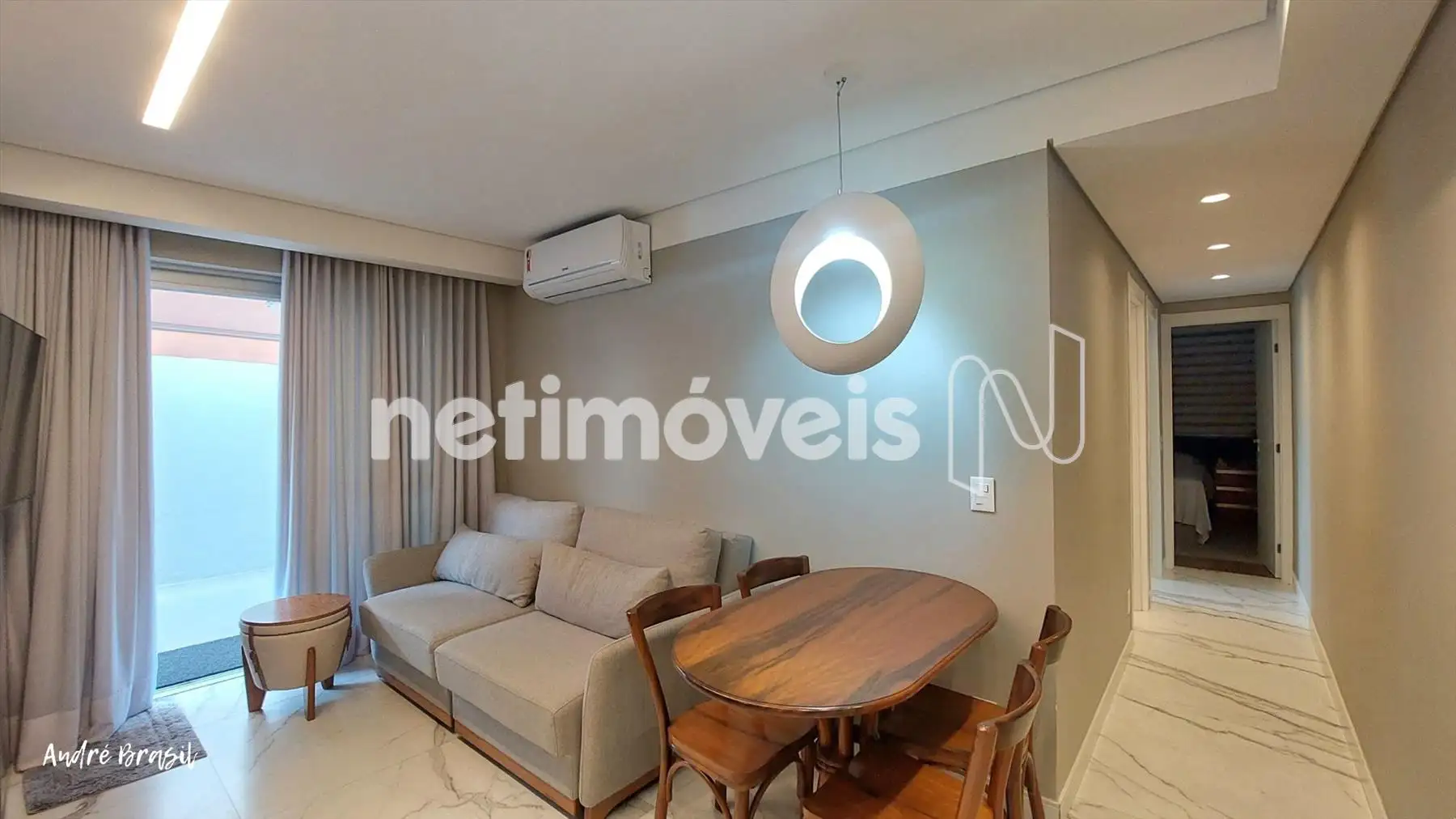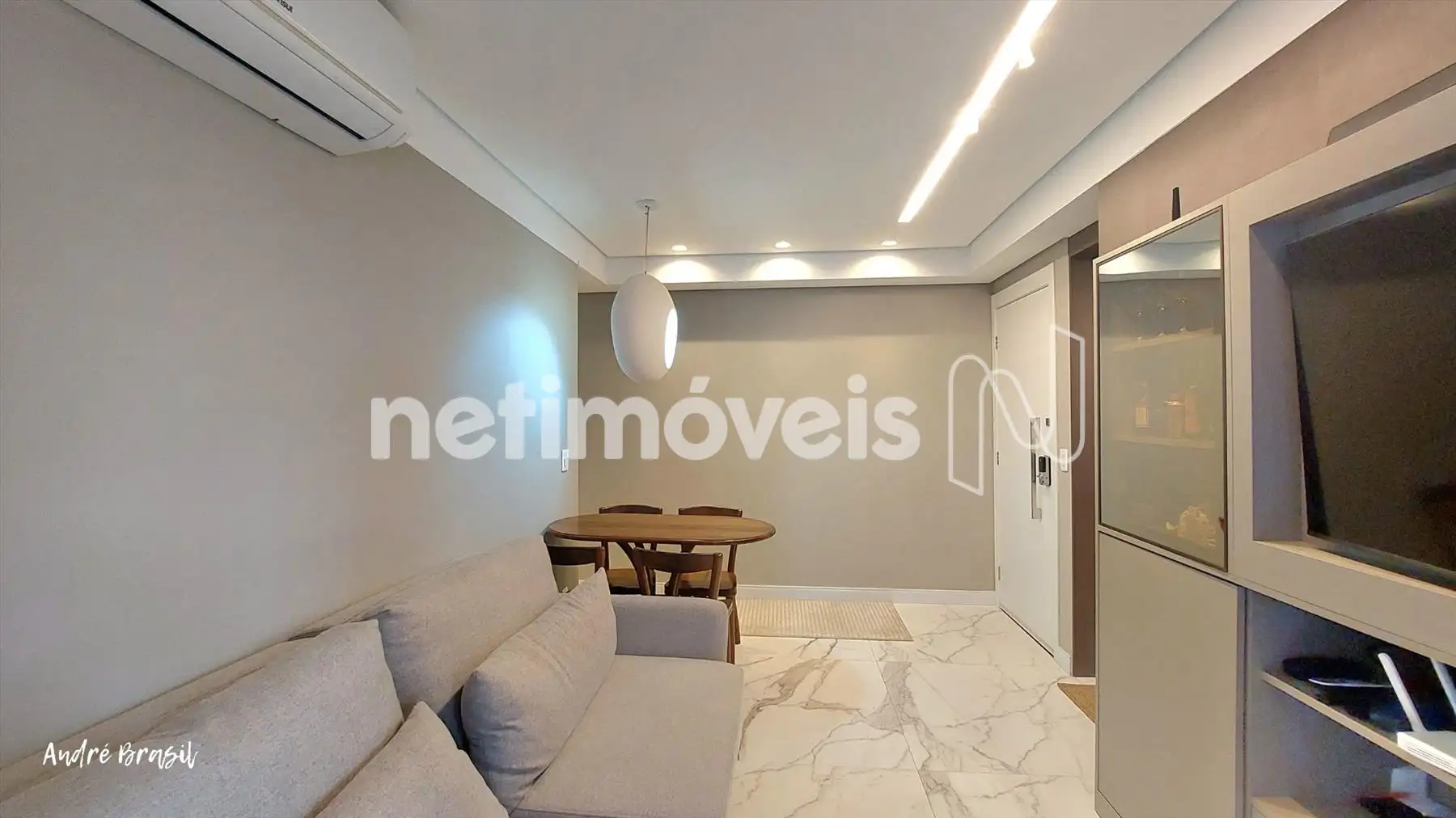 Sala para 2 ambientes com piso em porcelanato e ar condicionado;