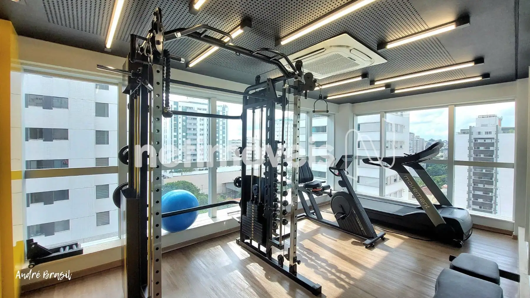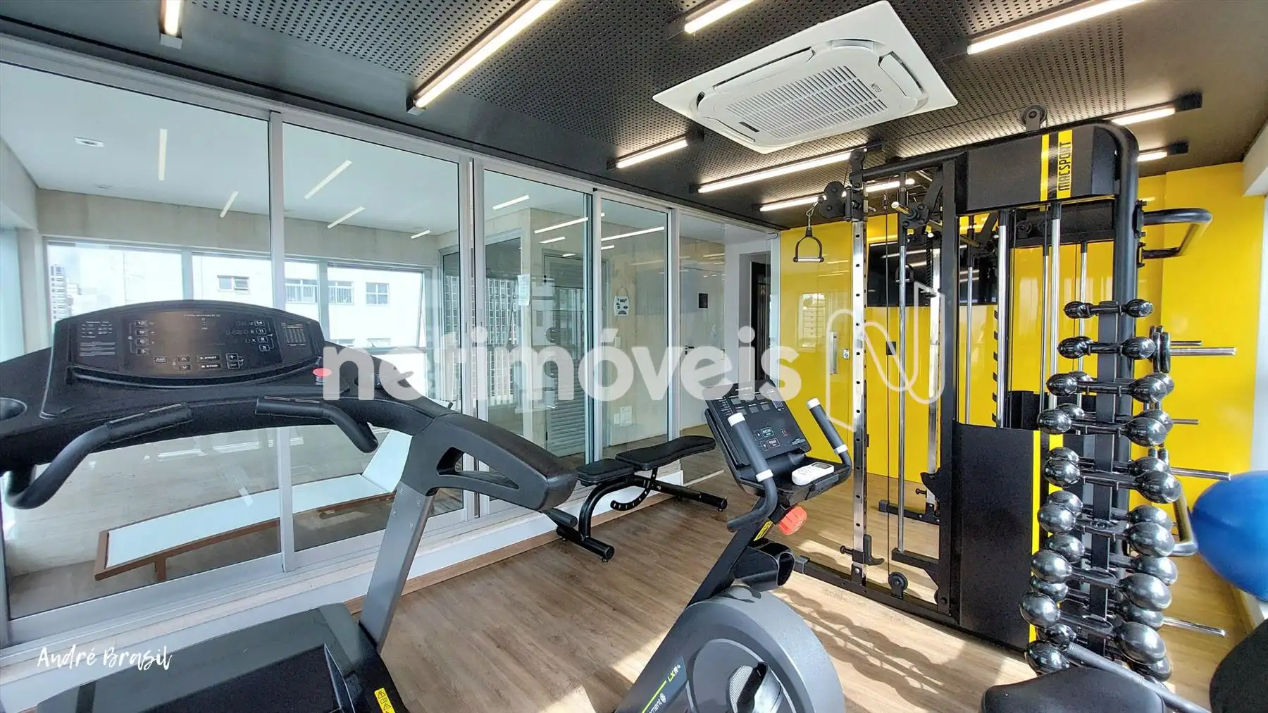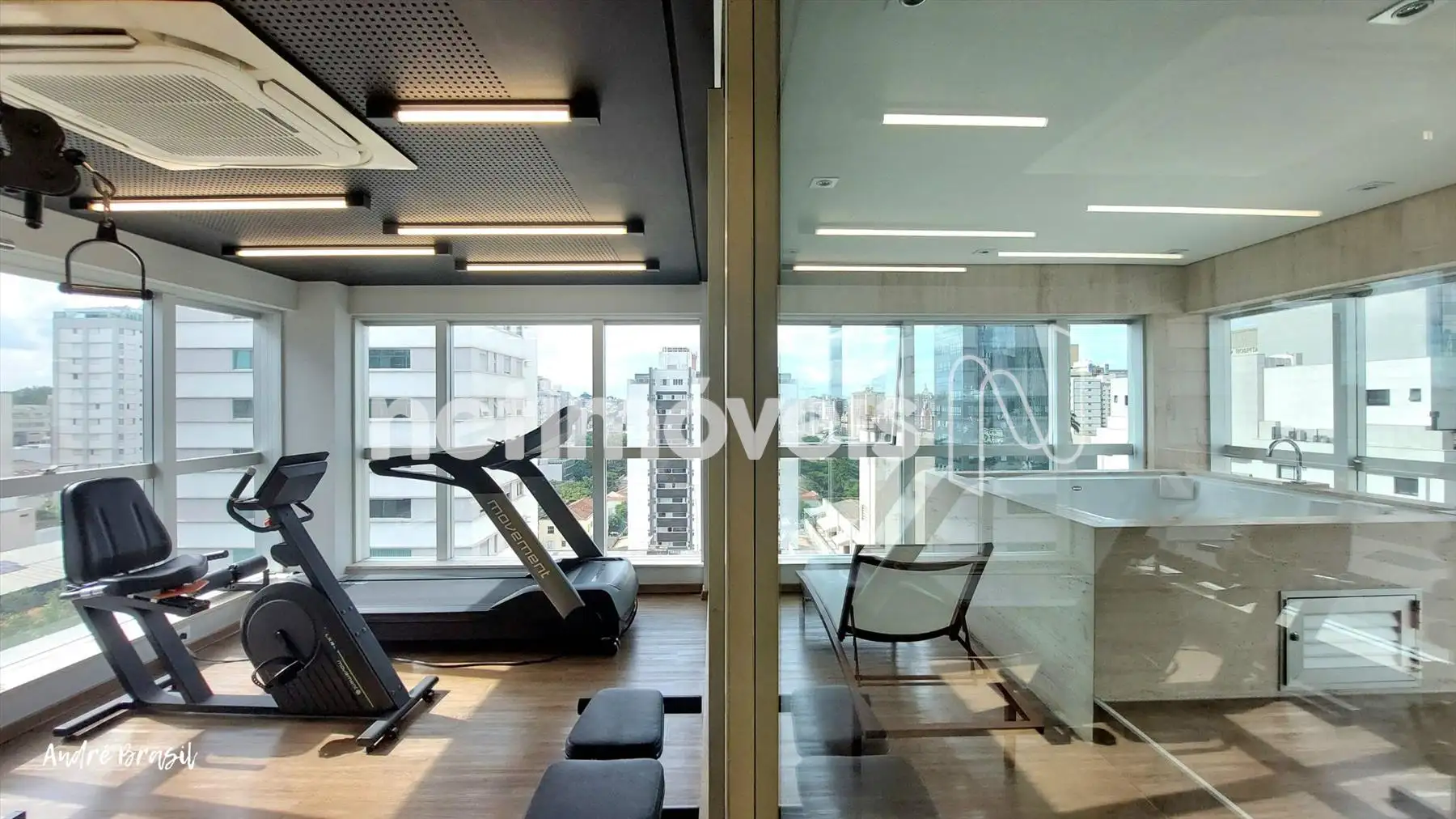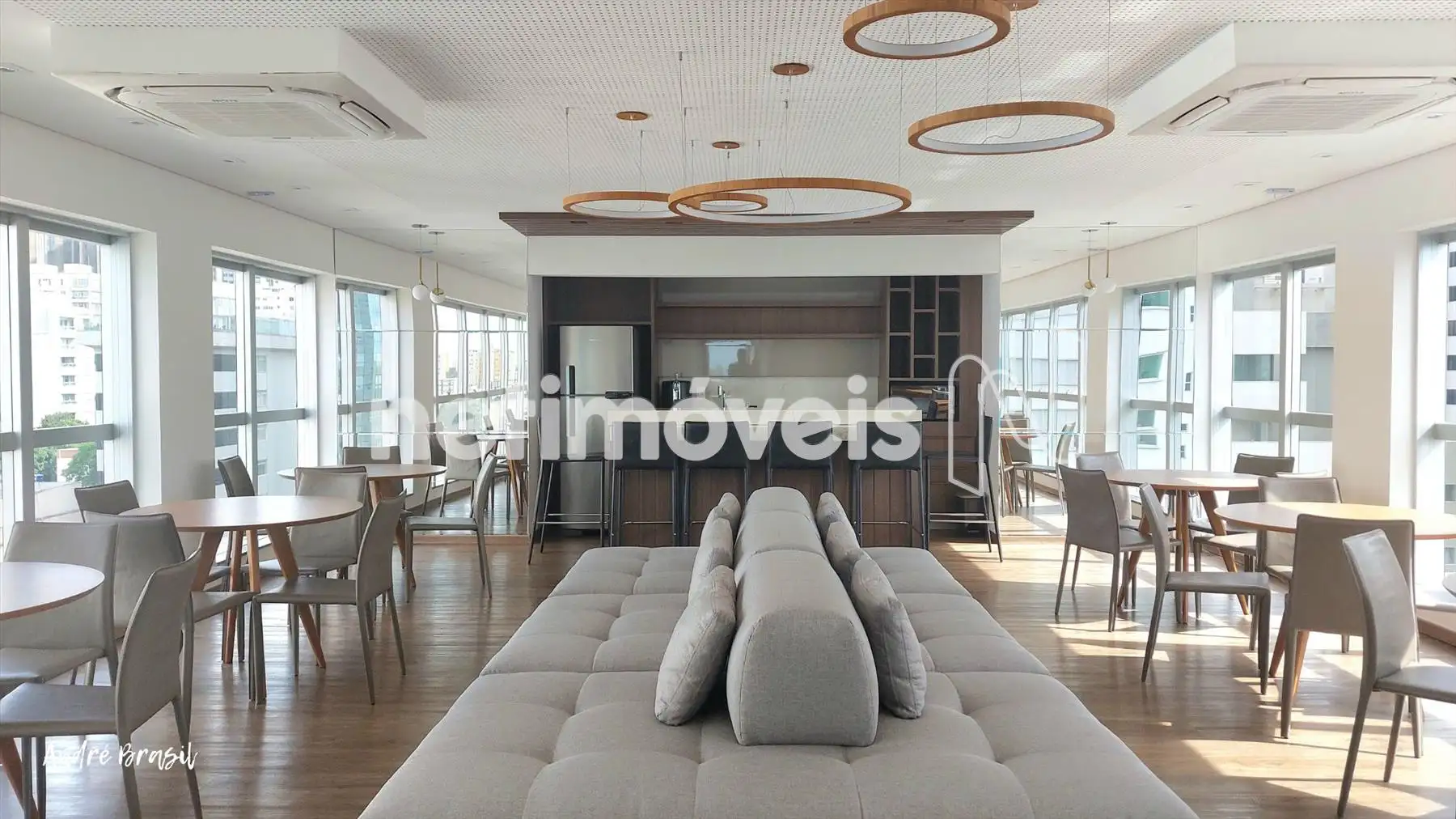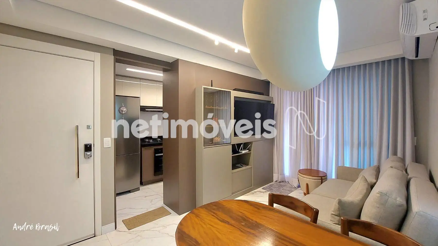 Sala para 2 ambientes com piso em porcelanato e ar condicionado;