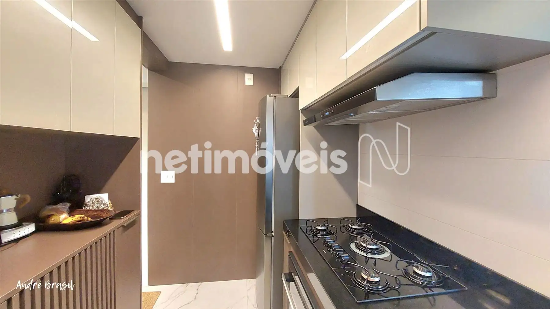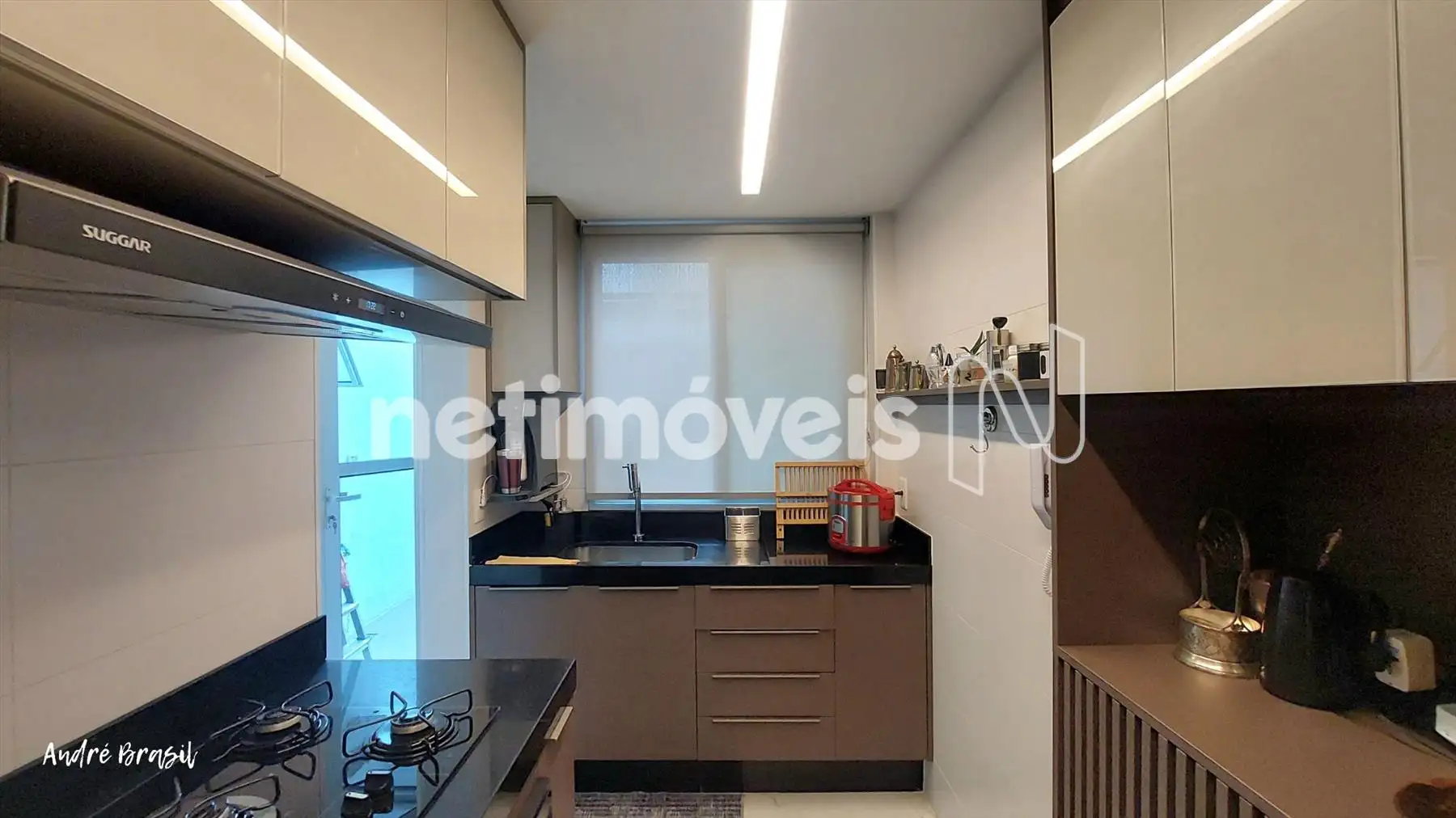 Cozinha com piso em porcelanato, bancadas em granito com armários;