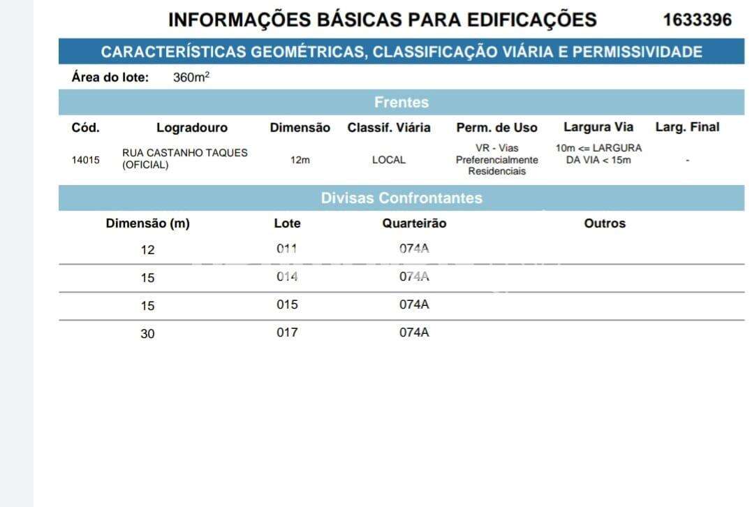 Lote de 360 M², sendo 12 metros de frente e 30 metros lateral , plano, murado