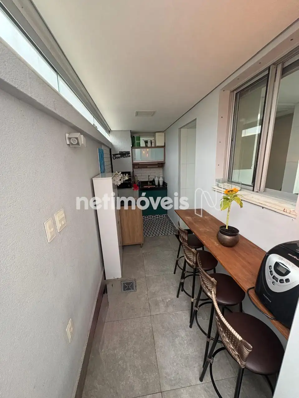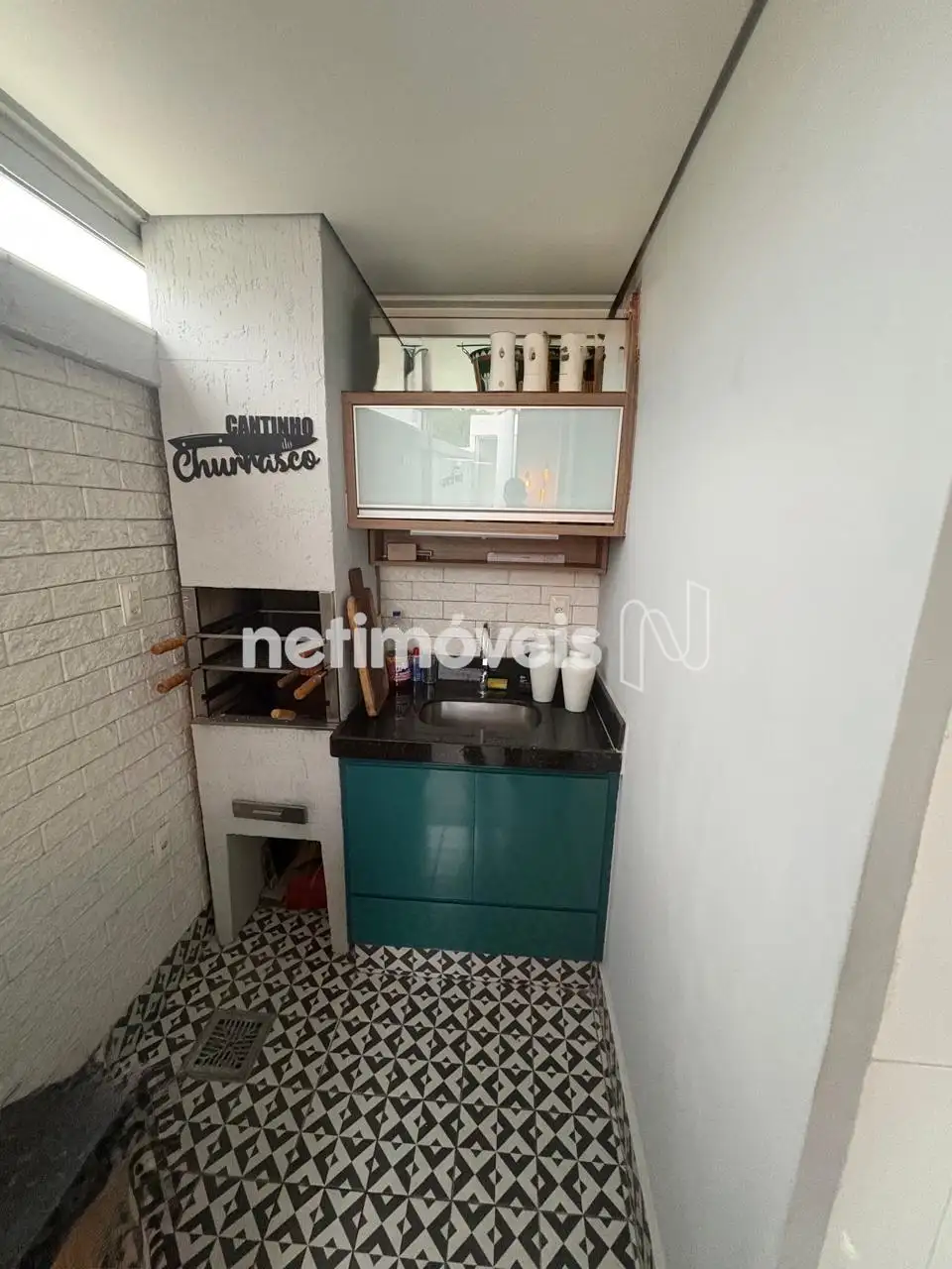 Área externa privativa com aproximadamente 15 m² contendo espaço gourmet com churrasqueira, área de serviço e área descoberta.