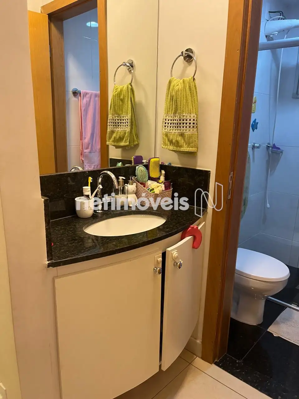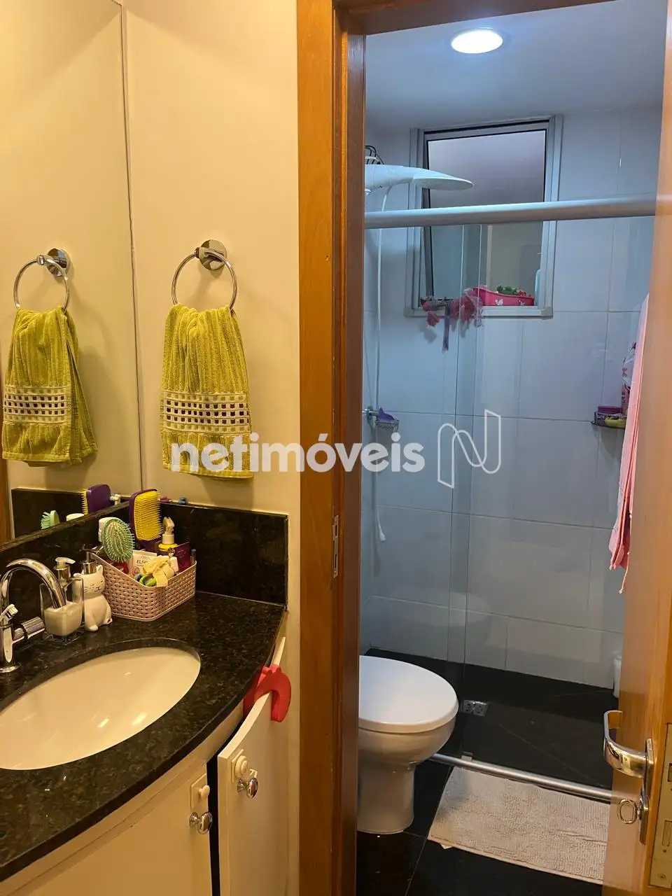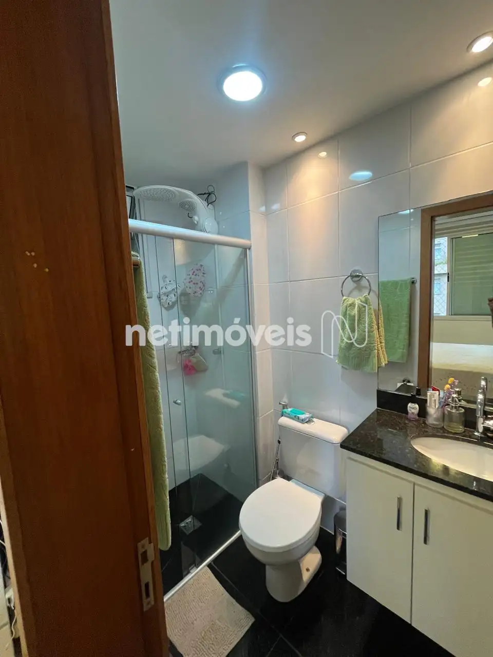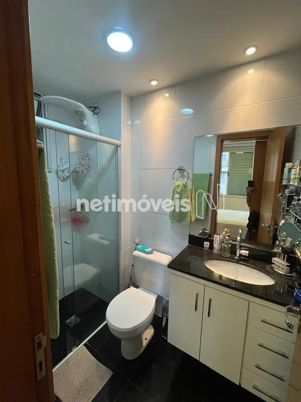 Banho Social e Suíte com bancada em granito, armários, box em vidro.