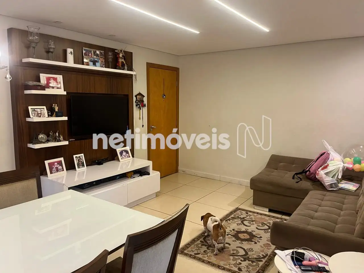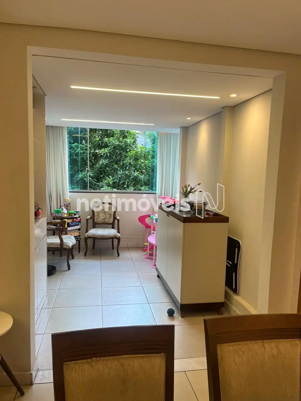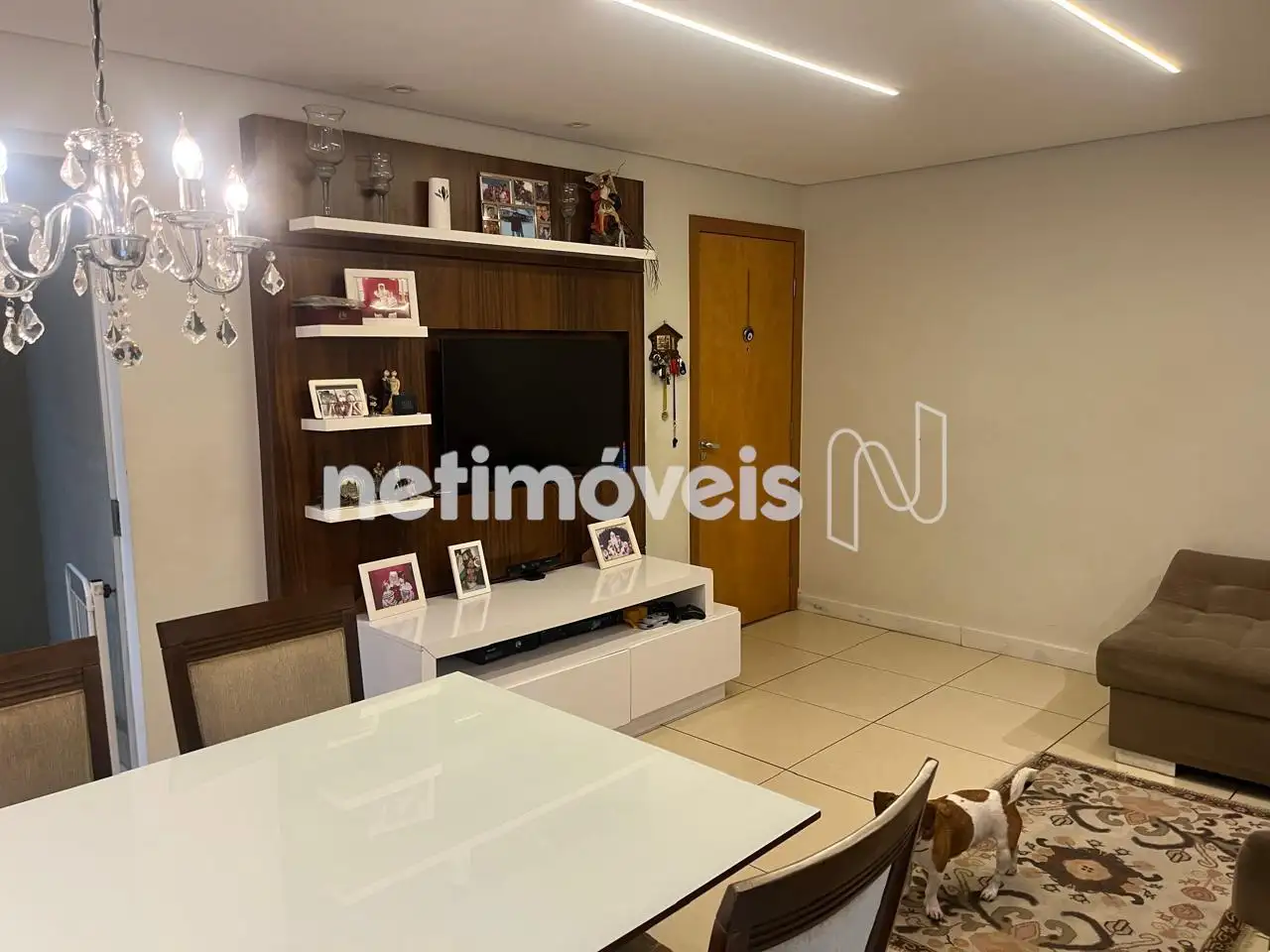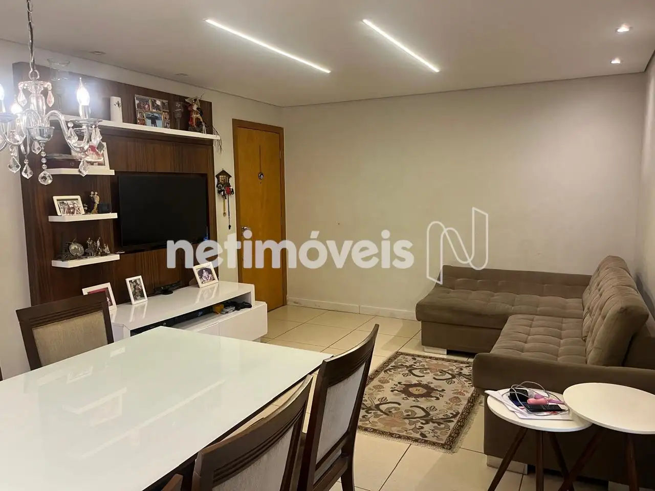 Sala para dois ambientes com teto rebaixado, iluminação embutida, piso em porcelanato. Varanda com cristaleira.