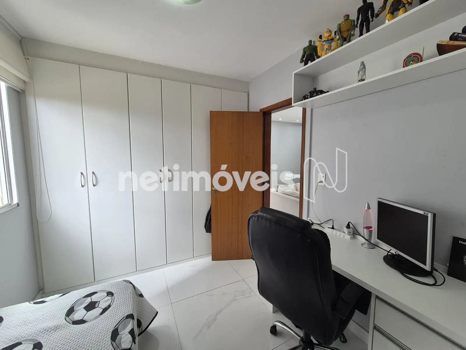 - Quarto amplo de escritório, com piso de porcelanato, janelas com venezianas, armários, cortinas, bancada de madeira